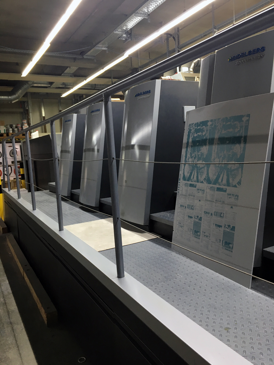 Einige Stunden sind vergangen, die Sonne geht auf und ich starte meinen Weg zur nächsten Etappe. Jetzt wird es laut. Je näher ich den Maschinen komme, desto aufgeregter bin ich. In der großen Halle angekommen, laufen die 3 Off-Set-Drucker schon auf Hochtouren. „Sche-Schick, Sche-Schick, Sche-Schick“ lassen die 6 x 1,50 m langen Drucker im konstanten Rhythmus von sich lauten. Ein bisschen schläfrig wird man davon. Irgendwann ist der vorherige Druck eines Verlages fertig, und meine Zeit ist gekommen. Mit einem Hebel knicken die Drucker (so heißen auch die Angestellten, die sich um mich kümmern) meine Enden um, damit ich mich auf den Walzen in den Maschinen festkrallen kann. Sind die Platten alle richtig eingespannt, holen die Helfer das passende Papier aus dem Lager. Das wird richtig platziert, und der erste Druck vom neuen Programm startet. Am anderen Ende wartet schon der Meister auf mich und zieht ein Exemplar vom bedruckten Stapel heraus. Damit mein Aussehen auch perfekt ist, wird der Druck auf einem speziellen Tisch abgelegt. Dieser ist in bestimmte Zonen aufgeteilt, und der Meister kann hier meine Farben optimieren.
