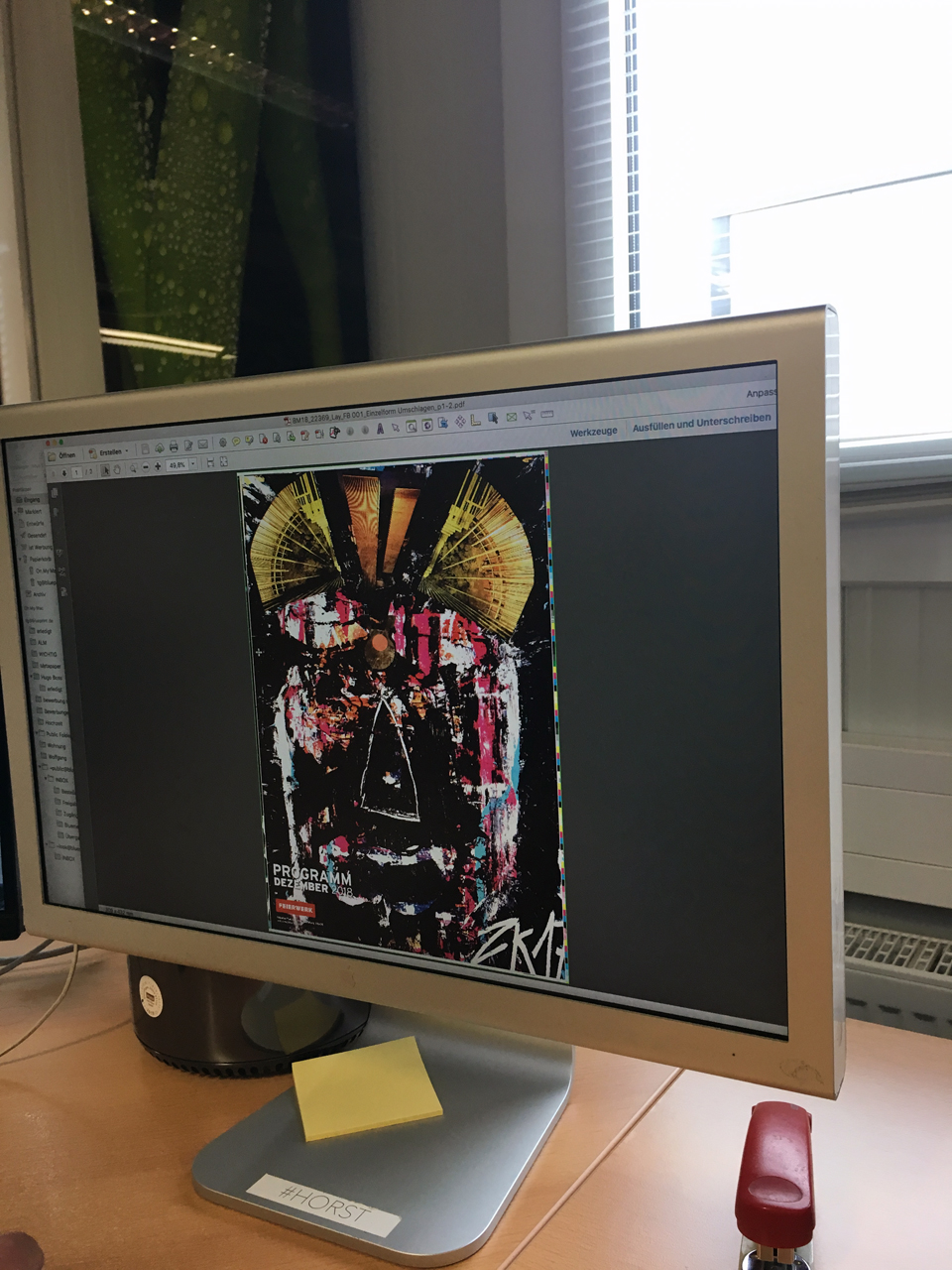 Am Anfang heißt es für die Abteilung Öffentlichkeitsarbeit im Feierwerk: Datenbank checken, Termine sammeln und sämtliche Konzert- und Partyveranstaltungen auflisten. Ist der Monat voll, gehen die Termine aufbereitet weiter an den Grafiker, der das Layout erstellt. Nach einigen Korrekturrunden über die Öffentlichkeitsarbeit, wird eine digitale Version von mir an die Druckerei weitergeleitet. Dort angekommen, bekomme ich eine eigene Mappe. In dieser landet einer meiner älteren Brüder sowie alle Infos zum neuen Auftrag. Sobald alles zusammengestellt ist, wird die Mappe weitergegeben an die Herren der Mediagestaltung. Hier werde ich als Grafik auf die Größe der zu druckenden Flächen angepasst und es wird festgelegt, wie die Drucker mich auf das Papier bringen müssen. Sobald der Gestalter fertig ist, sendet er einen sogenannten „Proof“, eine Art digitalen Probeabzug, an das Feierwerk und dessen Grafiker. Geben diese mein neues Outfit frei, geht’s weiter zur Belichtung.