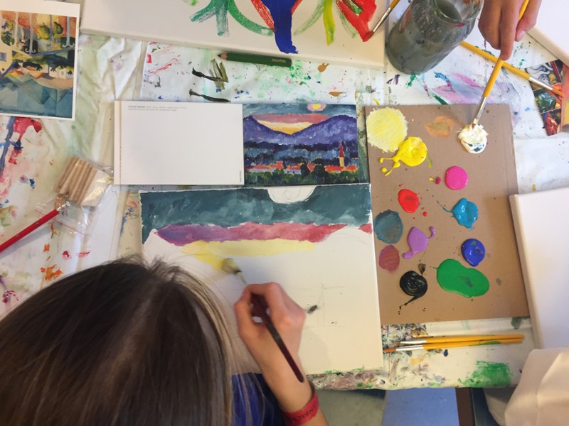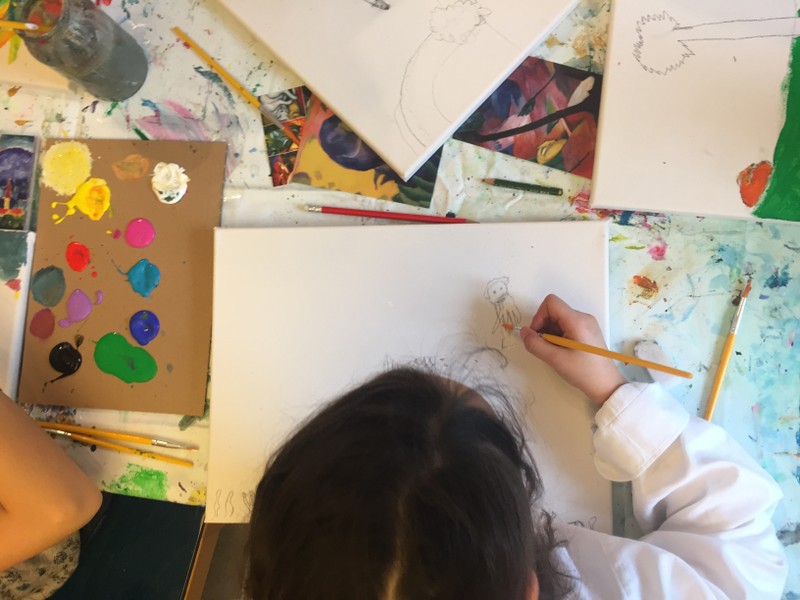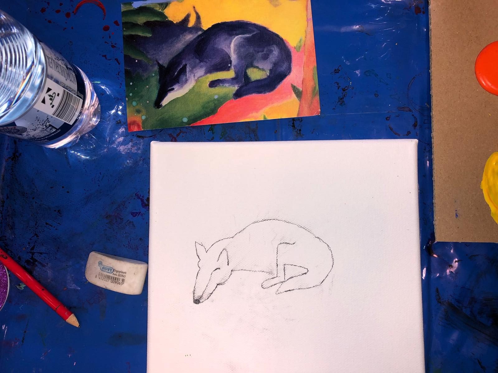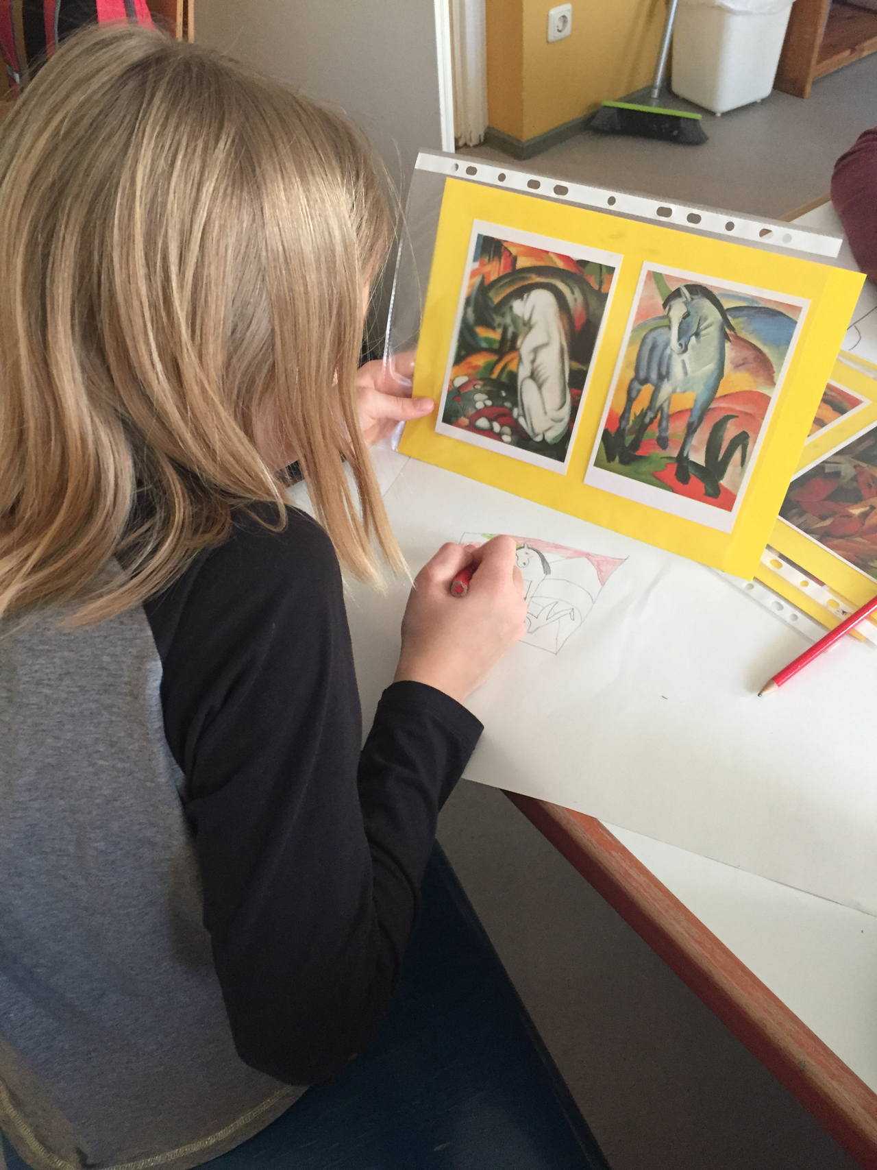 29Am Donnerstag in den Faschingsferien haben sich elf kunstbegeisterte Kinder für einen Besuch im Lenbachhaus und zum anschießenden Acrylmalen bei uns im Feierwerk Dschungelpalast zusammengefunden. Zum Einstieg haben wir verschiedenste Bücher und Ausmalbilder von Franz Marc für die Kinder bereit gelegt. So konnten sie sich schon einmal Inspirationen für den Workshop am Nachmittag holen. Mit Buntstiften wurden dann Ausmal- und Ergänzungsbilder gemalt. Das Blaue Pferd zum weiter Malen kam bei den Kindern ganz besonders gut an. Aber auch der Tiger von Marc war sehr beliebt. Zugleich konnten sie sich auch schon Gedanken über ihre Motive für die eigene Leinwand am Nachmittag machen und auf Papier vorskizzieren.