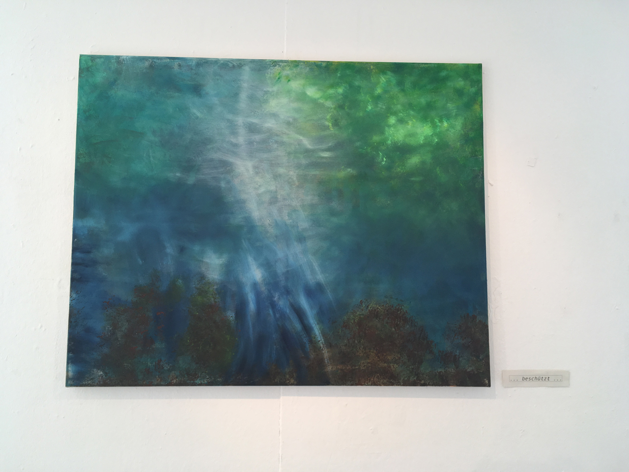 Jedes Bild ist viel mehr als das jeweils Sichtbare. Unter der obersten Schicht verbergen sich nämlich noch viele weitere. Die Künstlerin Mila Mönlam hat am Anfang eines Bildes zwar eine Idee davon, was sie auf die Leinwand bringen möchte. Das Endergebnis muss dann aber nicht mehr viel damit zu tun haben. Die Stellen des Bildes, die sie mag, baut sie weiter aus. Beim Malen verändert sie das Werk also fortwährend bis sie schließlich das Gefühl hat, dass es fertig ist. Bei dem Bild „…beschützt…“ war das ein sehr langwieriger, nervenaufreibender Prozess. Dabei hat sie nicht nur mit Acryl-, sondern auch mit Ölfarben gearbeitet. Zwischendrin hat die Künstlerin die Leinwand sogar abgeduscht, bis sie letztendlich zufrieden damit war. Sie fühlte sich befreit. Ich sehe auf dem Bild eine Unterwasserwelt, in der Mitte fällt ein Sonnenstrahl ins Wasser. Es wirkt auf mich sehr hoffnungsvoll.