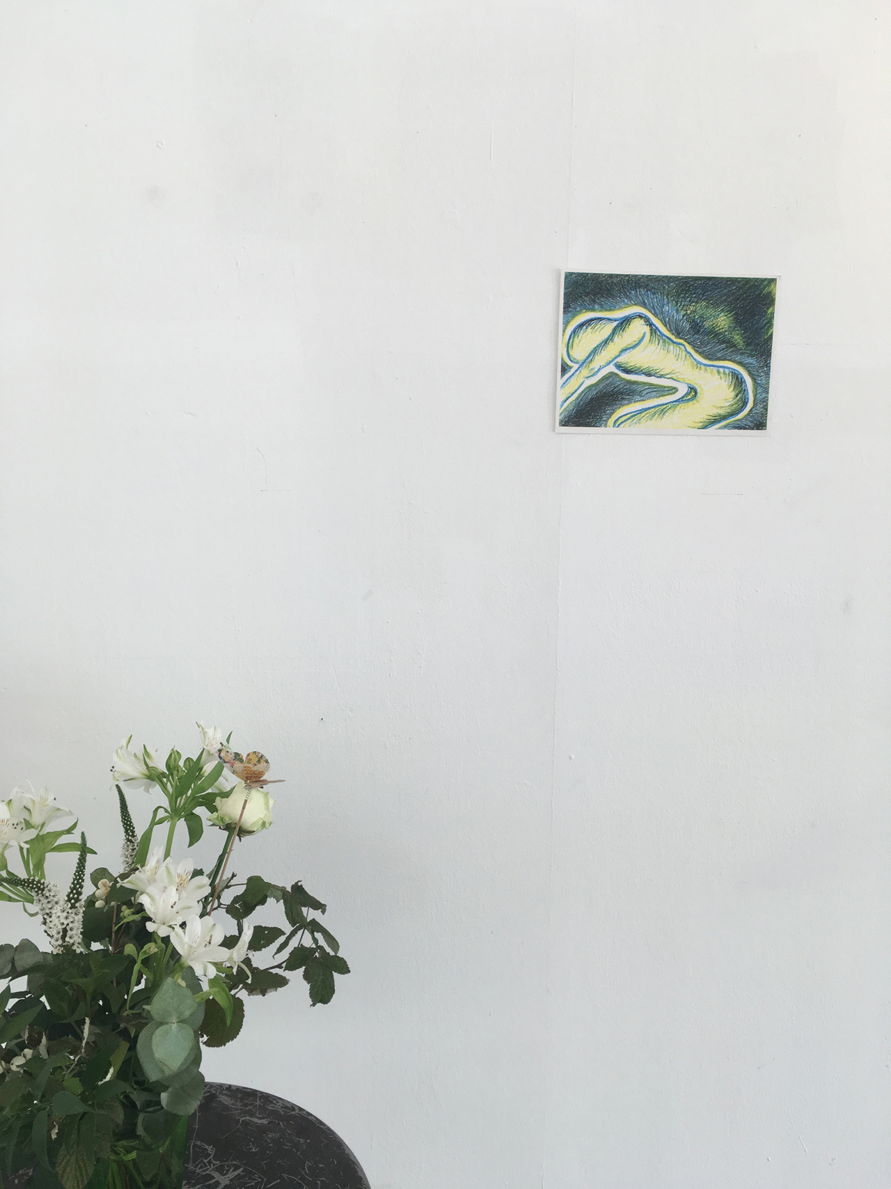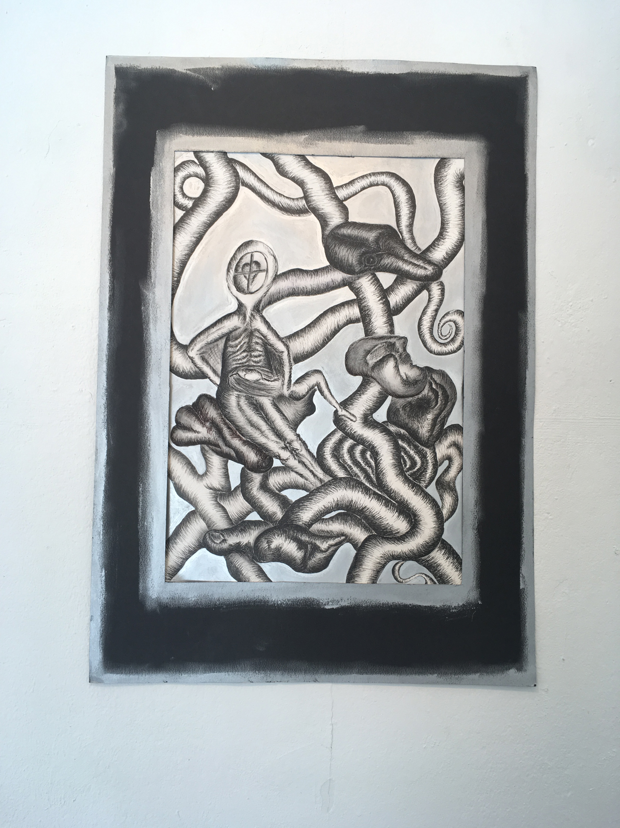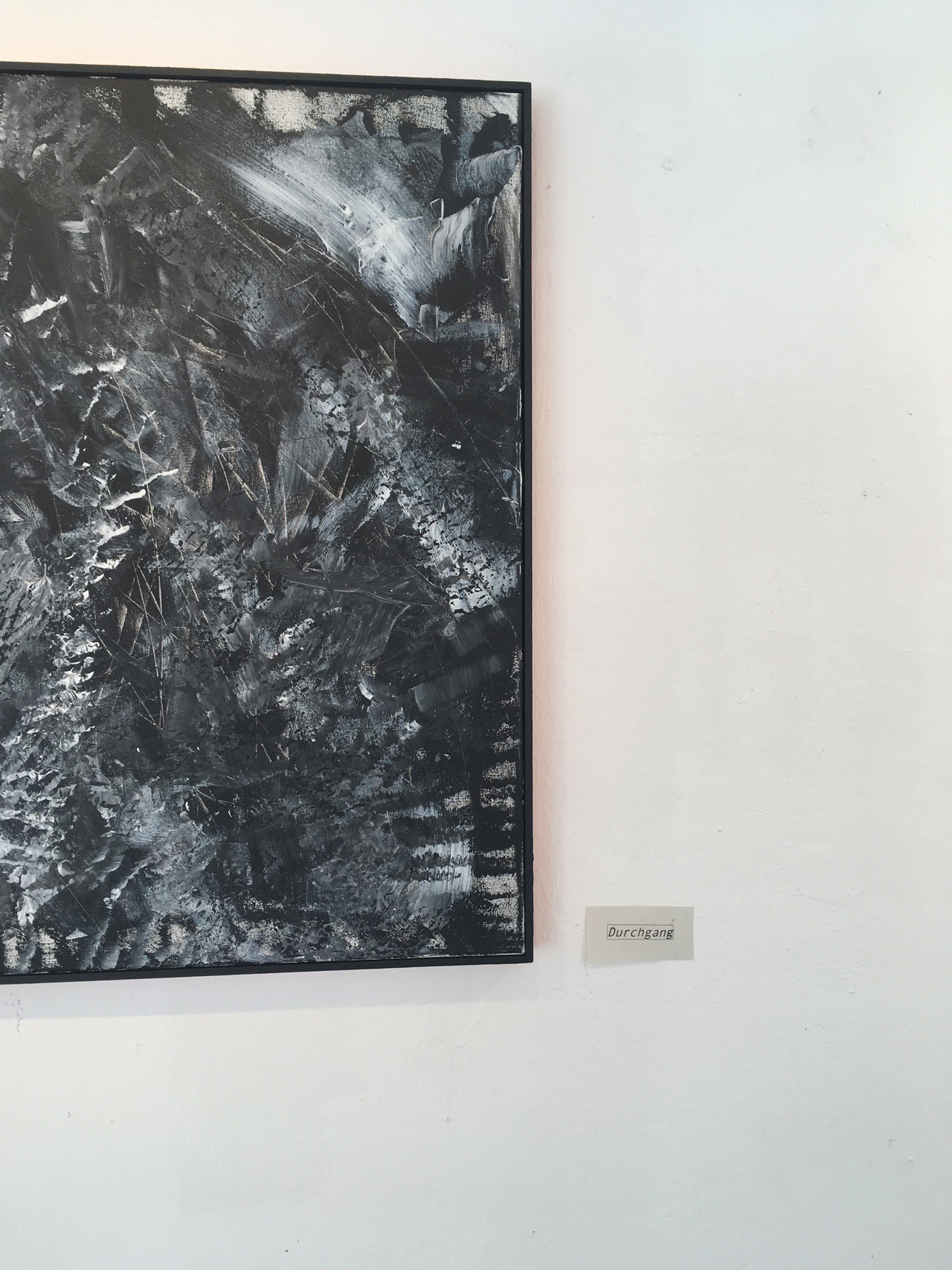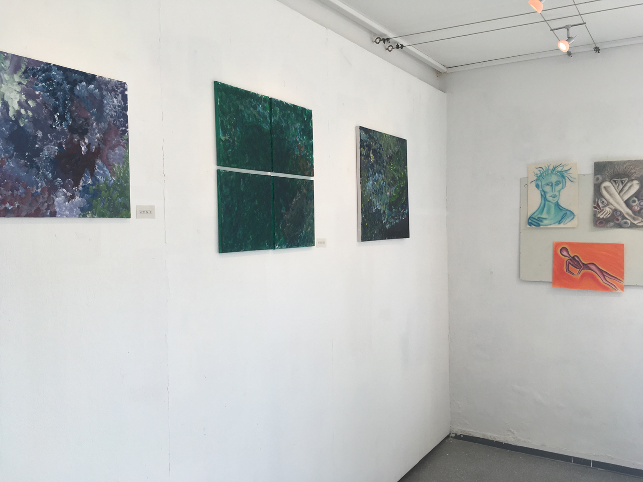 Ich nahm mir von Anfang an viel Zeit dafür, die einzelnen Kunstwerke zu betrachten und sie auf mich wirken zu lassen. Viele Gemälde waren in Blau- und Grüntönen gehalten. Sie erinnerten mich an Natur, Wasser, Rauschen, Landschaften und Leben. Einige Werke stachen allerdings heraus. Sei es aufgrund der Farbgebung oder den abgebildeten Motiven. Besonders aufgefallen ist mir dabei ein Bild, das in schwarz, weiß und grau gehalten war. Wie Mila mir nachher erzählte, verwendete sie für das Bild unter anderem Metallpaste, um den silbrigen Hintergrund zu gestalten. Zu sehen sind gedärmartige Wesen. Ich meine außerdem einen Daumen darin zu entdecken. Die alienartigen Skelette ekeln und faszinieren mich zugleich.