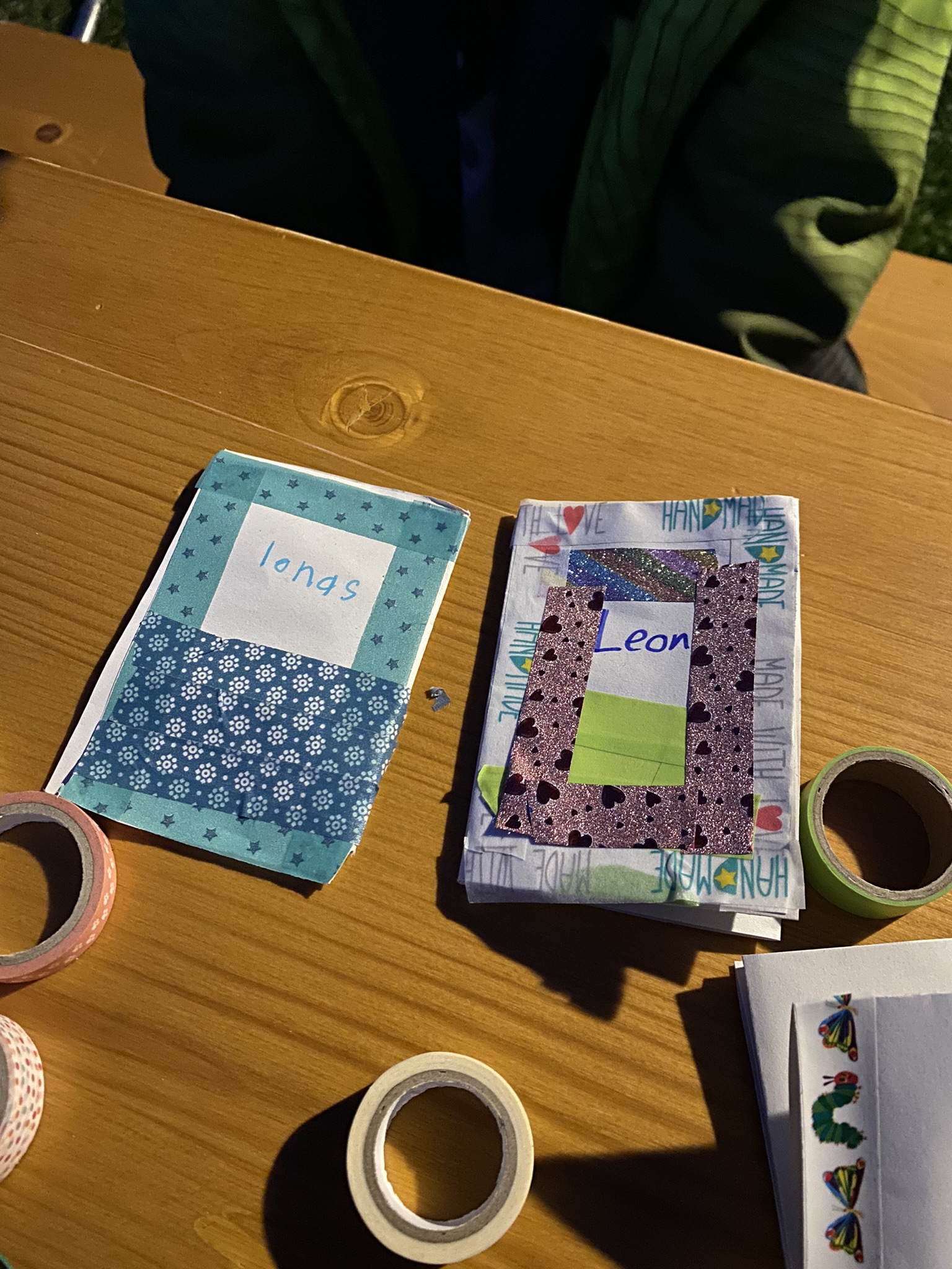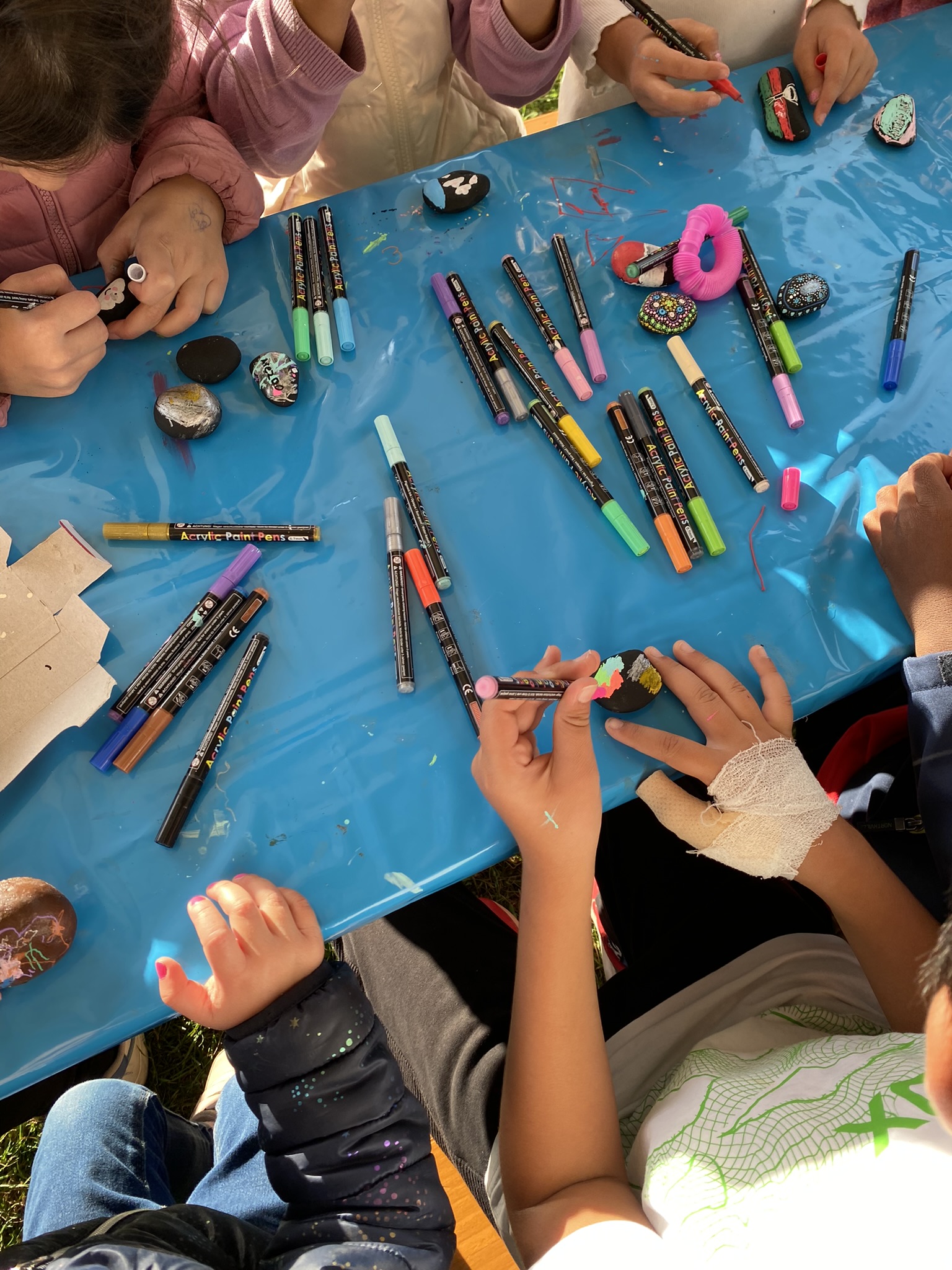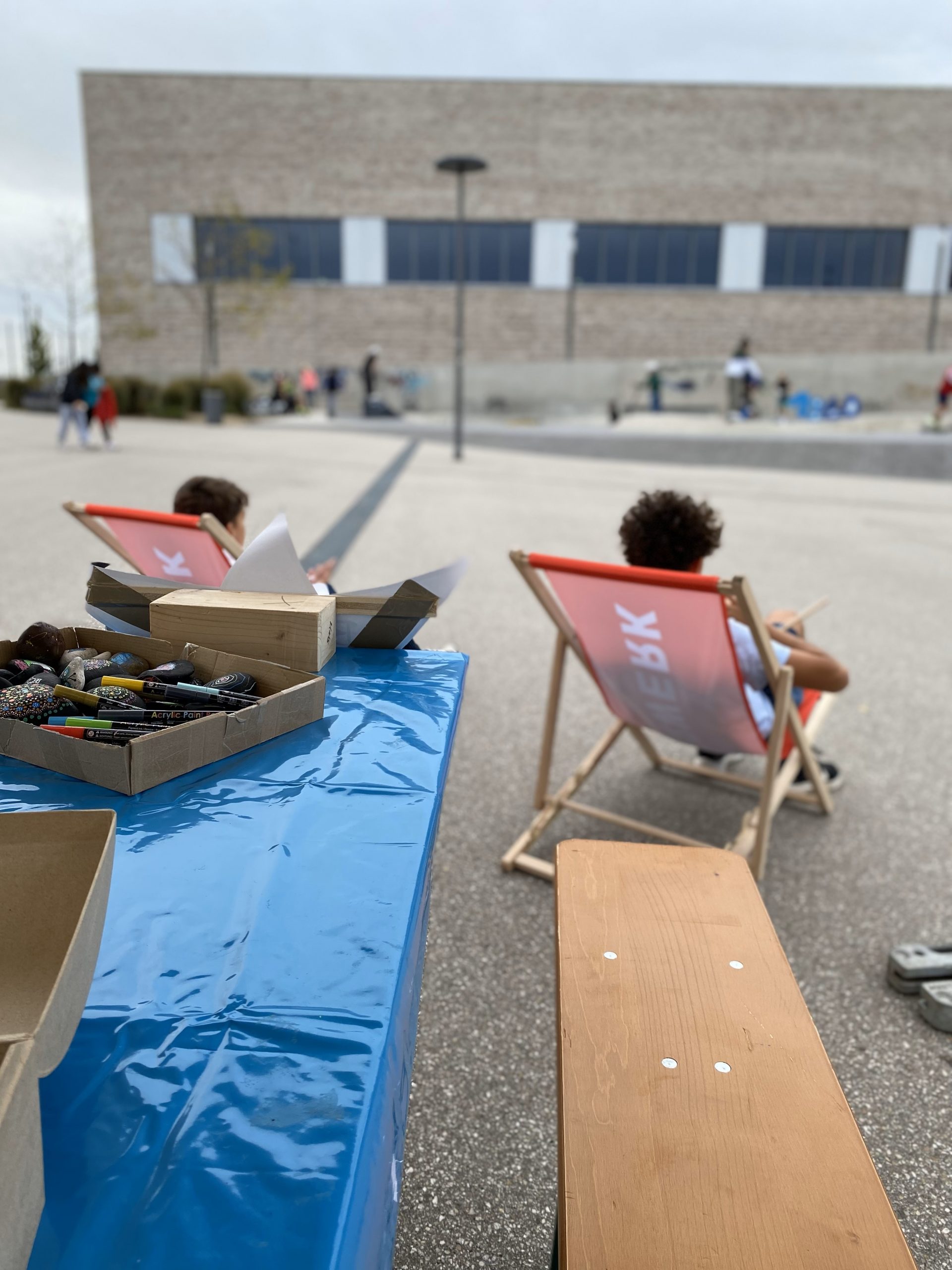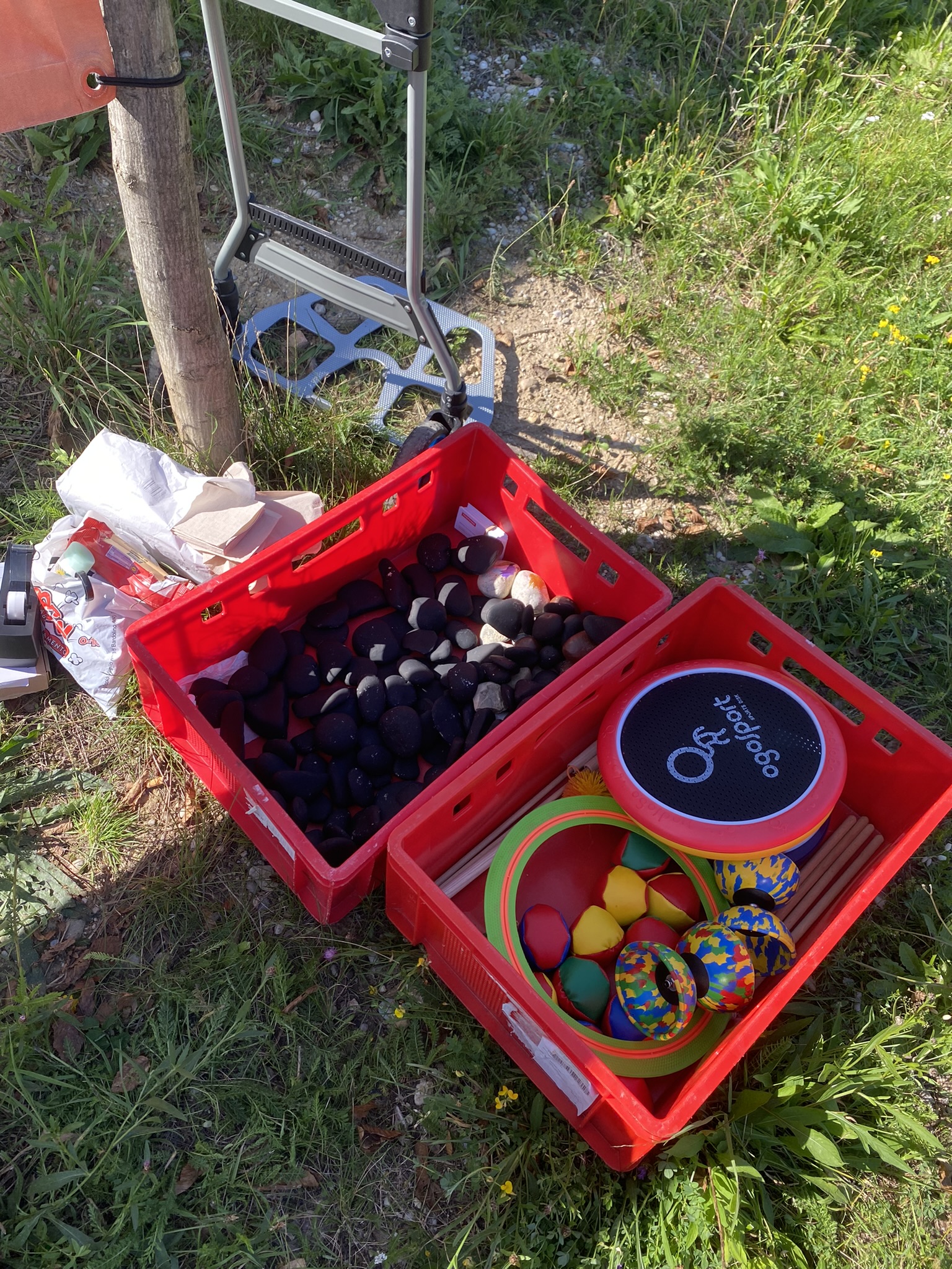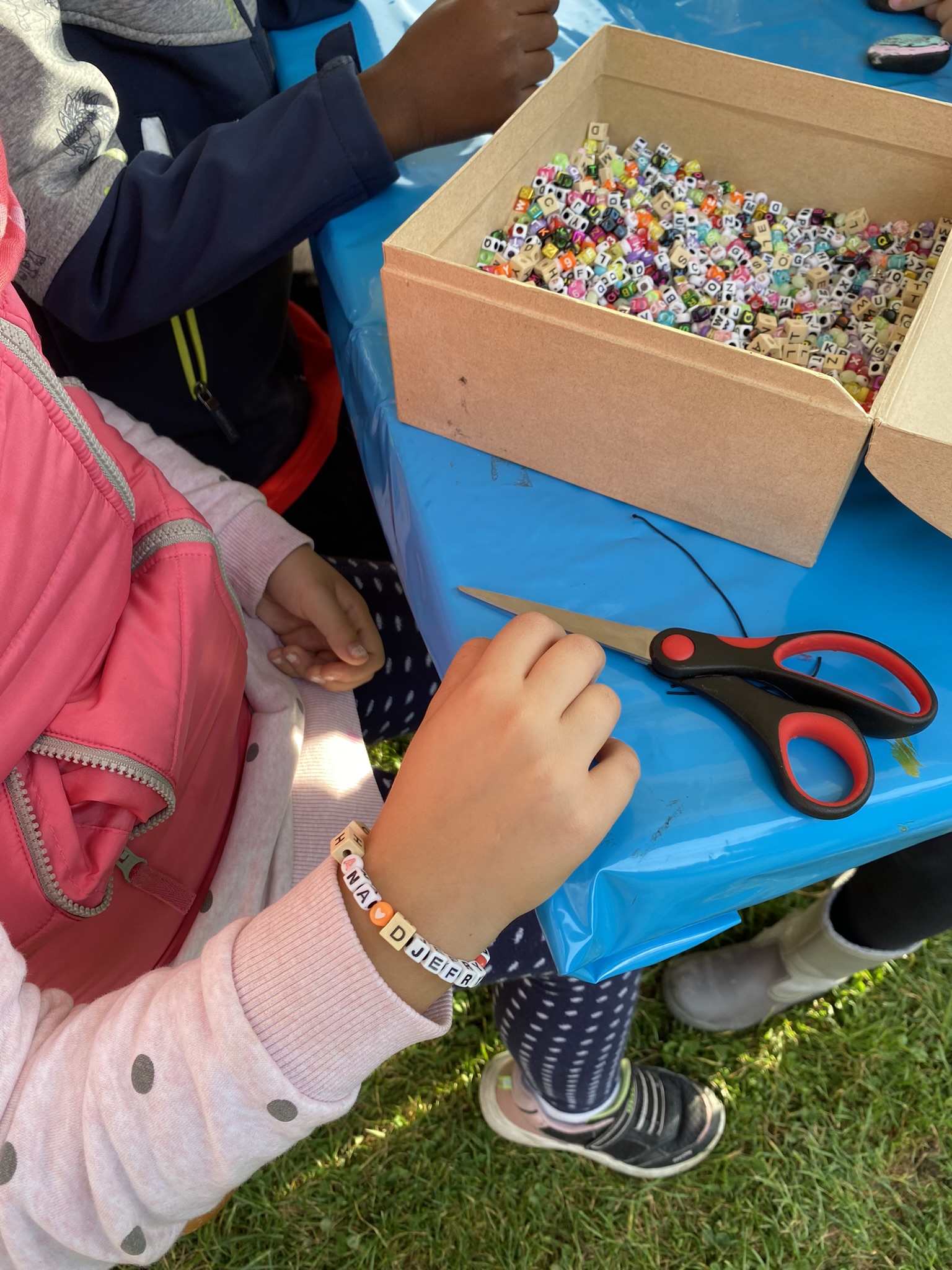 Nach den Sommerferien ging es dann so richtig los mit den mobilen Aktionen und ich habe mich auf Erkundungstour durch Freiham begeben. Wichtigster Begleiter war hierbei unser roter Ford Transit, der nun zwar nicht mehr als Tourbus für Bands im Einsatz sein kann, mir dafür aber mit Biergarnituren, Sport-Equipment und Kreativ-Utensilien ausgestattet ein prima Lager für unterwegs bot. Und dank Max‘ genialer „Biergarnituren-mit-der-Sackkarre-transportieren“-Idee war auch der Weg vom Bus ins Grünband gesichert. Dort stand ich dann diverse Male, anfänglich alleine und bald mit tatkräftiger Unterstützung von unserer Übungsleiterin Tina, und wir haben mit den Kids in Freiham gesammelte Steine bemalt, Buchstaben-Armbänder gefädelt, Notizbücher gestaltet, gekickt und Frisbee gespielt.