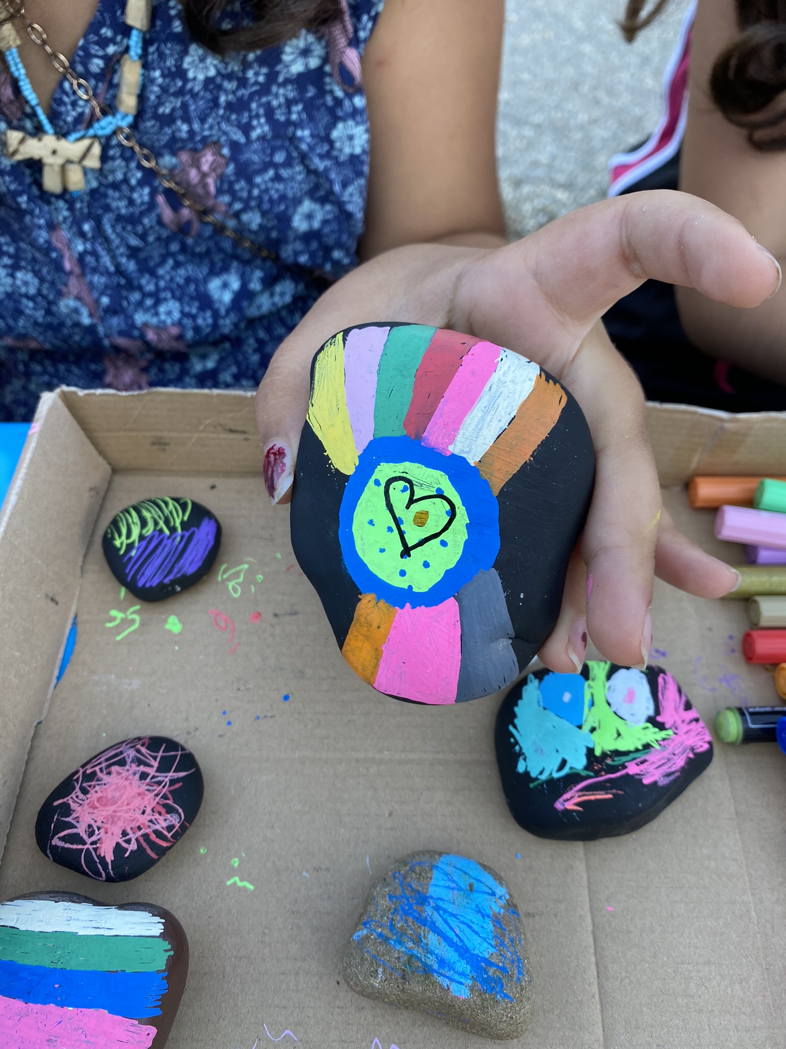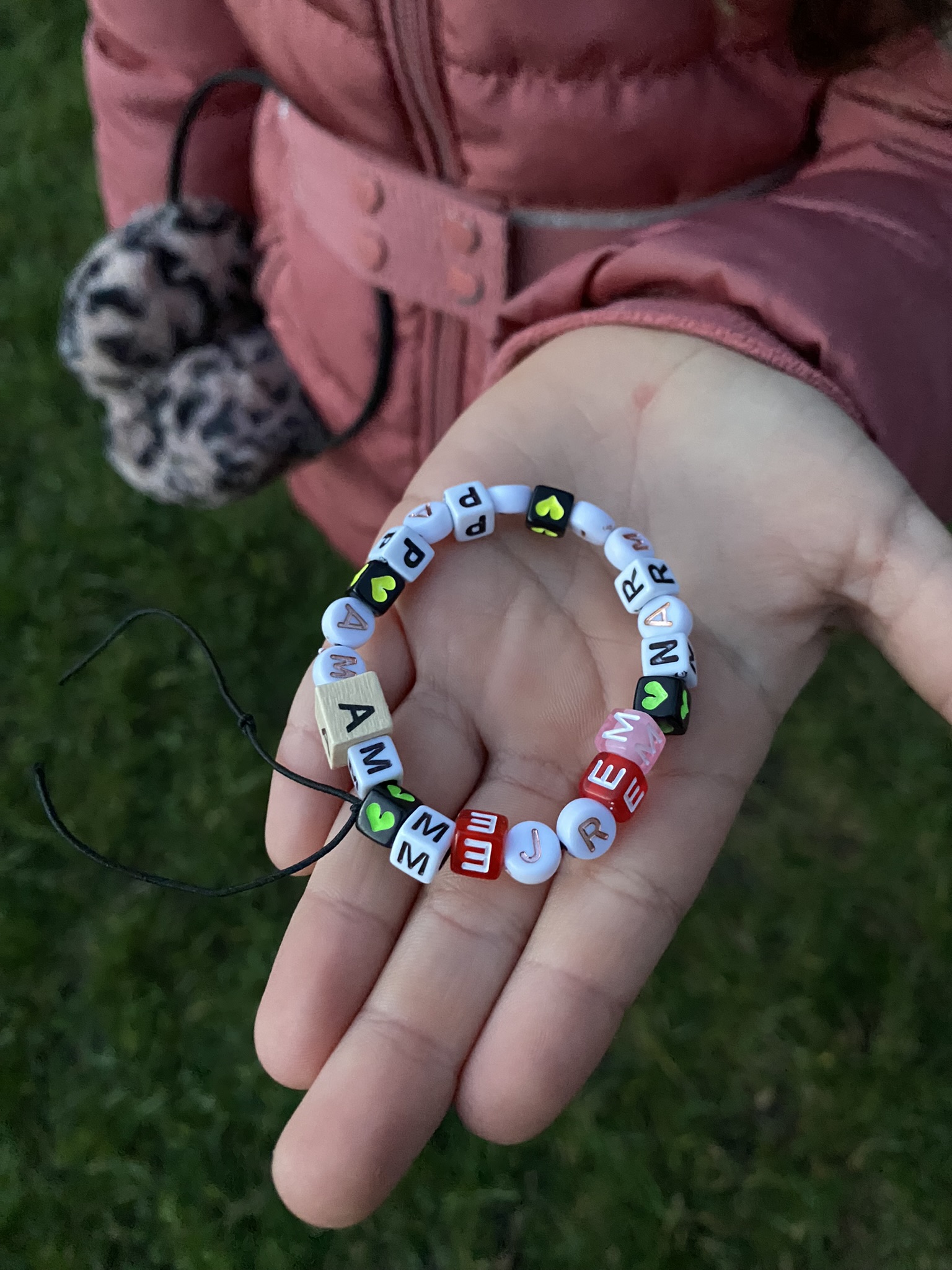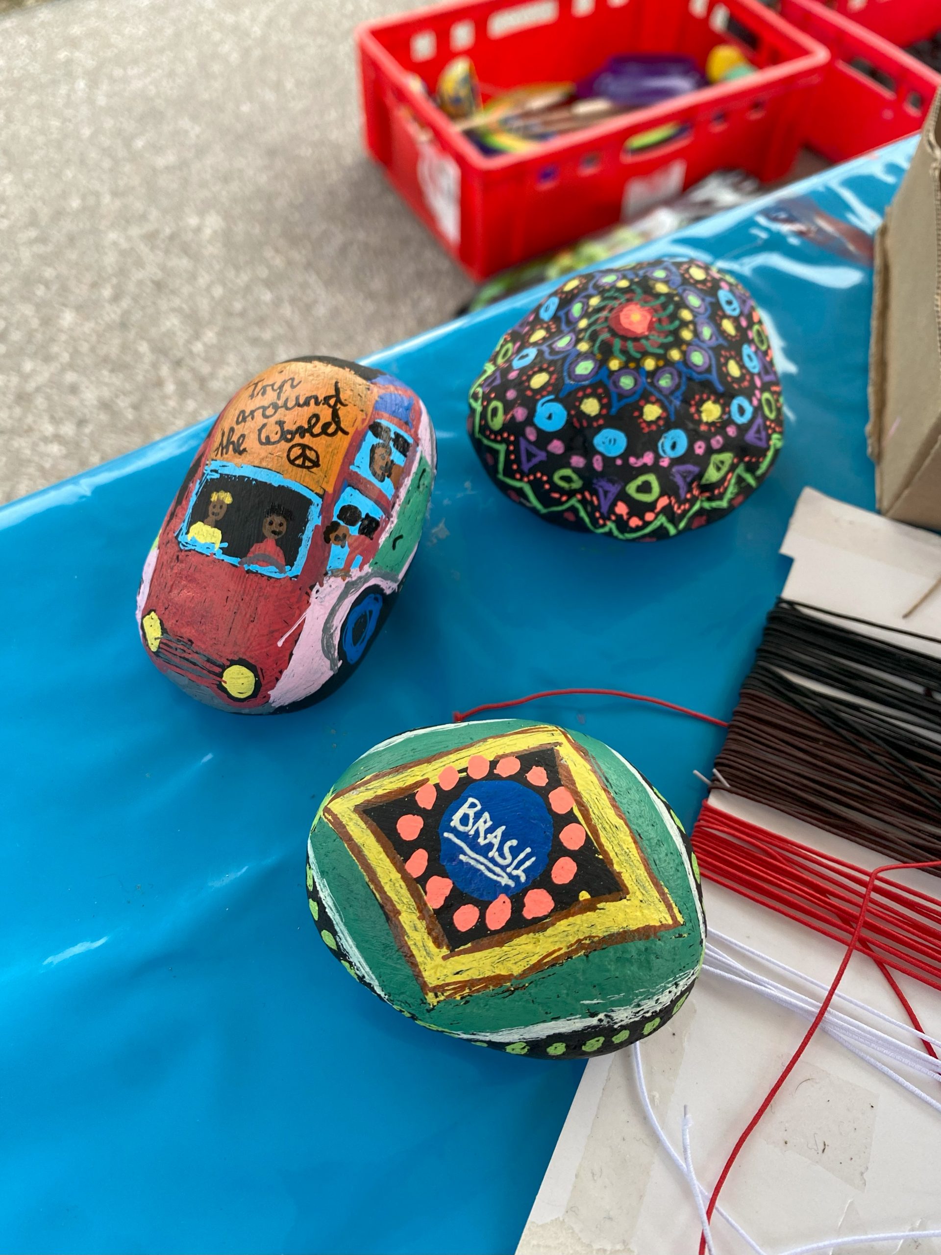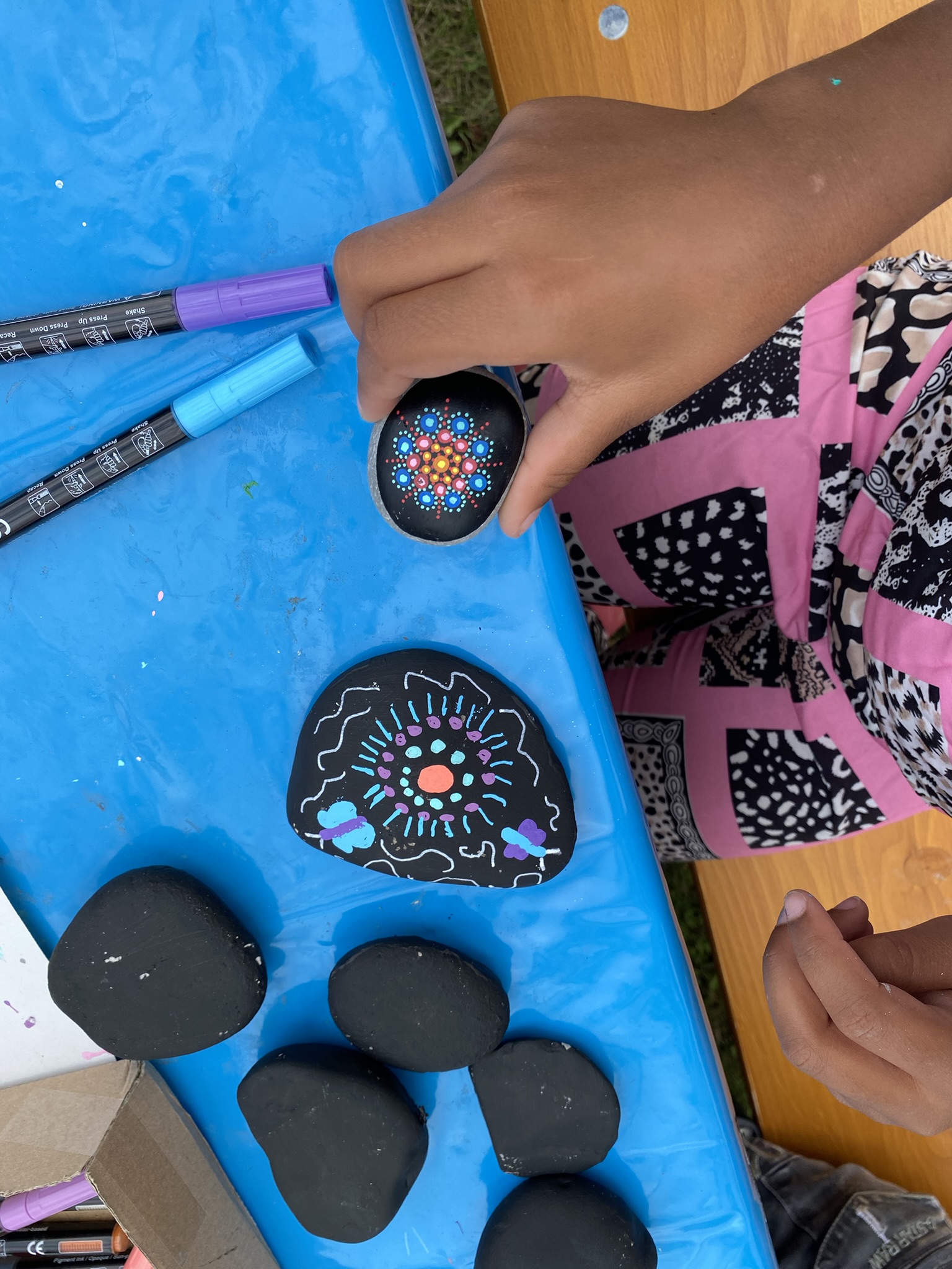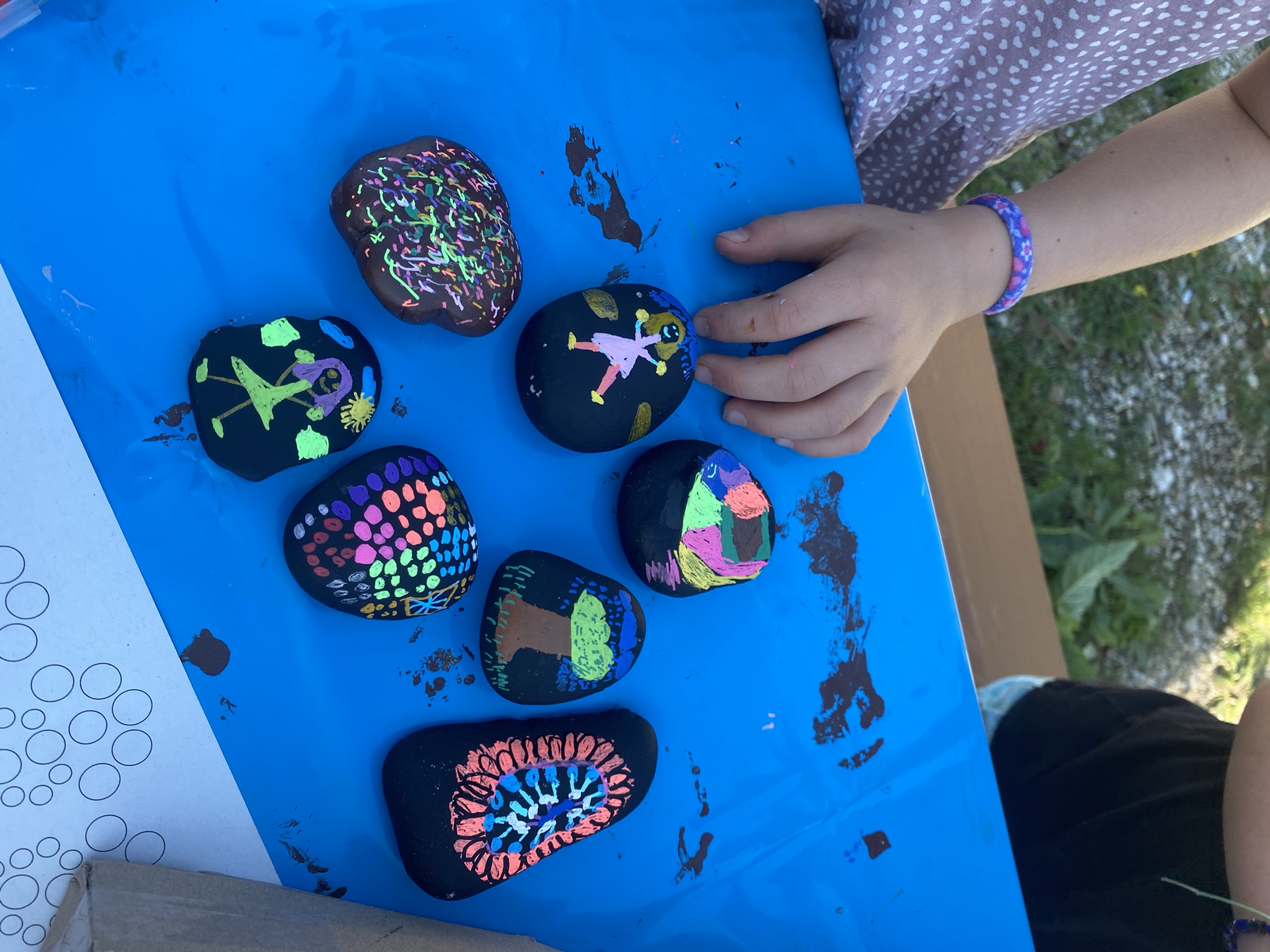 Nach den Sommerferien ging es dann so richtig los mit den mobilen Aktionen und ich habe mich auf Erkundungstour durch Freiham begeben. Wichtigster Begleiter war hierbei unser roter Ford Transit, der nun zwar nicht mehr als Tourbus für Bands im Einsatz sein kann, mir dafür aber mit Biergarnituren, Sport-Equipment und Kreativ-Utensilien ausgestattet ein prima Lager für unterwegs bot. Und dank Max‘ genialer „Biergarnituren-mit-der-Sackkarre-transportieren“-Idee war auch der Weg vom Bus ins Grünband gesichert. Dort stand ich dann diverse Male, anfänglich alleine und bald mit tatkräftiger Unterstützung von unserer Übungsleiterin Tina, und wir haben mit den Kids in Freiham gesammelte Steine bemalt, Buchstaben-Armbänder gefädelt, Notizbücher gestaltet, gekickt und Frisbee gespielt.