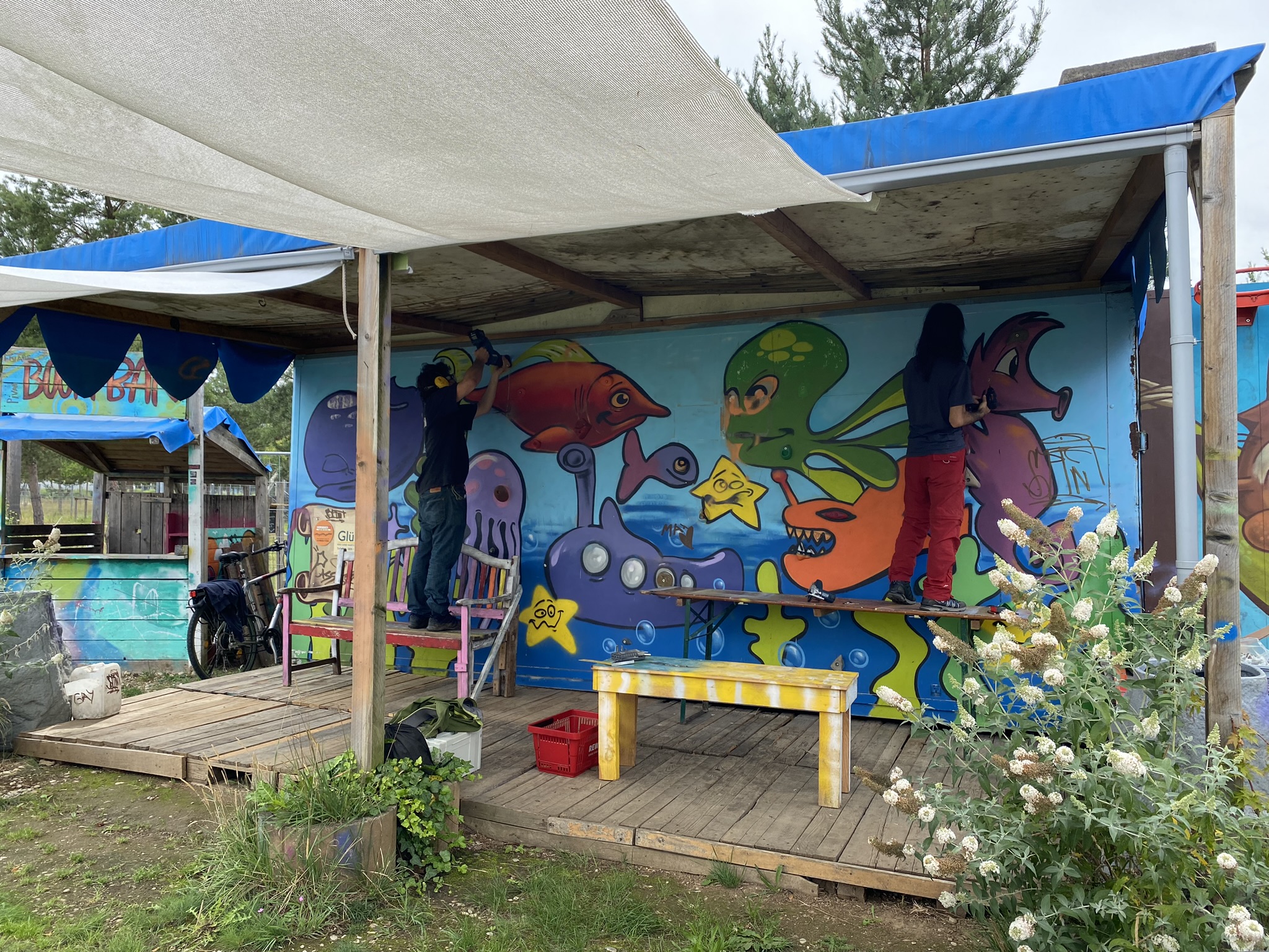 In den ersten Tagen habe ich alles Mögliche gelernt: Wie man eine Holztreppe baut, wie viele Bälle in ein Container-Bällebad passen, wo ich den Wasserkanister fürs Pump-Waschbecken auffülle und vor allem, was es heißt, den ganzen Tag draußen zu arbeiten. Eine krasse Umstellung zu meinem Job davor, in dem ich ja fast immer am Laptop und am Schreibtisch saß. Highlight-Momente im Sommer waren definitiv das große BoomBox-Sommerfest und unzählige „am-Lagerfeuer-vegane-Würste-grillen“-Momente mit den Kids aus der Geflüchtetenunterkunft von nebenan. Mittlerweile ist die BoomBox vom KJR an den Feierwerk e.V. übergeben worden, und wir sind total happy, sie und vor allem auch Max an Feierwerk-Bord zu haben.