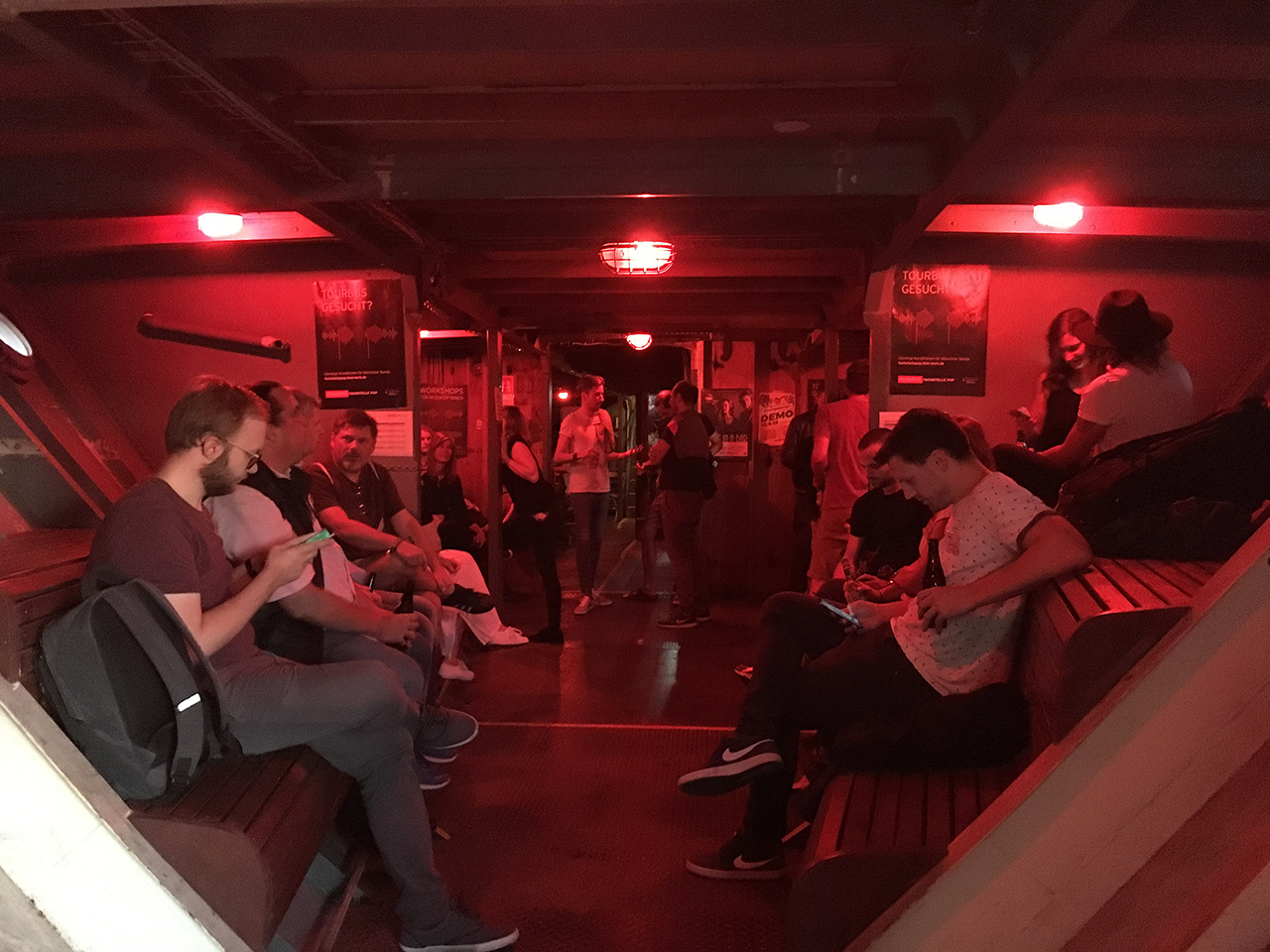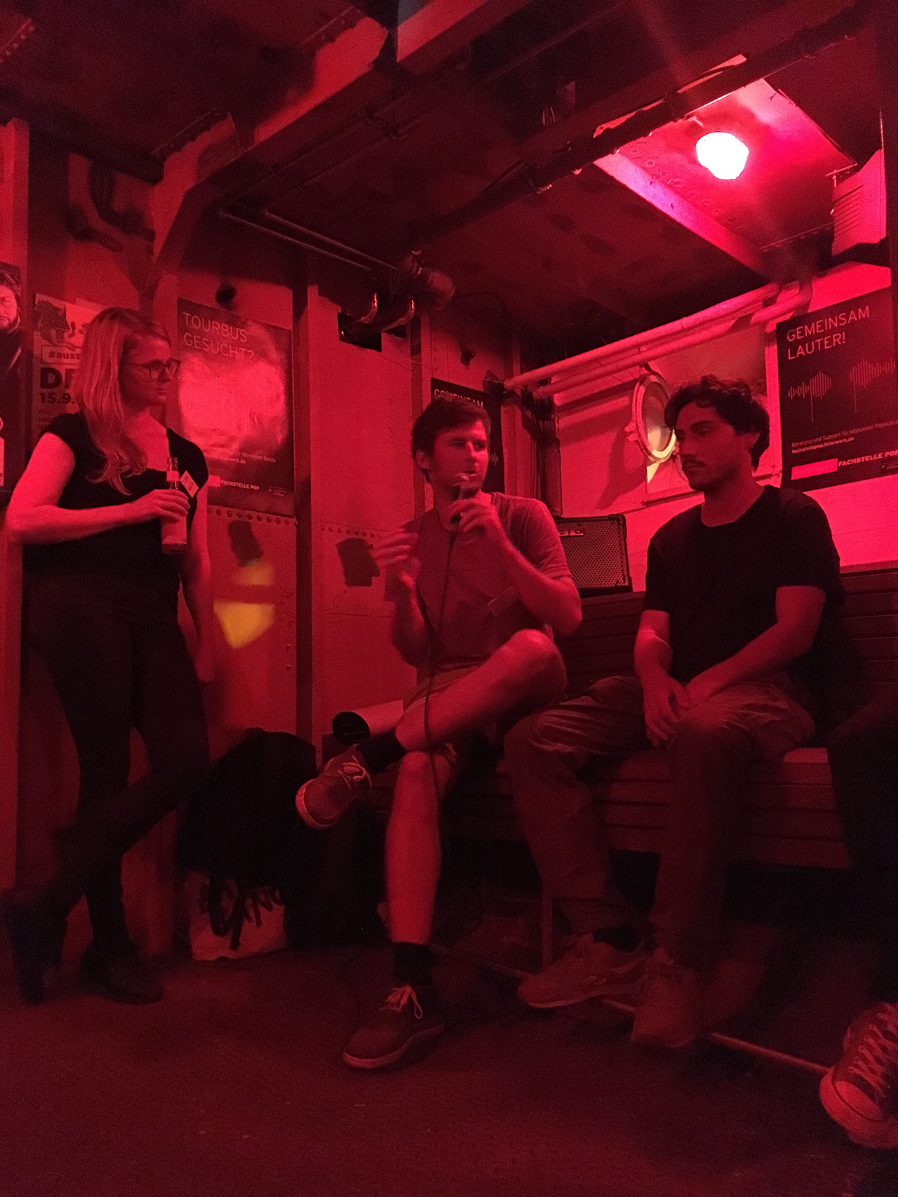 Bereits als ich die Stufen zum Schiff hinaufsteige, entdecke ich einige bekannte Gesichter. Kolleg*innen von der IN München, aus dem Harry Klein, von PULS und viele andere haben ihren Weg zum Cheers gefunden. Kurze Zeit später sitzen wir auf dem Boden des Maschinenraums des Schiffs und hängen gebannt an den Lippen von Daniel Hahn, Mitglied vom Wannda e.V. und Macher dieses Projekts: „Die Utting ist eine Zwischennutzung auf fünf Jahre beschränkt. Anderthalb Jahre haben wir schon aufgebaut. Und wir müssen ja auch noch Zeit einplanen für den Abbau, der nicht unbedingt unaufwändiger ist“, erzählt er. „In spätestens drei Jahren müssen wir anfangen, wieder abzubauen. Das Ganze wird auch nicht abgerissen, sondern wir müssen alles wieder zurück bauen. Bedeutet, die Erde wieder aufmachen und alle Leitungen und Kanäle für Strom und Wasser wieder herausholen. Gerade nach hinten raus ist so ein Zwischennutzungsprojekt dann doch nochmal sehr aufwändig.“