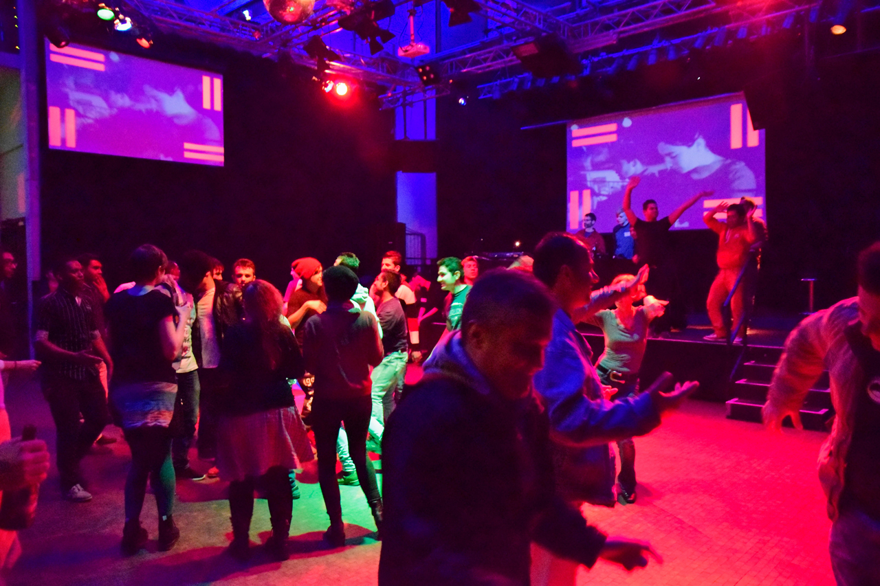 Als Ende 2015 dann neben dem Feierwerk eine Leichtbauhalle für ca. 150 Geflüchtete gebaut wurde, bot sich die Gelegenheit, aus dieser Idee einen praktischen Ansatz zu entwickeln. Mit unseren neuen Freunden aus der Nachbarschaft starteten wir einen Testlauf, der uns sofort begeisterte: Plötzlich lief Musik aus aller Welt, die wir so selbst nicht kannten, dazu verschiedenste Tanzstile. Und vor allem: endlich einmal einen Abend lang fast ausschließlich glückliche Gesichter.