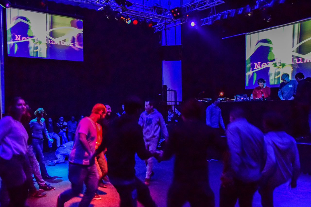 Aber wie funktioniert das Ganze? Wir geben Nummern aus (wie bei einer Karaoke-Party) und unsere anwesenden VJs vom Projekt tps nostromo bauen die anstehenden Nummern in ihre Visuals ein. Am DJ-Pult stehen Profis, die Lautstärken angleichen und Übergänge generieren, sodass die krassen musikalischen Wechsel nicht auch noch durch Störgeräusche oder Pausen verstärkt werden.
