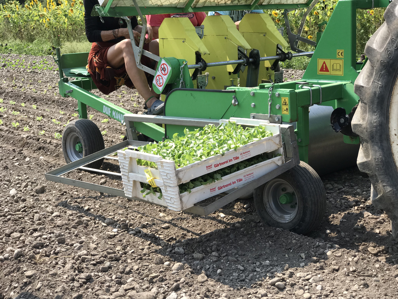 Weiter geht’s zu unserem eigentlichen Reiseziel…tataaaa…der Salat. Dieser wird gerade frisch eingepflanzt und wir müssen nur dem Traktor-Getuckel folgen, um mehr zu erfahren. Was macht er, woher kommt er und wohin geht er eigentlich der Salat hier am Amperhof? 2-3 Wochen wächst er erstmal in einer darauf spezialisierten Bio-Gärtnerei heran, bevor er dann auf den Feldern des Amperhofs weiter gedeihen darf. Aber nur solange bis er die Größe eines runden Kopfes erreicht, das sogenannte Jugendstadium. Dann geht es auch unserem Bio Salat an Kopf und Kragen. Ein gutes halbes Jahr ist der Salatanbau übrigens möglich. Von Mitte Juni bis in den Oktober hinein wird gesät, gewachsen und geerntet.