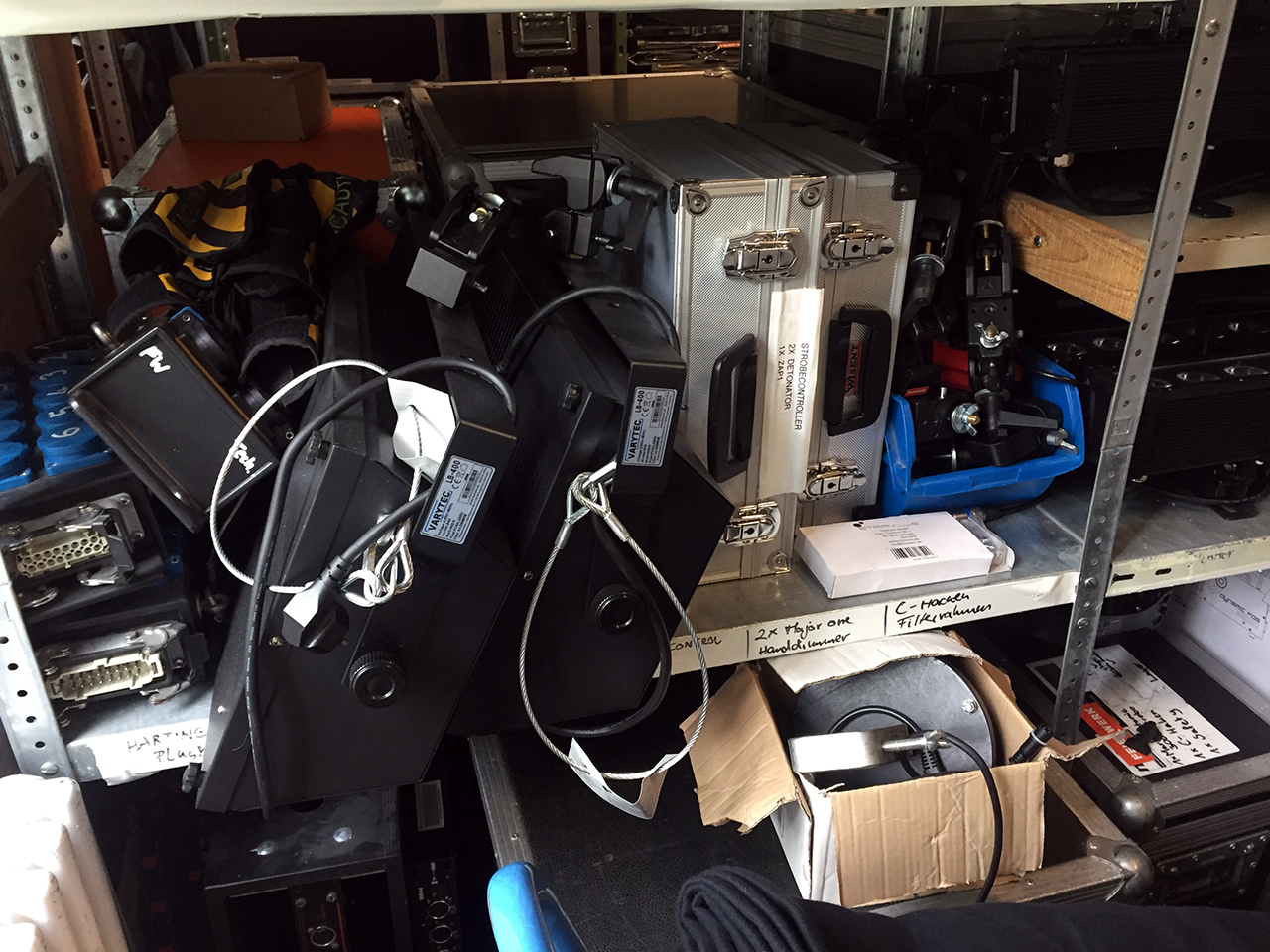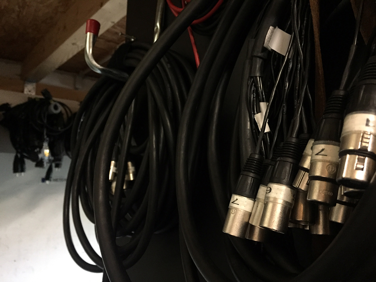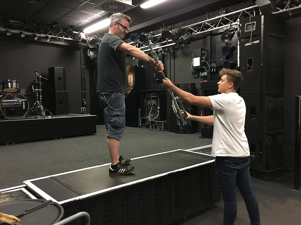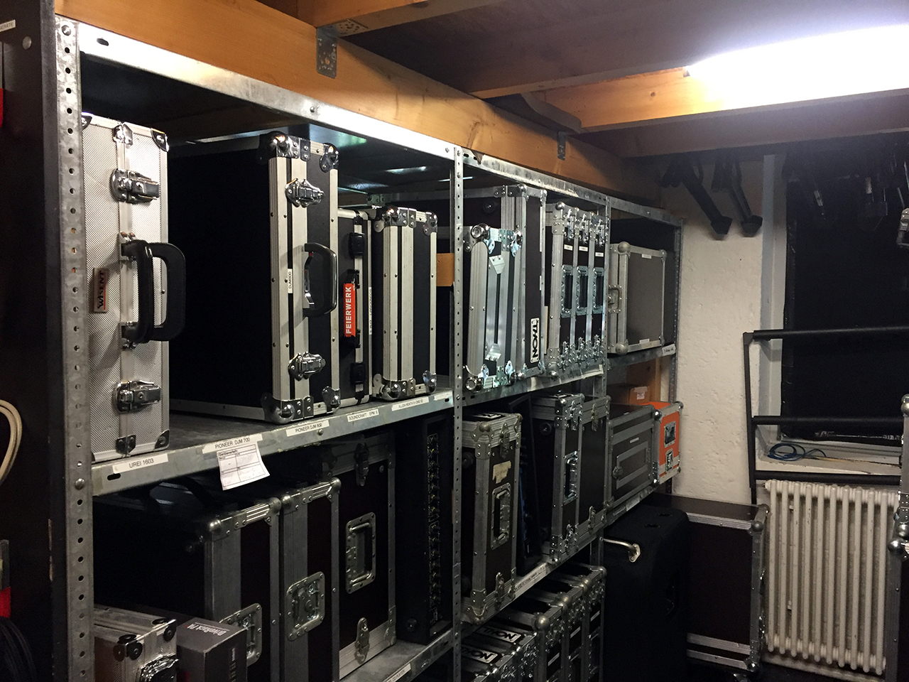 Anschließend weiht mich Tobi in das Herz der Technik ein: den Technikraum. Hier lagert alles, was für die Abteilung von Bedeutung ist. Tausende Kabel, Boxen, Instrumente, Halterungen…. Ich komme aus dem Staunen gar nicht heraus. Wahnsinn, wie kann man bei all den vielen Dingen nur den Überblick behalten? Für das Technik-Team ist das längst nichts Besonderes mehr. Für die Klärung von vielen Fragen bleibt allerdings kaum Zeit, denn es steht bereits der erste Soundcheck an und muss vorbereitet werden. Zusammen mit den Acts bauen wir die Instrumente auf der Bühne auf und gestalten diese nach deren Vorstellungen. Neben allen optischen Wünschen werden auch Sicherheitsmaßnahmen für Brandschutz, Strom und Stolperfallen getroffen. Ganz schön viel Arbeit, um eine Bühne auf so ein Konzert vorzubereiten!