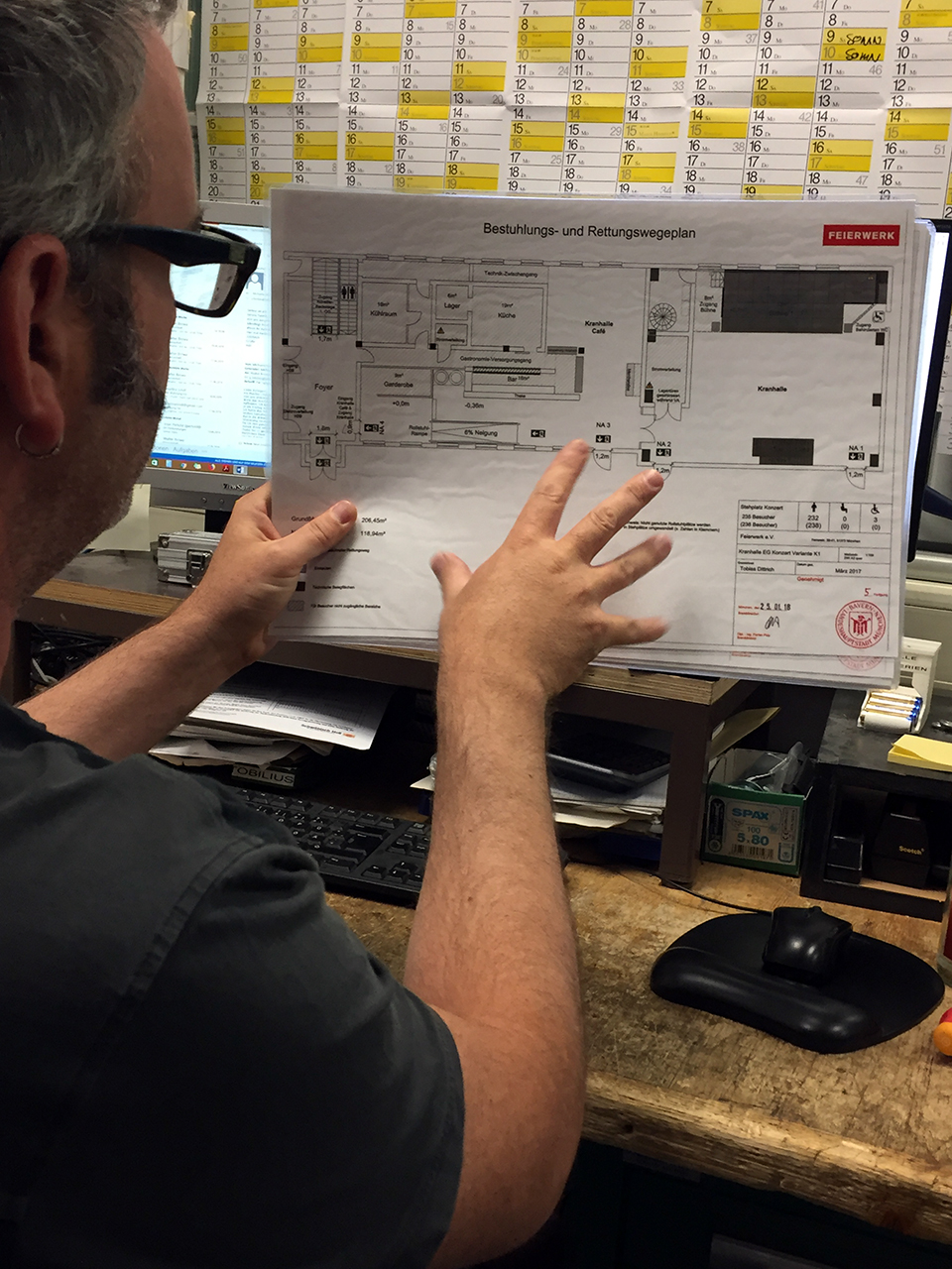 Freitag, 10 Uhr. Ich klopfe zweimal sanft an die Tür des Technikbüros, kurze Zeit später öffnet mir Tobi die Tür. Nach einem Kaffee, um wach zu werden, geht es dann auch direkt los – am Abend steht nämlich das Finale des „Sprungbrett 2019“ an und es ist noch einiges zu tun. „Im Grunde ist die Technik für die audio-visuelle Realisierung der Konzerte verantwortlich„, erklärt mir Tobi gerade, als – „Bam Bam“ – ein rasches Klopfen an der Tür die entspannte, morgendliche Stimmung zerreißt. Ein Phänomen, das uns an diesem Tag noch häufiger begleiten würde, denn neben dem Aufbau der Licht- und Tontechnik für die Konzerte ist unser Technik-Team für jegliche technischen Fragen als auch Reparaturen im Haus zuständig. Jakob (einer unserer Veranstalter) steht vor der Tür, um zu klären, ob angefragte benötigte Requisiten und Instrumente für einen kommende Live-Show in der Hansa 39 realisierbar sind. Generell steht die Technik in engem Kontakt mit den Bookern, da beide Abteilungen unverzichtbar für die Planung und Gestaltung von Konzerten im Feierwerk sind.