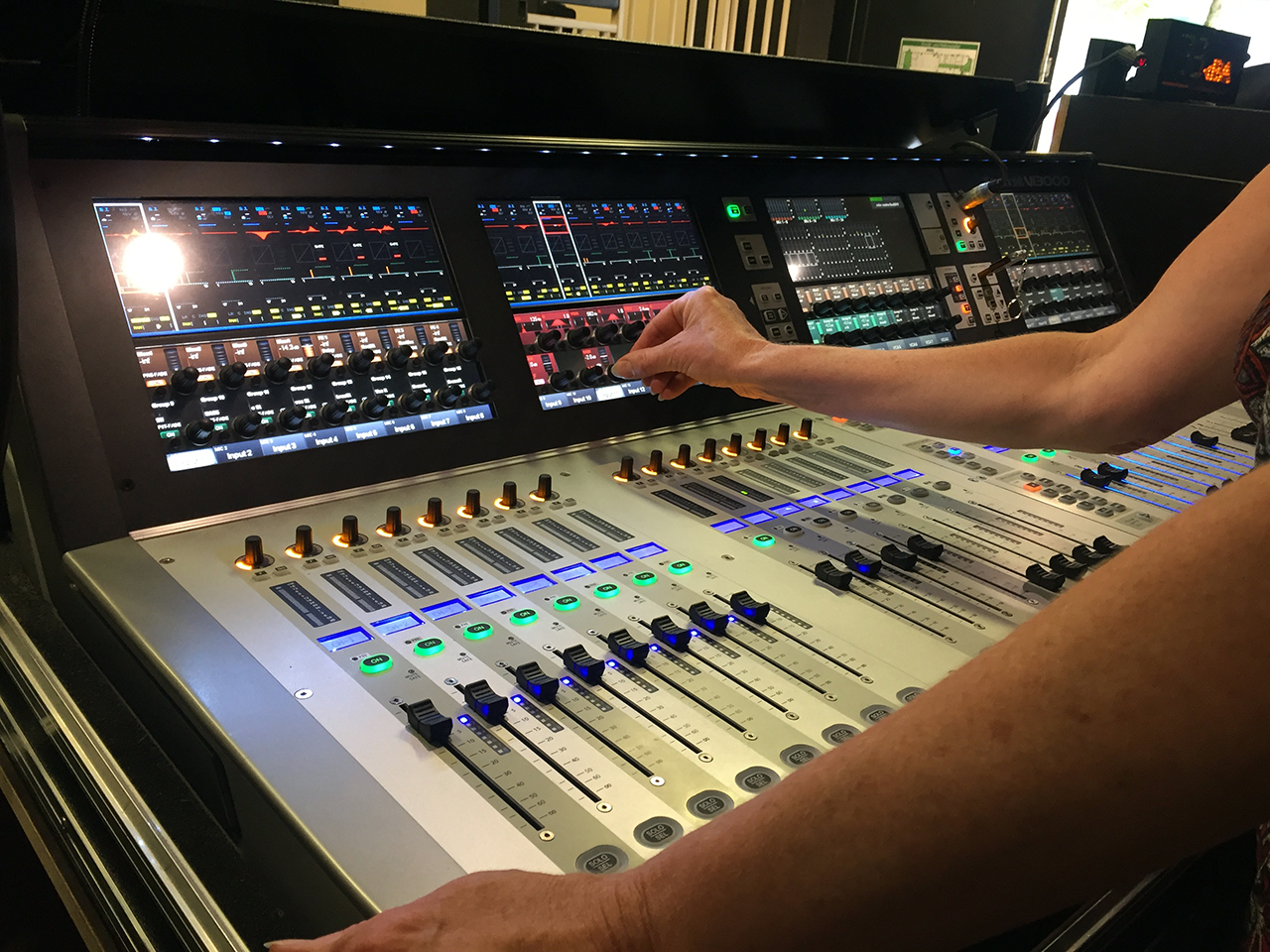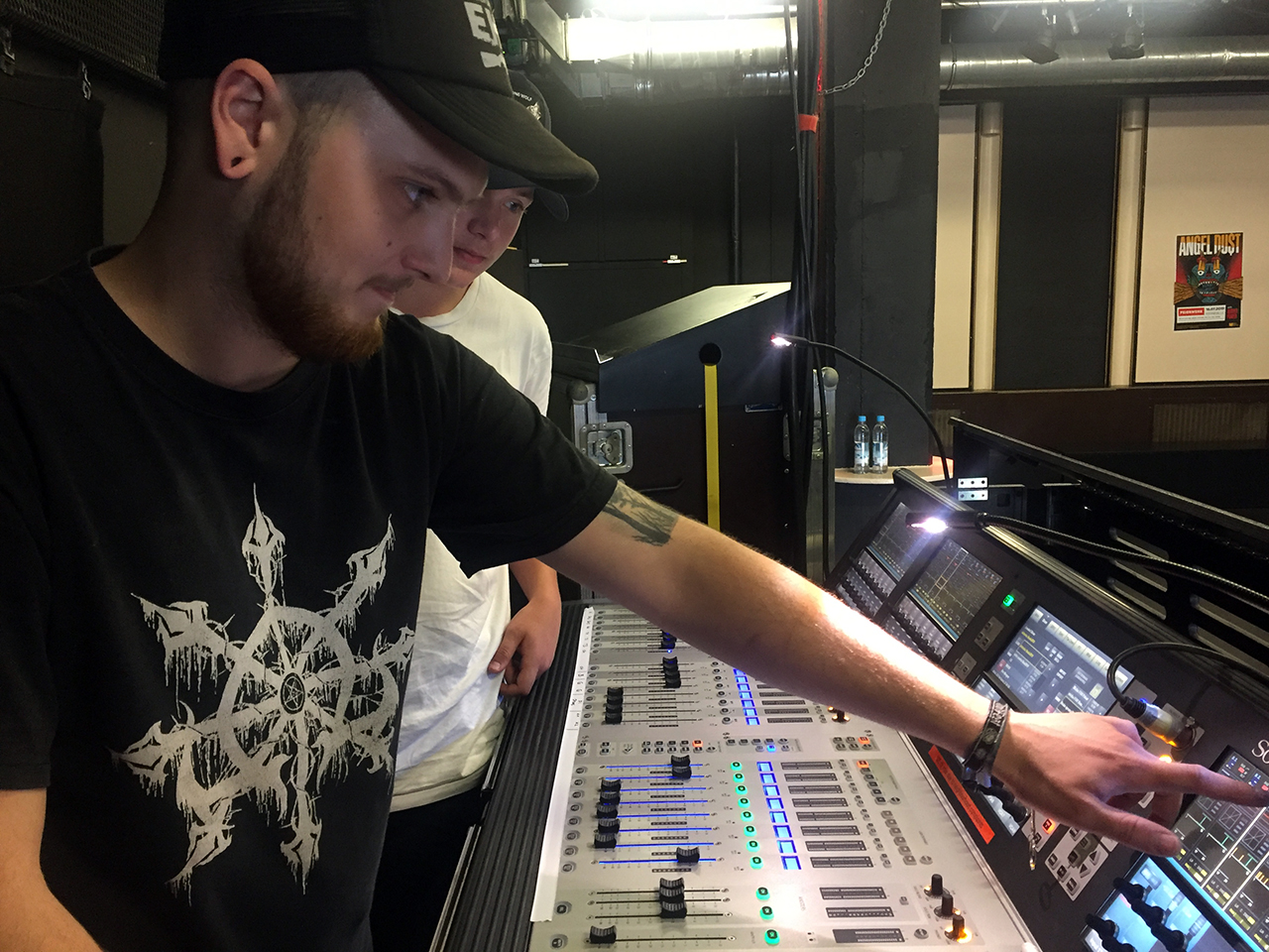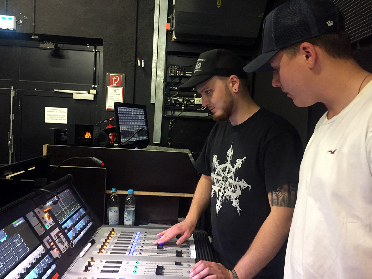 Am späten Nachmittag ist es dann soweit: der Soundcheck steht an. Für mich der Höhepunkt des Tages, denn jetzt sehe ich live, wie alles, was den gesamten Tag über vorbereitet wurde, zusammenläuft. Ab hier übernehmen Micha und Janek, die Nachtschicht, den Lauf der Dinge. Janek weiht mich in die Licht- und Tontechnik ein. Ich stehe vor einem Tisch voller verführerischer Knöpfe und mit blinkenden Lichtern. Hier ist es echt schwer, den Durchblick zu behalten, gerade weil oft nicht viel Zeit bleibt, um alles mehrmals zu erklären – schließlich rückt das Konzert immer näher. Zwischen Tausenden von Funktionen und Kombinationen passt das Technik- und Ton-Team alles optimal auf das Konzert und dessen Acts an. Endlich ist es geschafft: Nachdem alle mitgeholfen und an einem Strang gezogen haben, steht dem Sprungbrett-Abend nichts mehr im Weg.