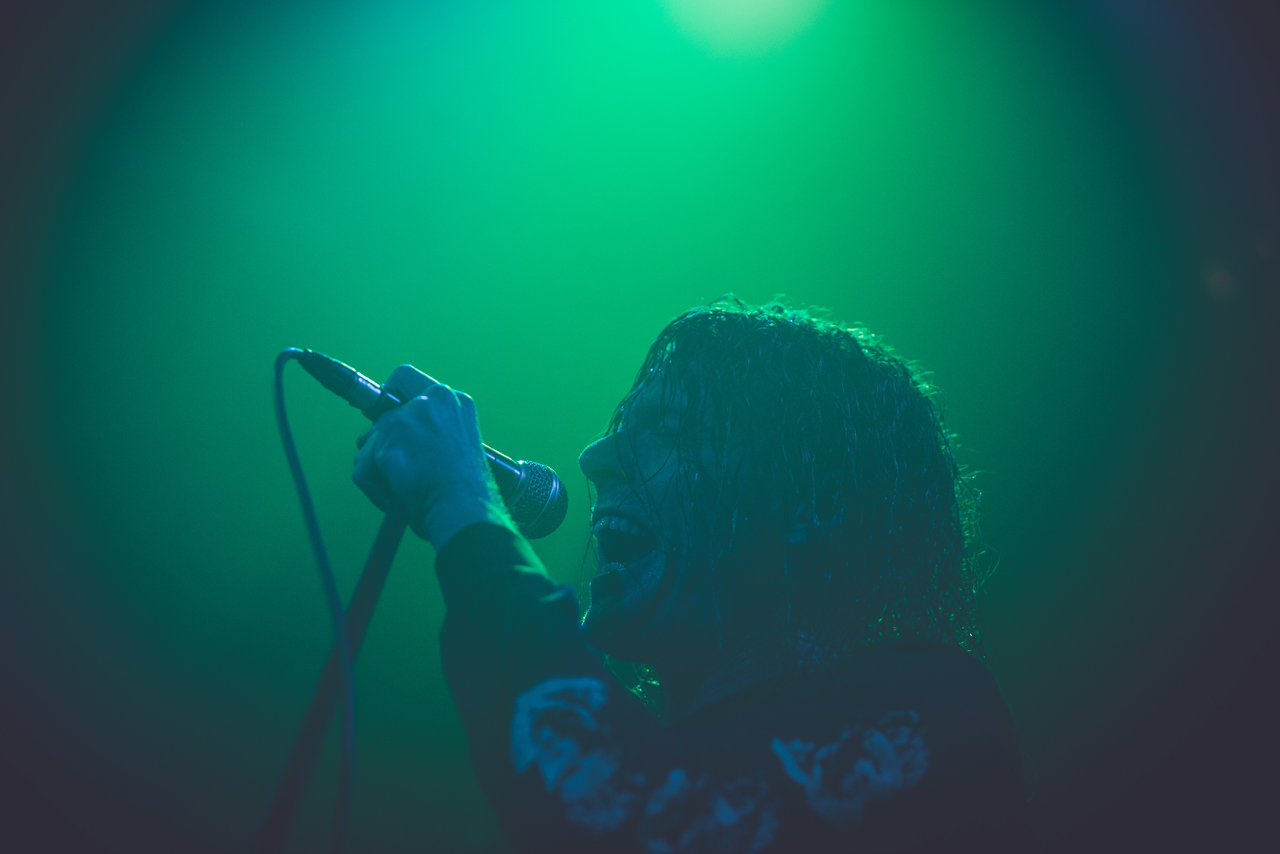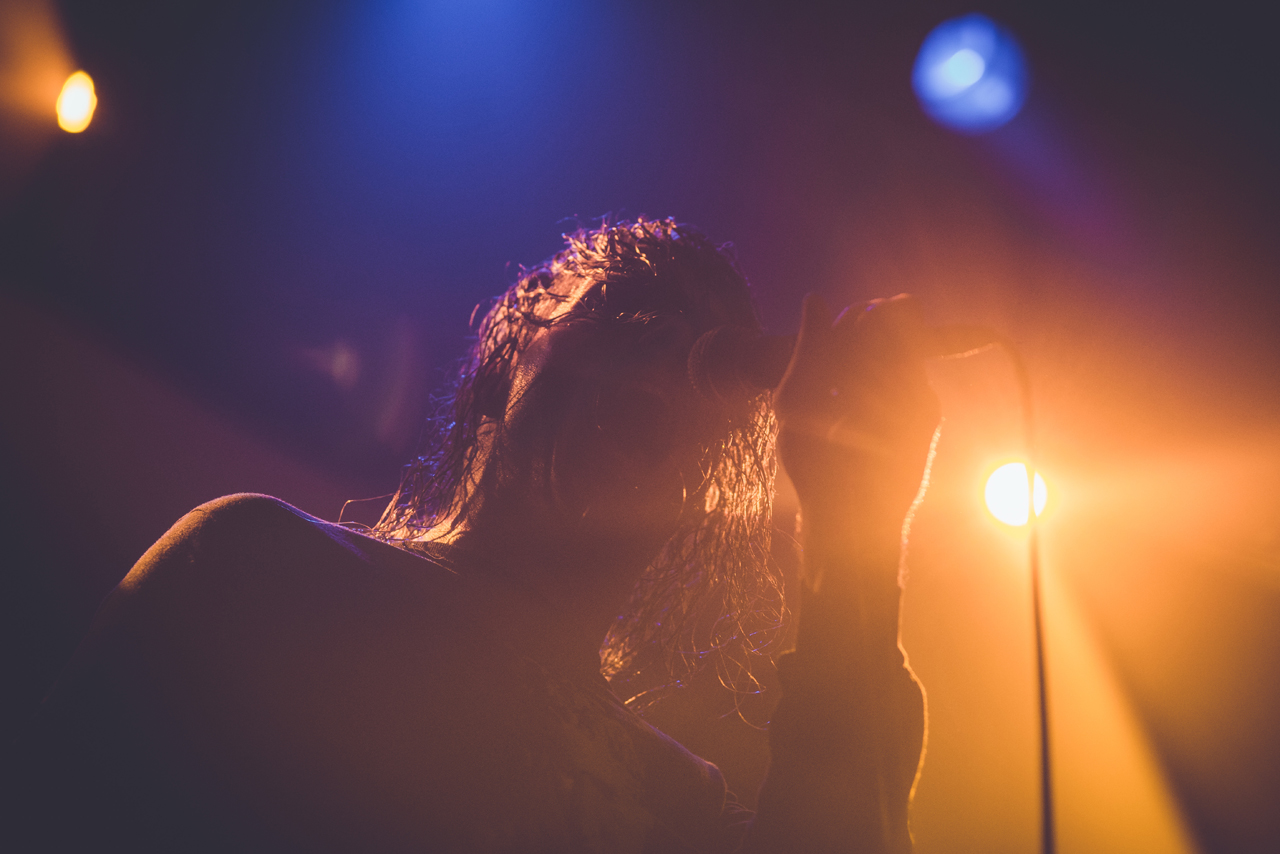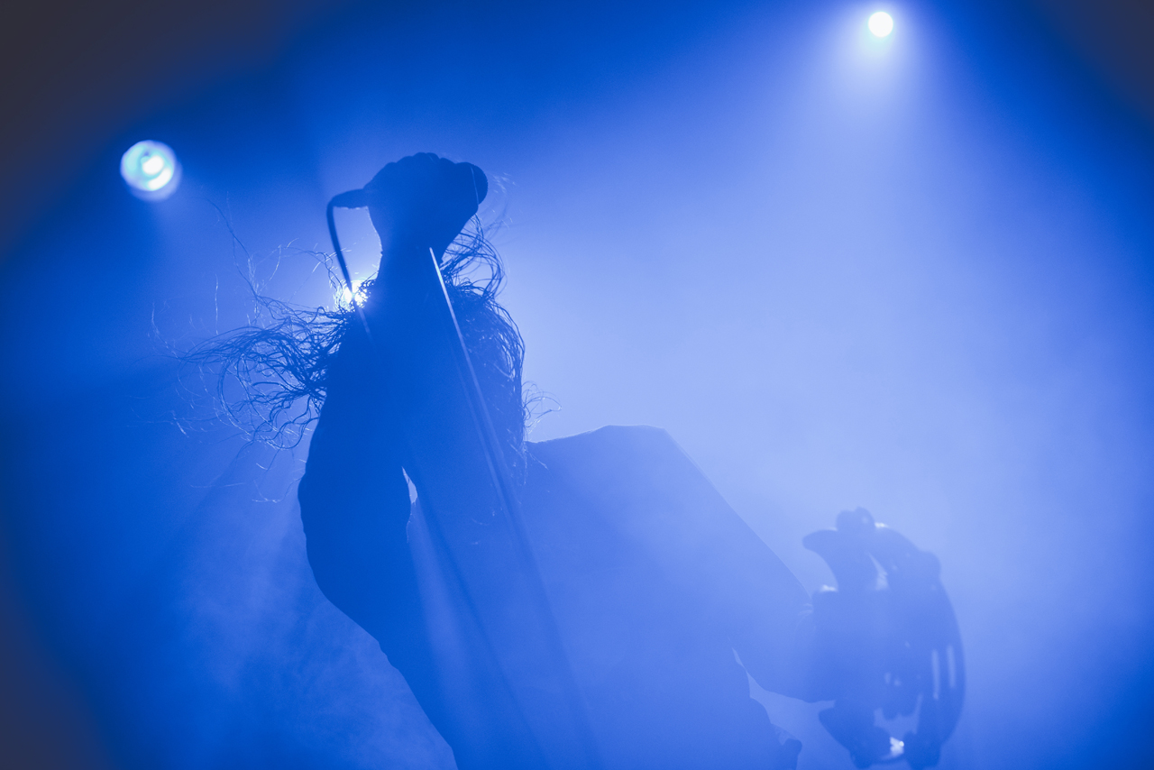 Es sollte düsterer werden. In kühlem, blauen Licht und dunstigem Nebel trat George Clarke vor das Publikum. Voller Energie ging er die Bühne auf und ab, hüpfte zweimal in die Luft, ergriff das Mikro und schrie endlich mit „Honeycomb“ den zweiten Song des neuen Albums „Ordinary Corrupt Human Love“ in die Menge! Beim nachfolgenden Song „Canary Yellow“ wurde klar, warum Deafheaven auch im Shoegaze beheimatet sind. Zu Beginn des Liedes wehte ein Hauch von Slowdive durch die Kranhalle. Eben gerade in Songs wie „Canary Yellow“ zeigt Deafheaven, wie perfekt sie den Wechsel zwischen den Musikgenres beherrschen.