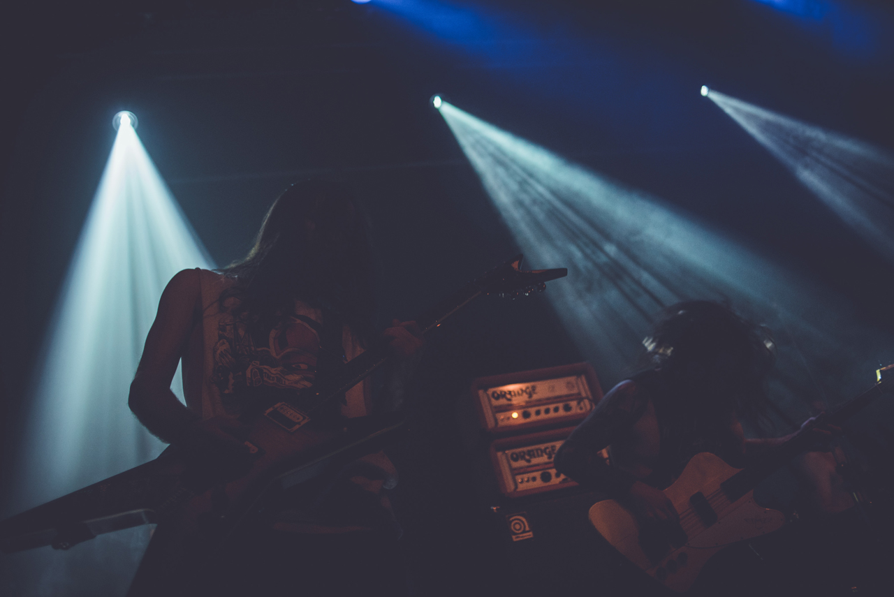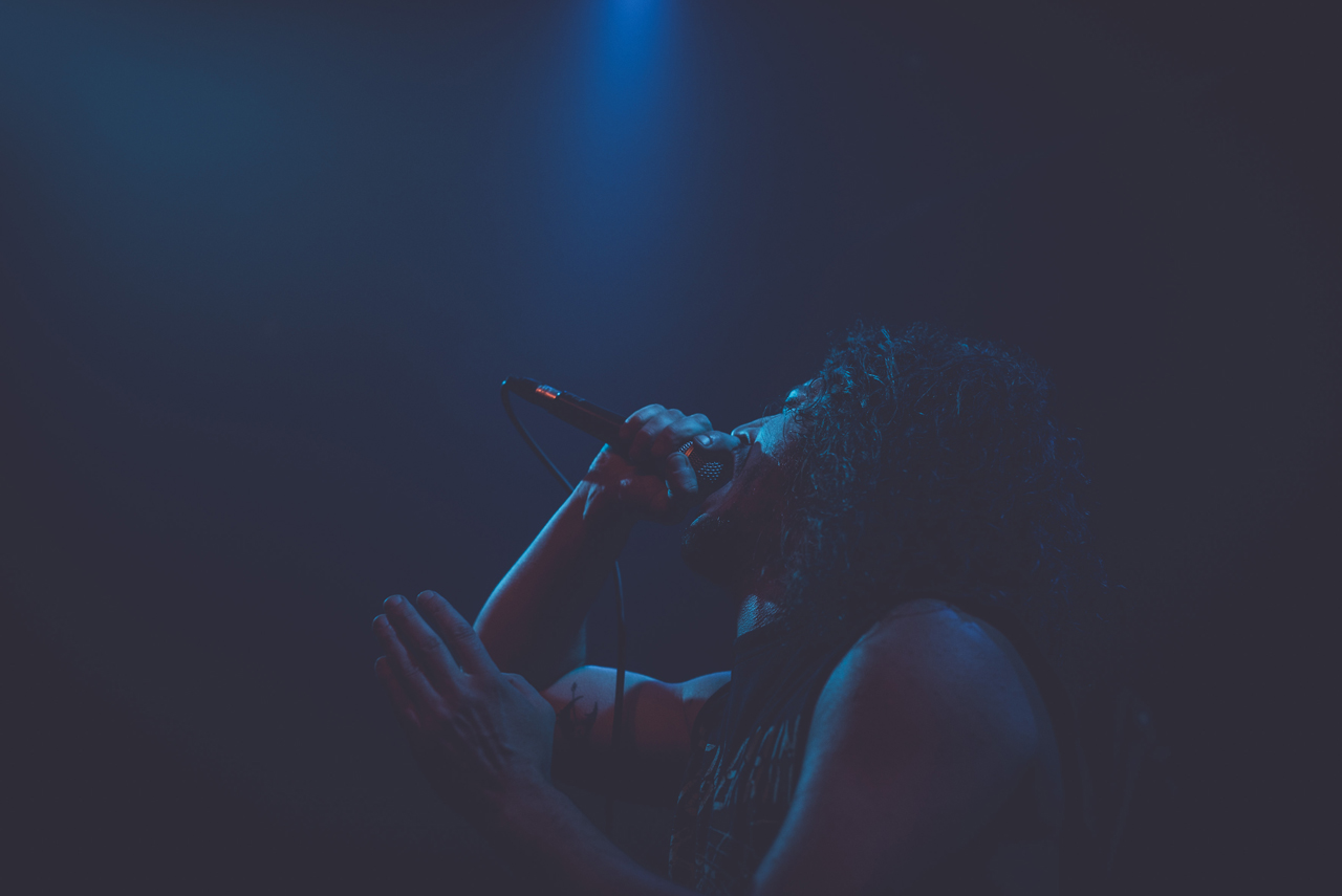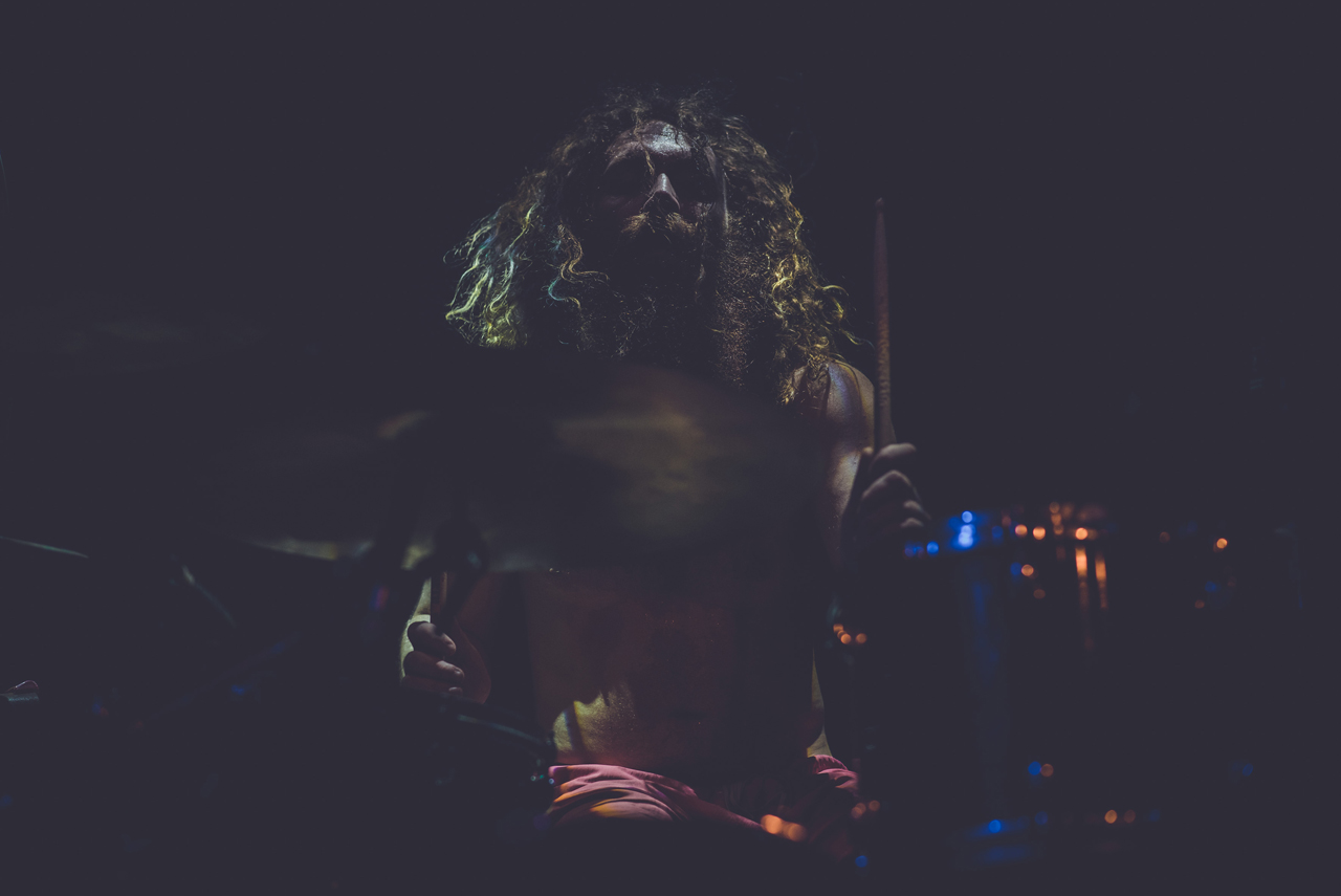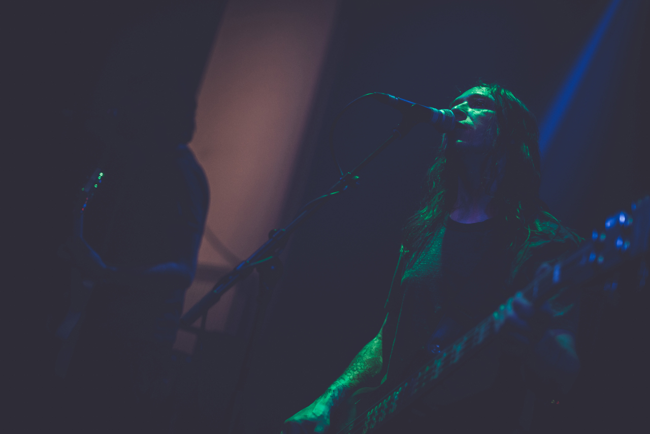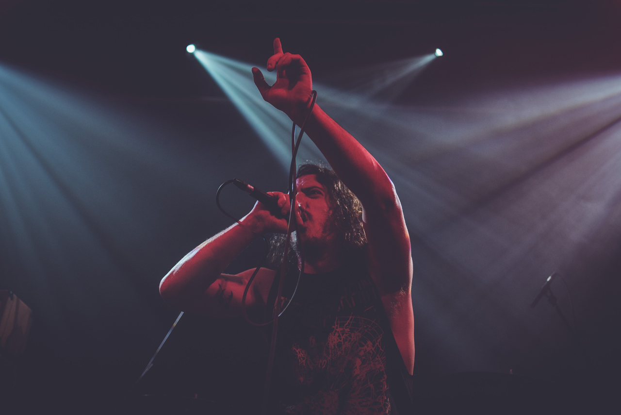 Bereits um kurz nach 21 Uhr war die Kranhalle gut gefüllt und die letzten Tickets an der Abendkasse verkauft. Der Abend begann mit Inter Arma, einer Band aus Richmond, Virginia, die sich ebenso schwer in ein Musikgenre einordnen lässt, wie Deafheaven. Sie heizten der Halle mit ihrer Mischung aus Doom, Sludge und Post-Metal ordentlich ein. Schon nach wenigen Minuten hing ein leichter Schweißgeruch in der Luft. Es war schwer auszumachen, woher der Geruch kam. Vom Publikum oder von der Band, die sich eher leicht bekleidet auf der Bühne zeigte. In spärlichen, blass-rosafarbenen Boxershorts bearbeitete T.J. Childers rasant seine Drums. Musikalisch war das durchaus überzeugend und ein guter Start in den Abend!