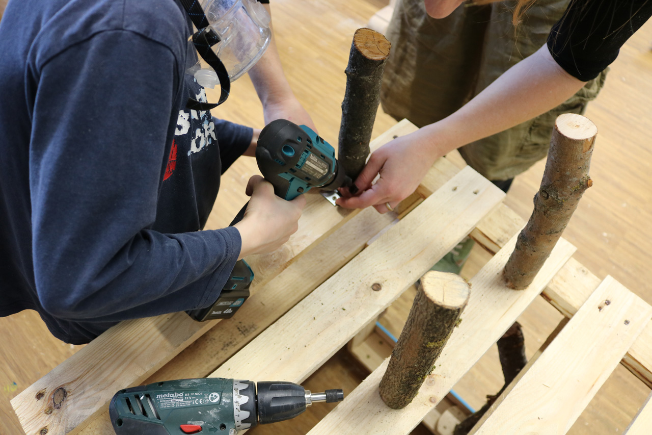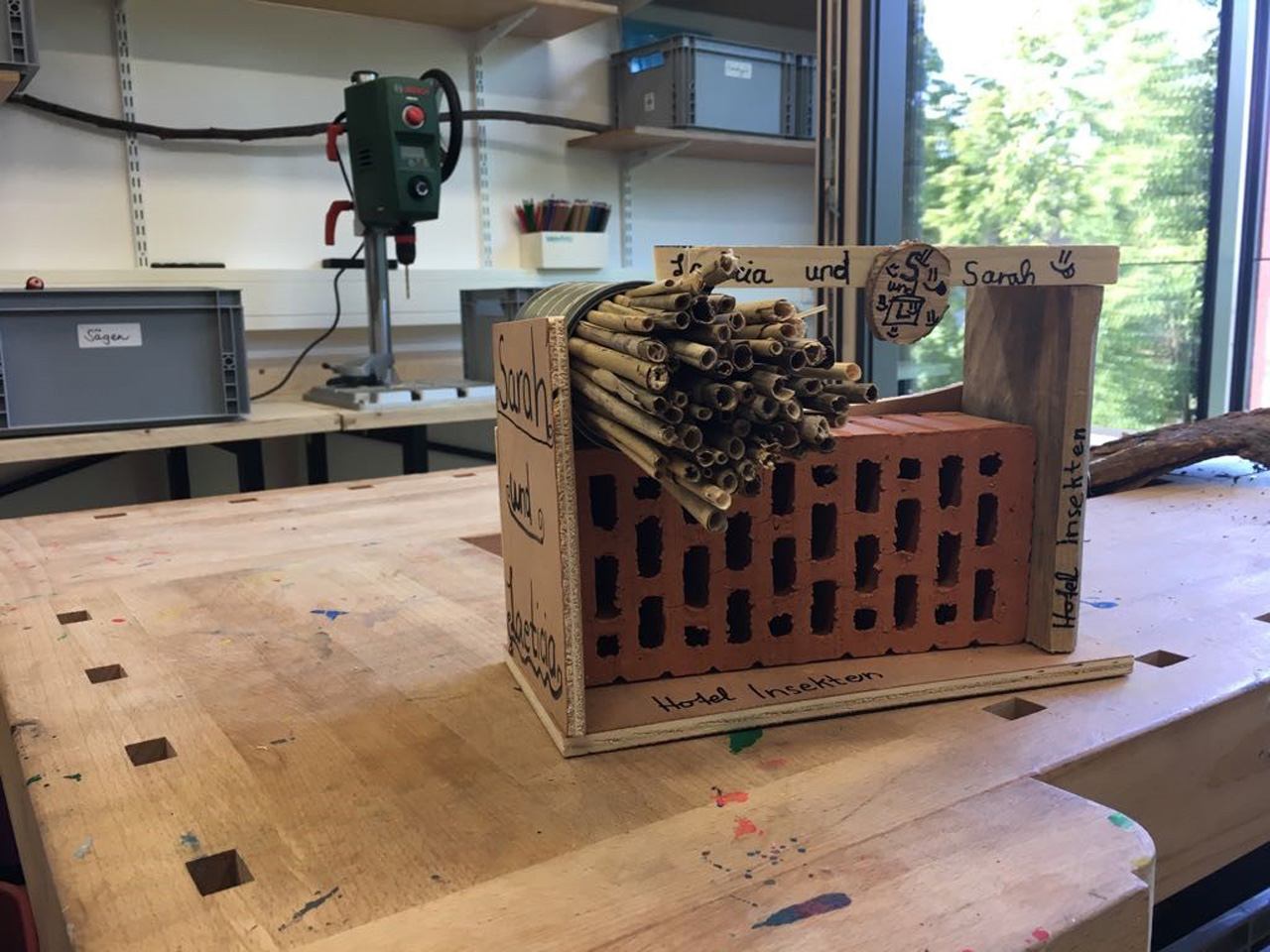Jedes Kind gestaltete ein Zimmer für die Insekten und stattete dieses nach seinen Wünschen aus. Etwa mit Ästen, die natürlich mit Löchern versehen werden mussten, damit Wildbienen und Co hineinschlüpfen können.