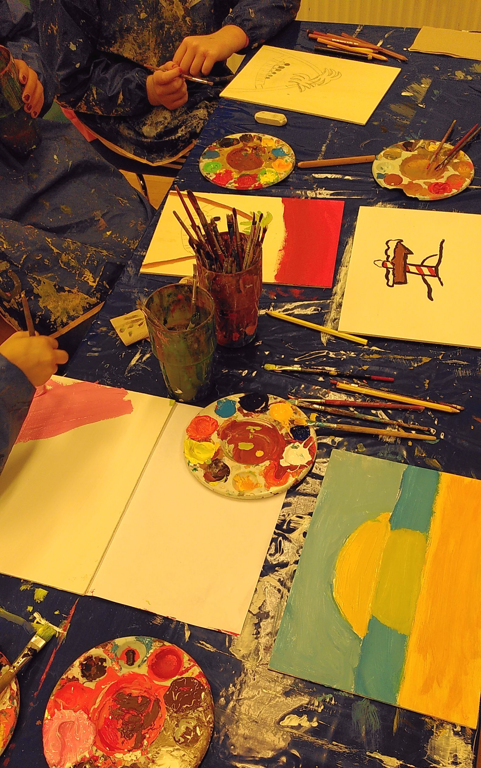 Am 2. November ging es dann so richtig los: Zahlreich erschienen die Kinder voller Vorfreude und wurden dafür zunächst mit frischen warmen Brezen als Stärkung belohnt. Während alle aßen, erklärte Verena Schlechte den Kindern den Aufbau eines Bildes sowie die Nutzung der Farben, um das Bild bestmöglich in Szene zu setzen: Die Farben im Hintergrund sollten tendenziell eher bläulich sein, im Vordergrund kommen dagegen eher warme Farben wie Rot und Gelb zum Einsatz.