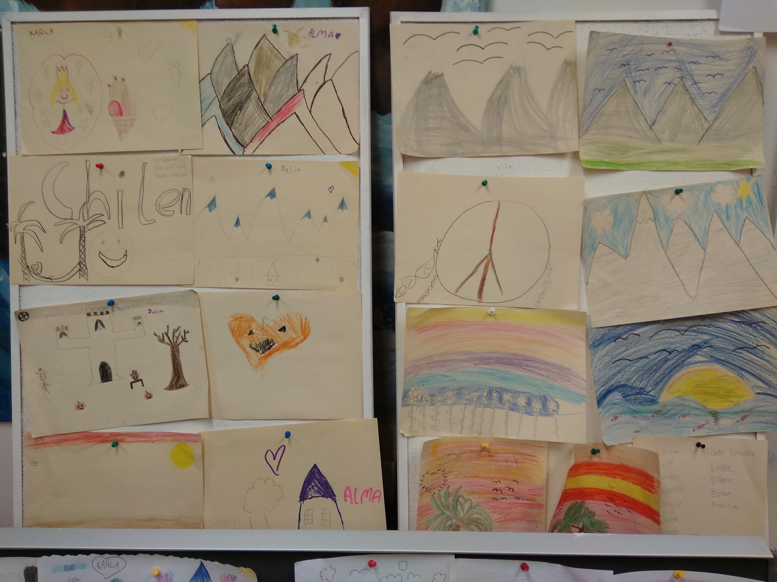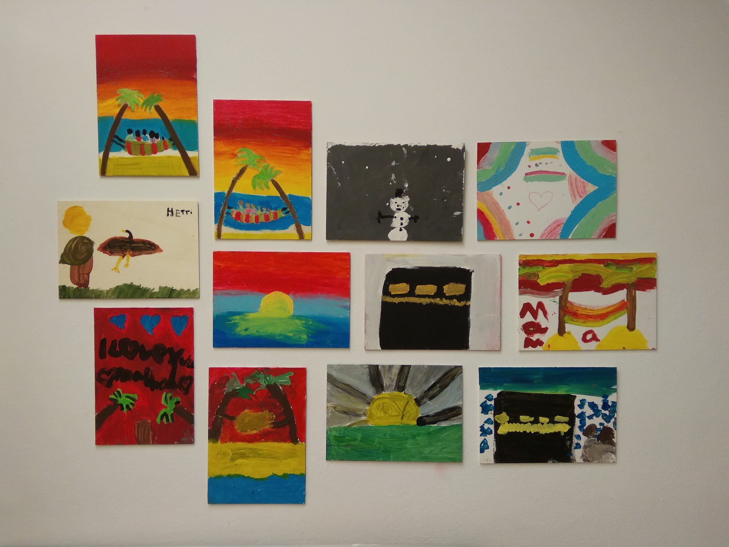 Am nächsten Tag gings weiter: Das Wandbild war im Nu fertig und die Kinder konnten noch eigene kleine Motive zur gleichen Fragestellung malen. Das fanden wir wichtig, denn was uns glücklich macht, ist letztlich eine sehr persönliche Frage. Auch hier griff die Mehrheit das Thema Natur auf. So entstanden wieder einige Bilder mit Sonnenuntergang oder Strand mit Hängematte – zwei davon sogar mit der ganzen Familie in der Hängematte. Aber auch andere Dinge waren den Kindern wichtig: etwa die eigene Religion (dargestellt in Form des Pilgerortes Mekka) oder der Wechsel der Jahreszeiten (symbolisiert durch einen Schneemann). Ein Kind hatte das Thema Glück dagegen abstrakt durch Symbole und passende Farben umgesetzt.