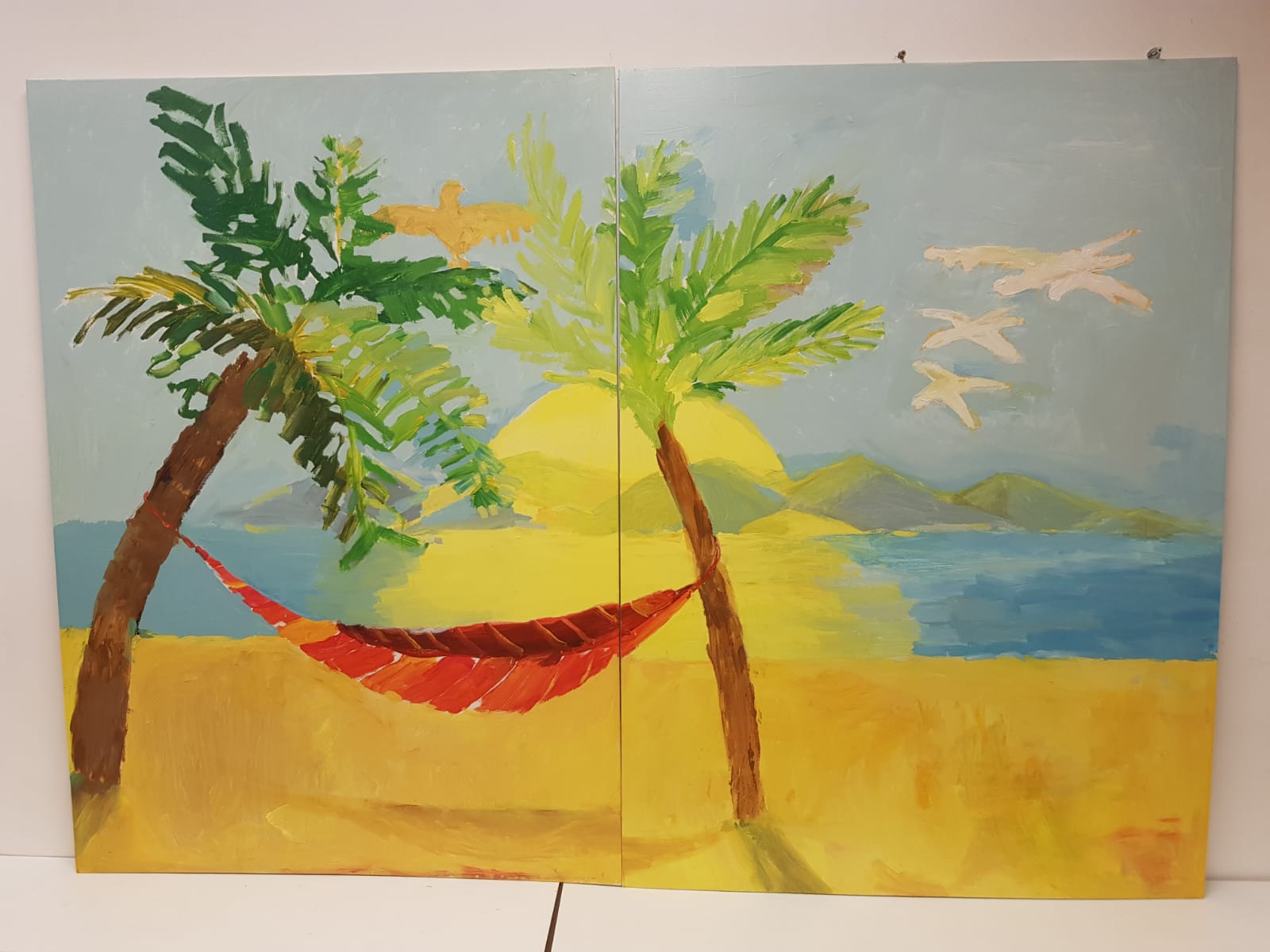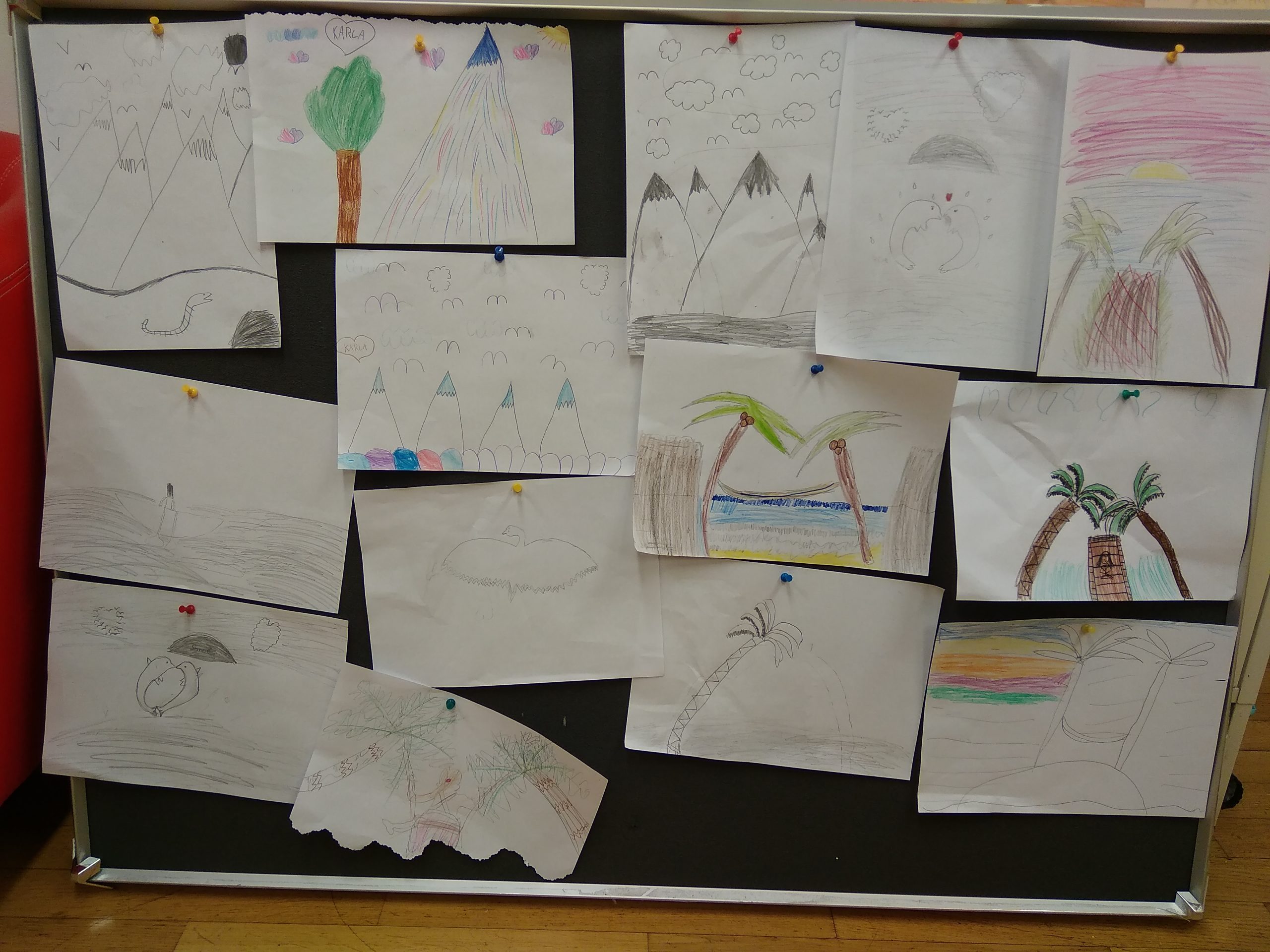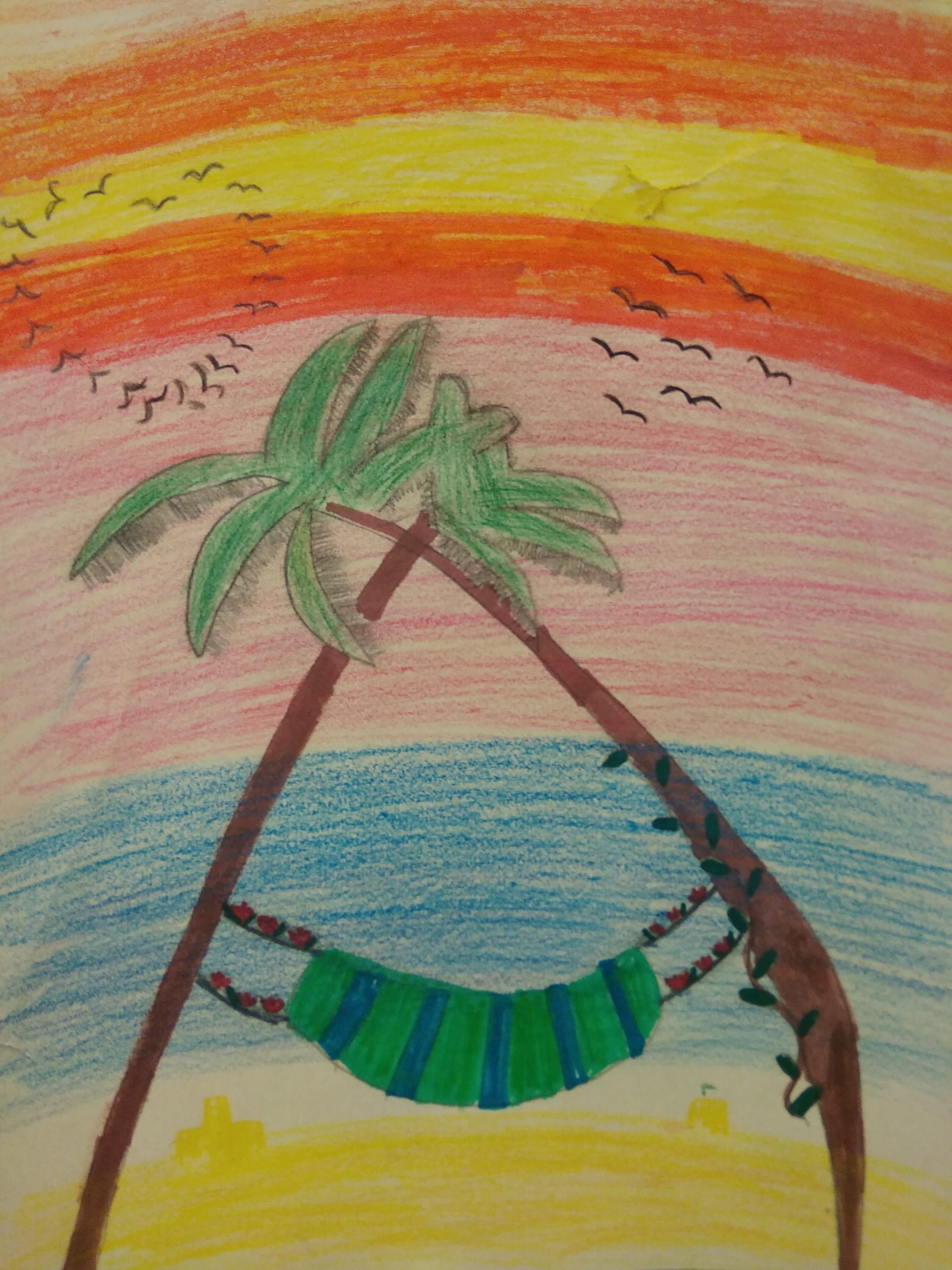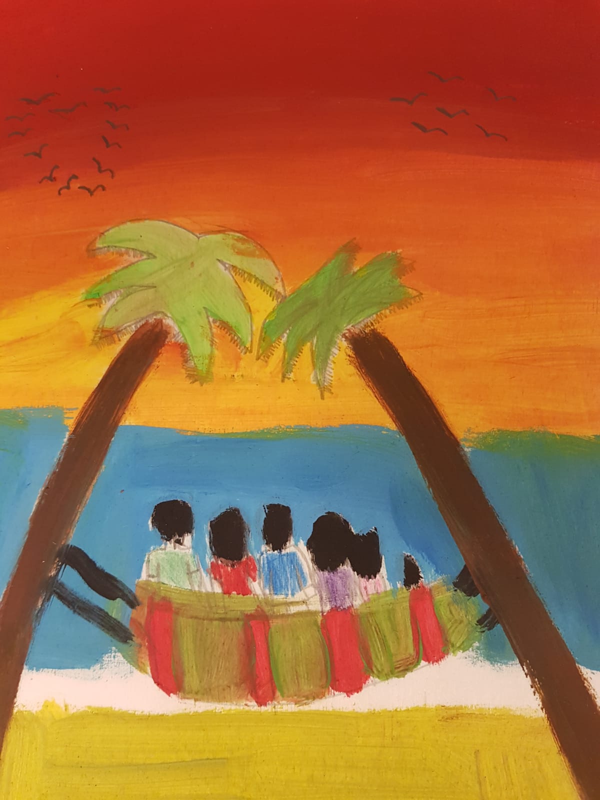 Anschließend stimmten die Kinder ab, was auf dem Bild zu sehen sein sollte. Die Kinder waren sich dabei in vielerlei Hinsicht erstaunlich einig: Sie entschieden sich für einen Strand mit Palmen und einer Hängematte im Vordergrund sowie Bergen, Sonne und Vögeln im Hintergrund. Denn zum Glücklichsein braucht es laut den Kindern auch einen ruhigen, sicheren Ort, an dem man sich ausruhen, „chillen“ und Pause machen kann, was durch die Hängematte symbolisiert wird.