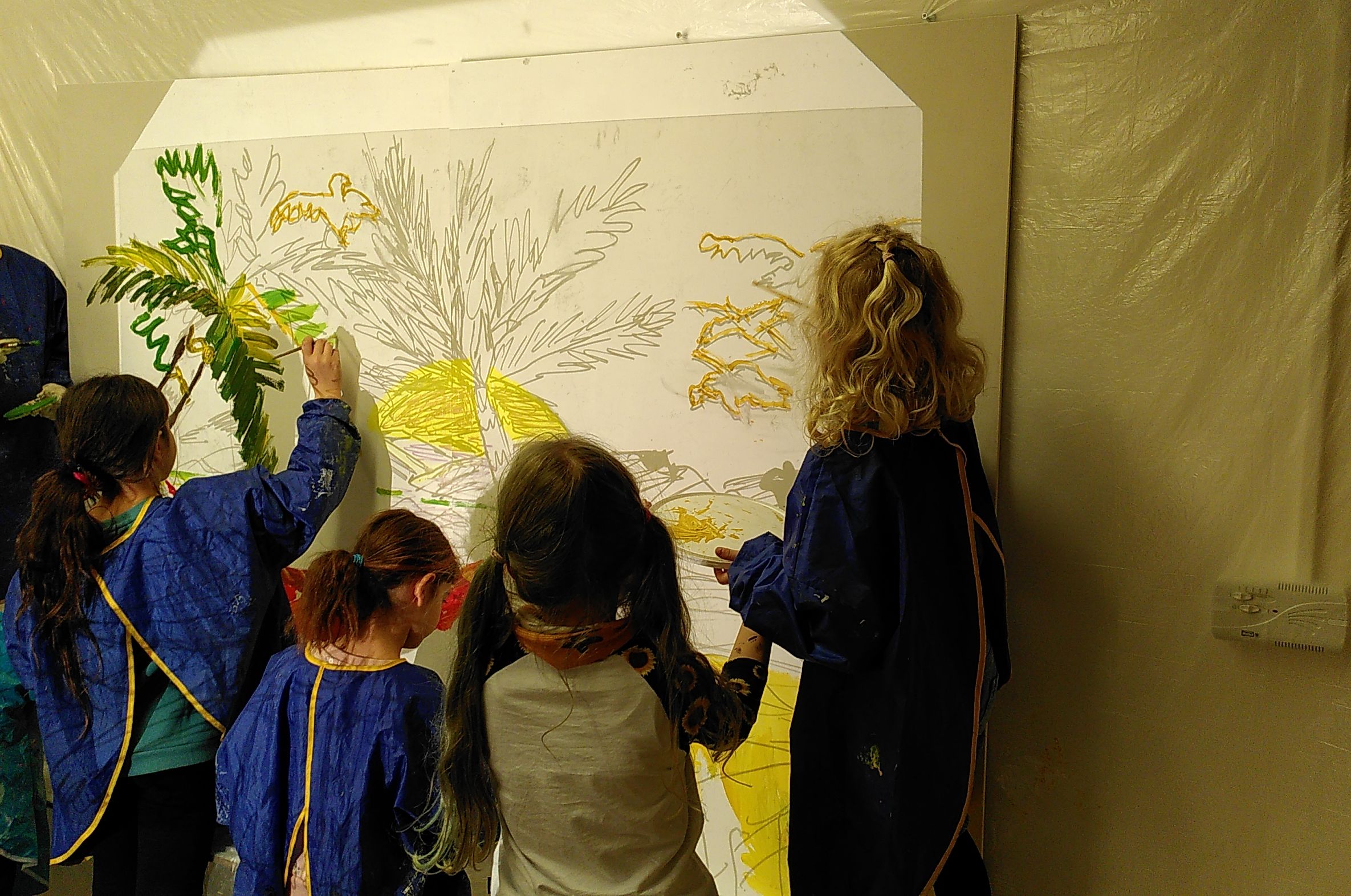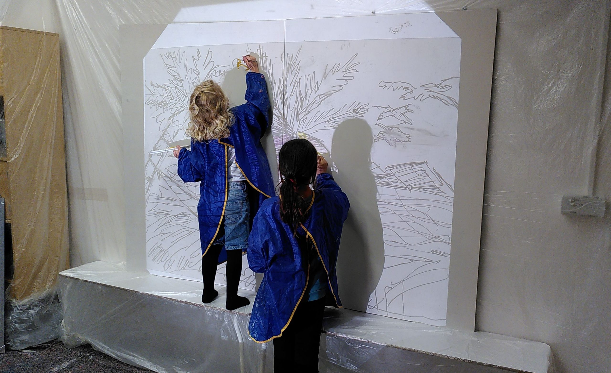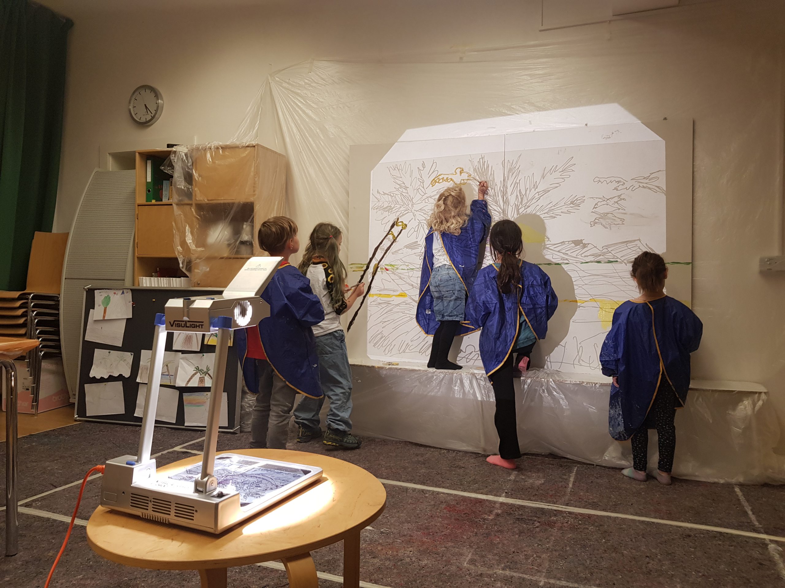 Nach der Motivwahl zeichneten die Kinder die finale Skizze auf Folie, die dann mit einem Tageslichtprojektor auf die beiden zu bemalenden Holzplatten projiziert wurde. Endlich konnte losgemalt werden! Verblüffend schnell füllte sich das Bild mit Farbe und die Kinder schienen keinerlei Probleme mit dem großen Format zu haben.