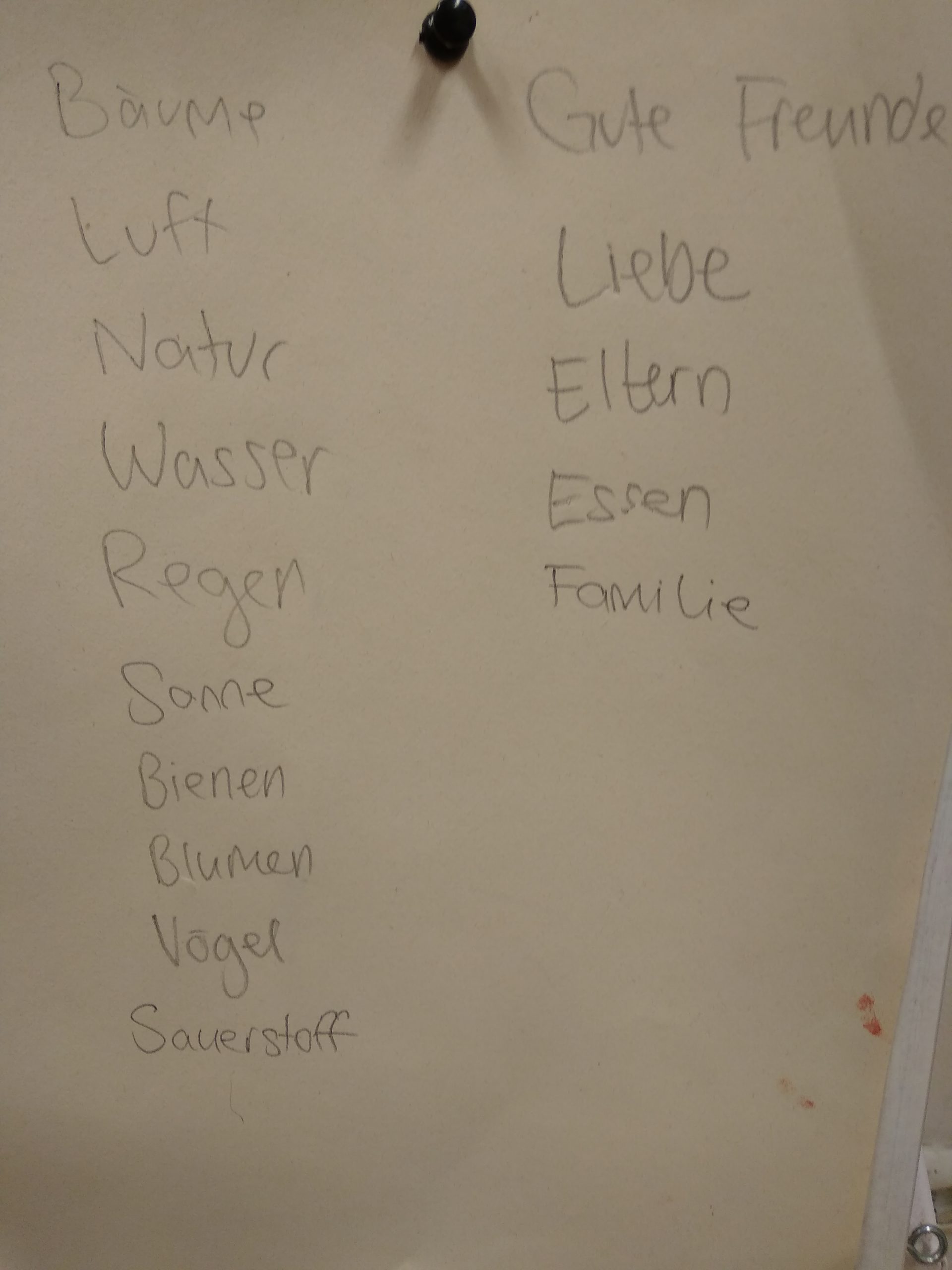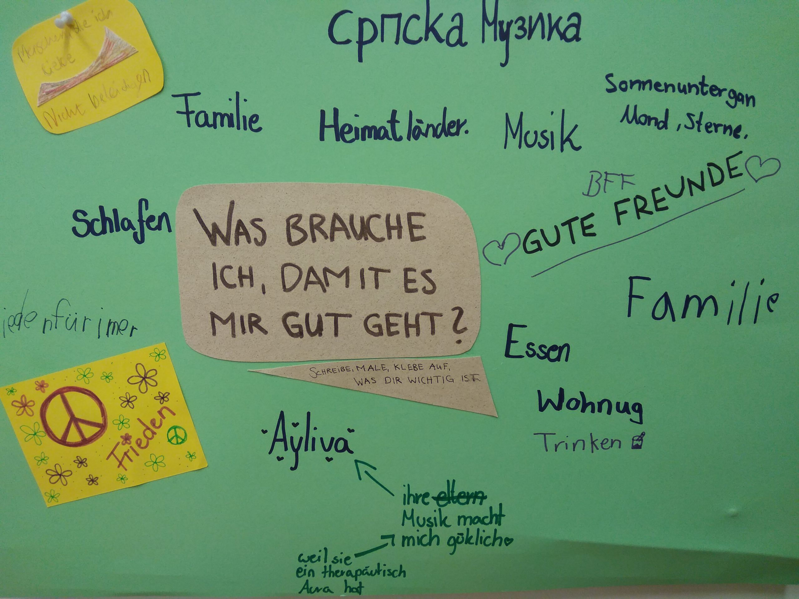 Bevor die Kinder selbst den Pinsel in die Hand nahmen, mussten ein paar Fragen geklärt werden: „Was brauchen wir und alle Menschen auf der Welt für ein gutes Leben wirklich?“ Die wichtigsten Punkte kamen auf ein Übersichtsplakat: Neben Heimat(ländern), Familie, Freund*innen und Musik standen elementare Bedürfnisse nach Sicherheit durch Frieden, ein Zuhause und genügend Essen ganz oben auf der Liste. Aber auch die Natur spielte eine Rolle.