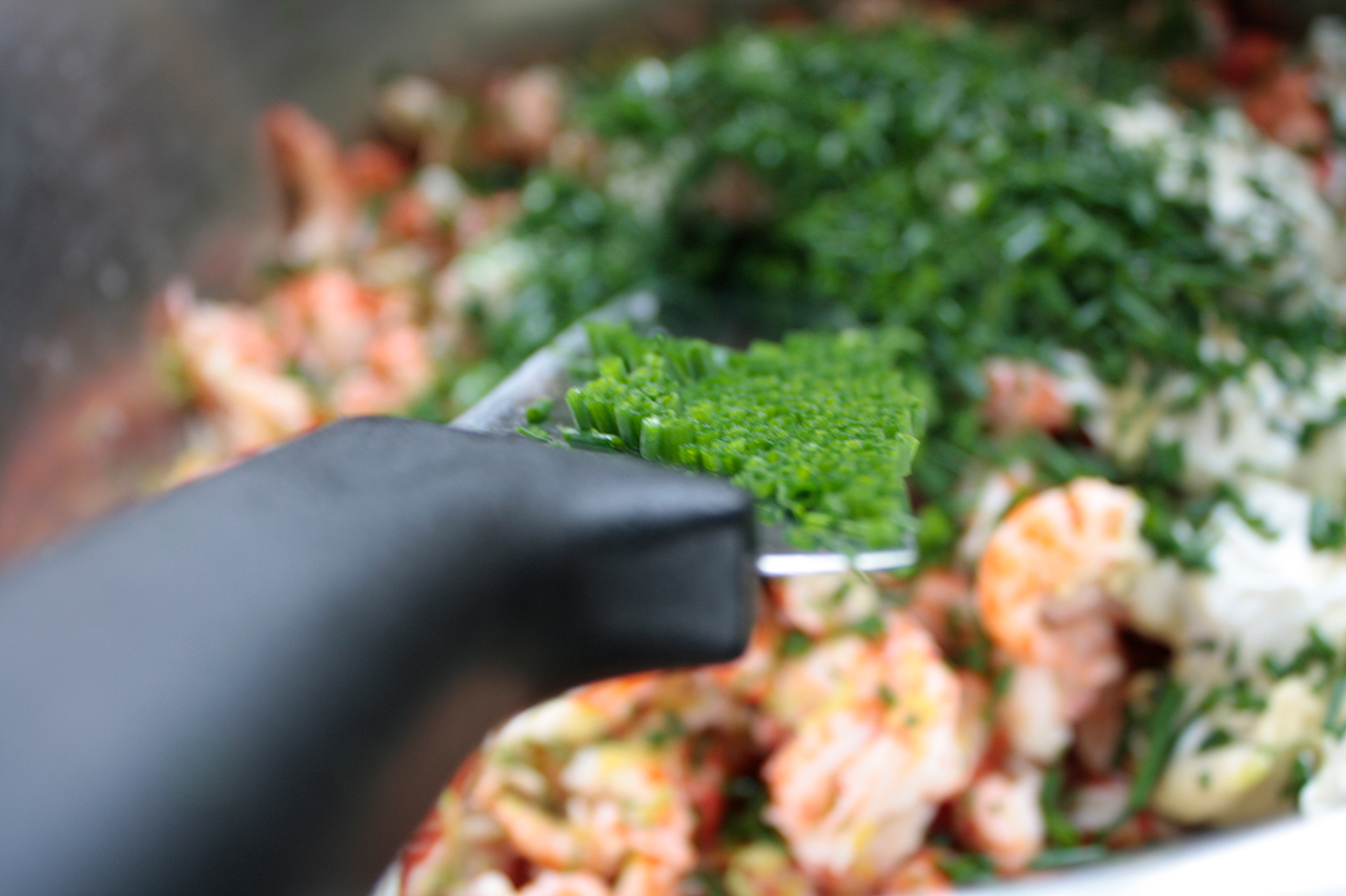 Die fertige Flusskrebsmasse sondert ziemlich viel Wasser ab. Wenn ihr sie im Kühlschrank lagert, legt die Masse in ein feines Sieb oder Abtropftuch und stellt eine Schüssel darunter, dann tut ihr euch später leichter. Daher auch in der Vorbereitung: alles gut abtropfen lassen und Tomate und Gurke entkernen!