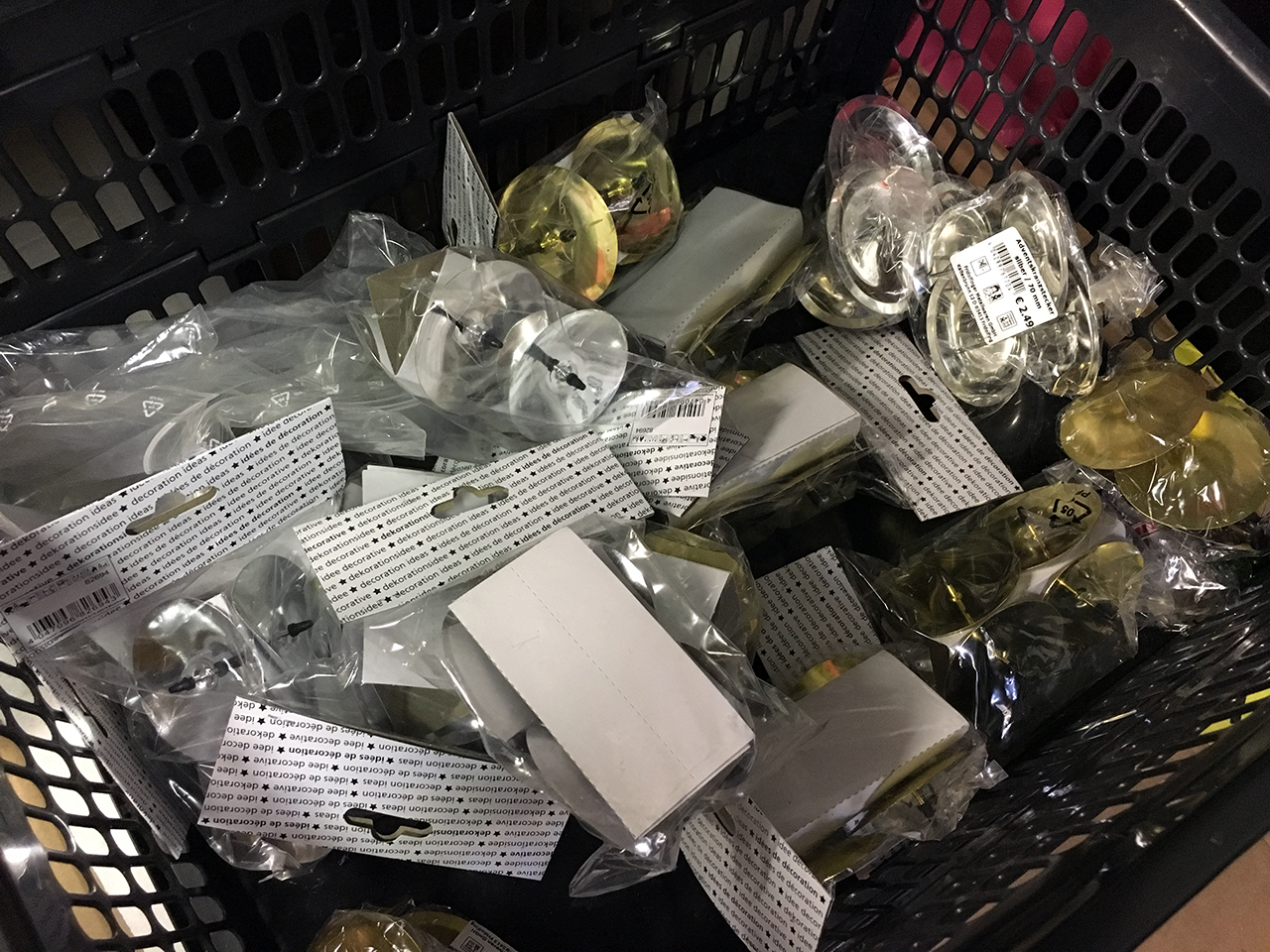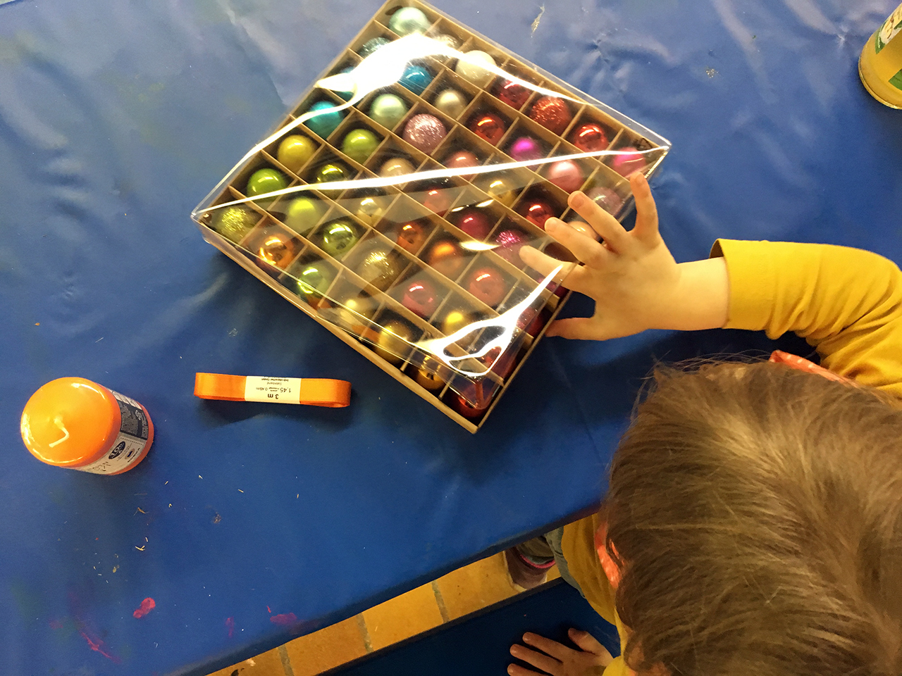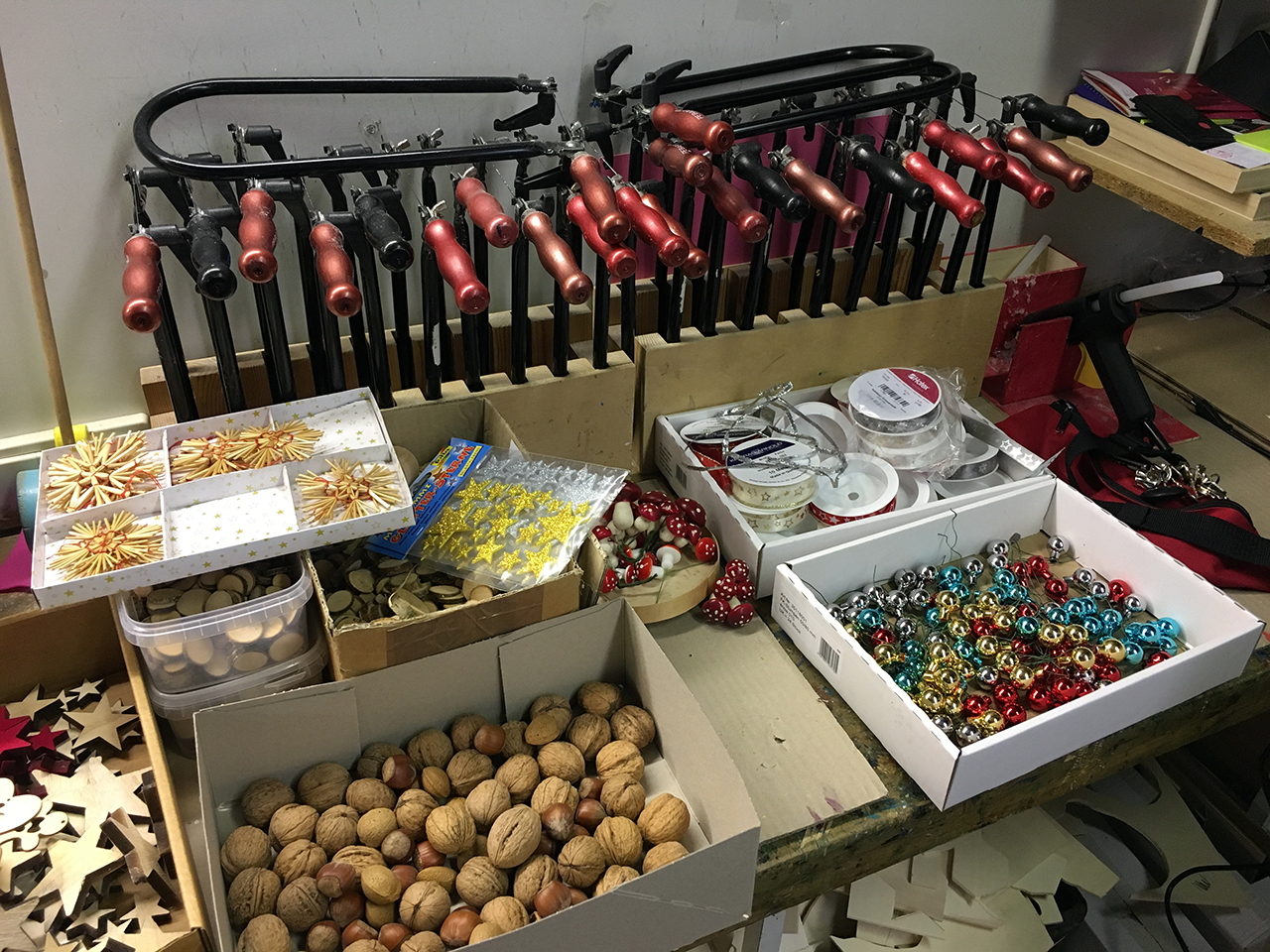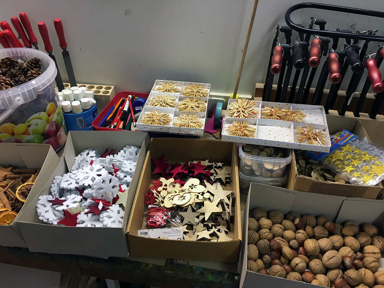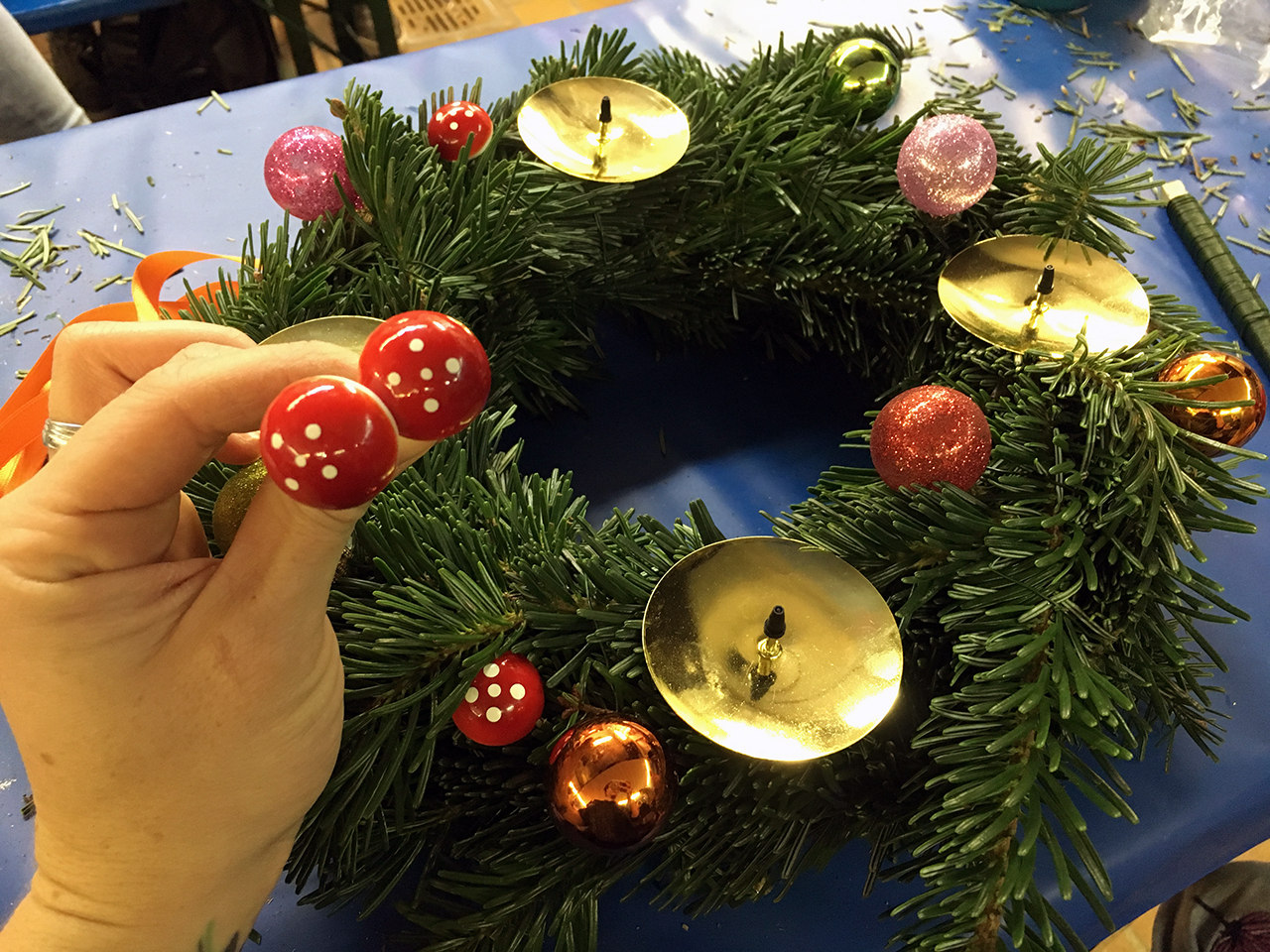 Ihre Wahl fällt auf Glitzerkugeln in rot, rosa, grün und orange, sowie auf Mini-Tannenzapfen und rote Fliegenpilze. Außerdem suchen wir uns noch ein paar Zimtstangen und getrocknete Orangenscheiben heraus, die müssen natürlich auch noch mit drauf.
