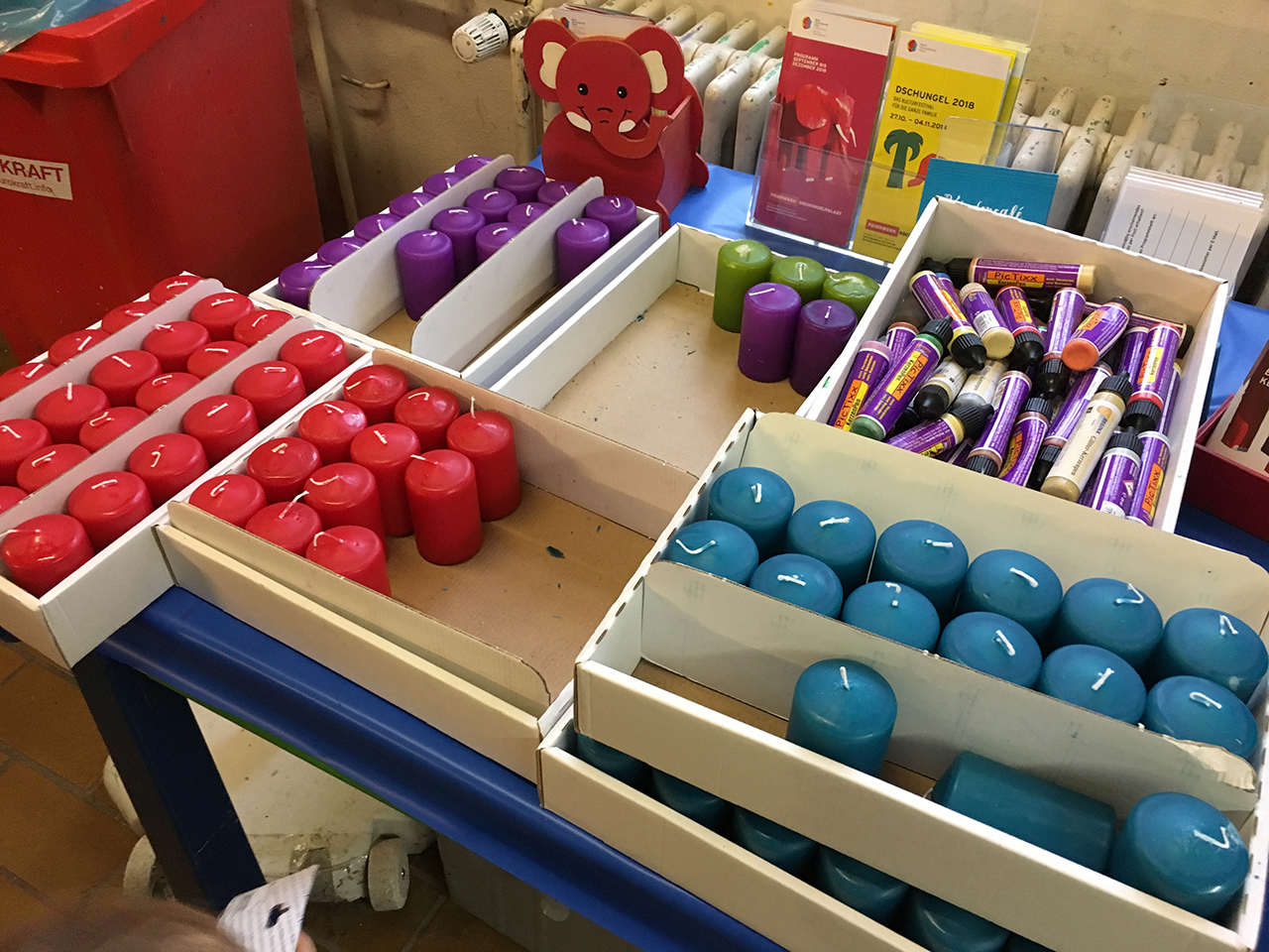 Die Deko kleben wir nacheinander mit der Heißklebepistole auf den Adventskranz. Das geht schnell und hält bombenfest! Zu guter Letzt dürfen wir uns dann aus vielen Farben noch die Kerzen aussuchen. Und auch hier bleiben wir beim diesjährigen Stil: kunterbunt! Rot, grün, lila und knallorange – die Lieblingsfarbe des Töchterchens darf natürlich nicht fehlen.