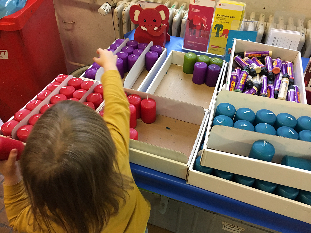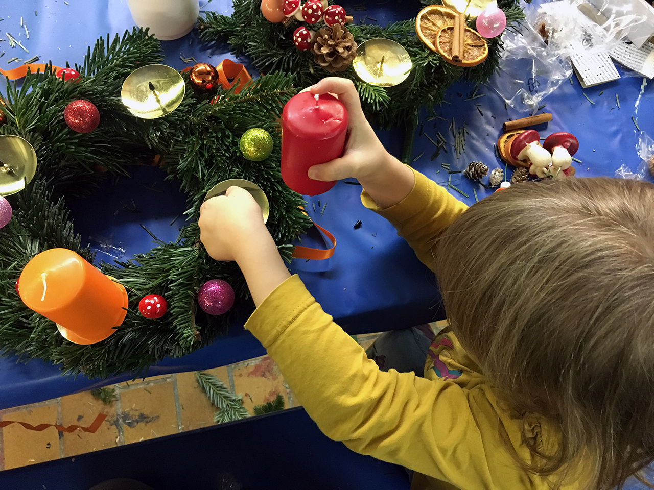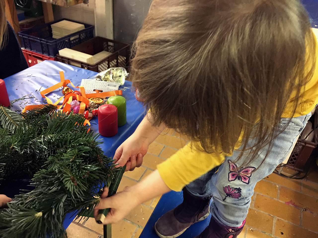 Sobald das geschafft ist, kommt der schönste Teil: Die Dekoration! In der Holzwerkstatt gibt es eine große Auswahl an tollen Dingen, die wir auf den Kranz packen können. Während sich die meisten Erwachsenen vermutlich für eine eher einheitliche Deko entscheiden würden, wird unser Adventskranz kunterbunt. Und nachdem das Töchterchen begeistert Materialien aus den Schachteln zusammen sammelt, lasse ich ihr einfach ihren Spaß. Der erste selbst gemachte Adventskranz soll ja auch in schöner Erinnerung bleiben!