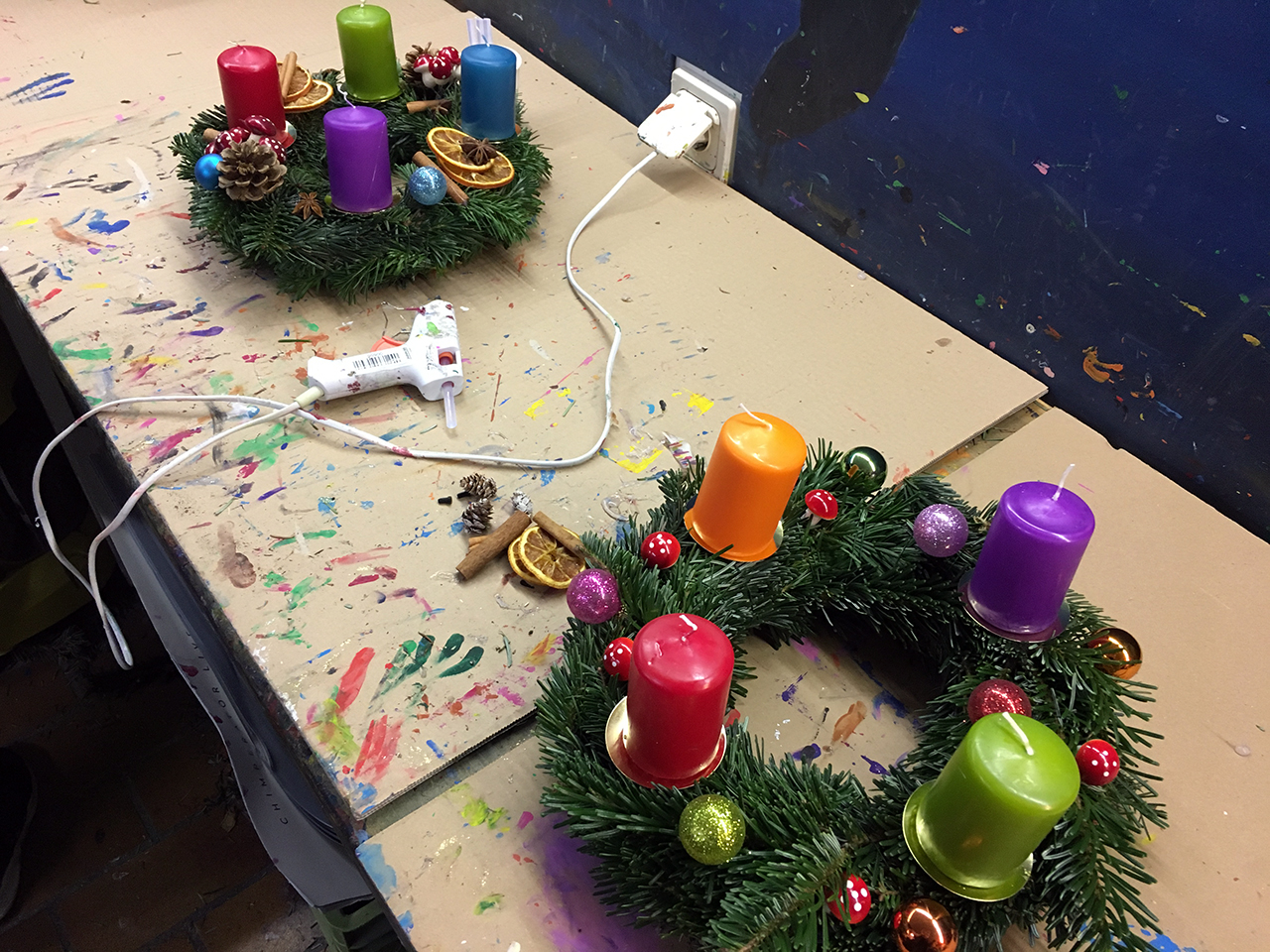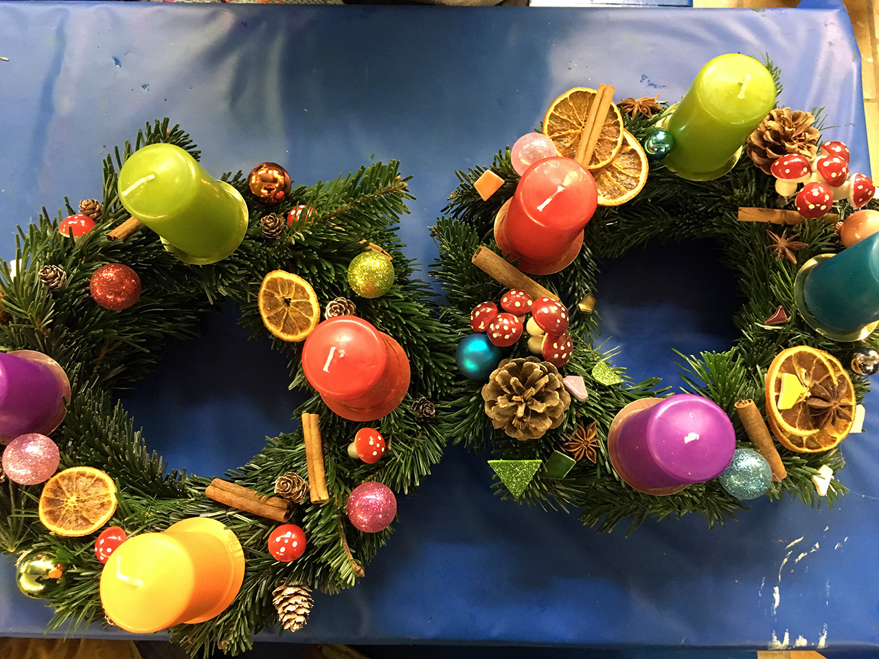 Rund eine Stunde später ist der Adventskranz dann fertig und wir sind völlig entzückt! Auch das Exemplar meiner lieben Kollegin Berit, die mit ihrer Tochter auch zum Basteln gekommen ist, strotzt vor Farbenfrohheit! Ich glaube, wir machen das jetzt jedes Jahr so. Zwar nicht traditionell, aber definitiv ein echter Hingucker!