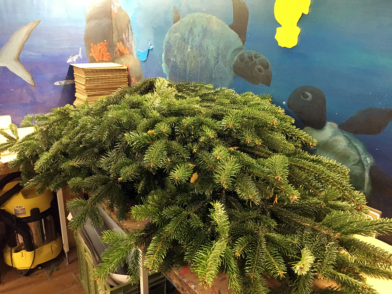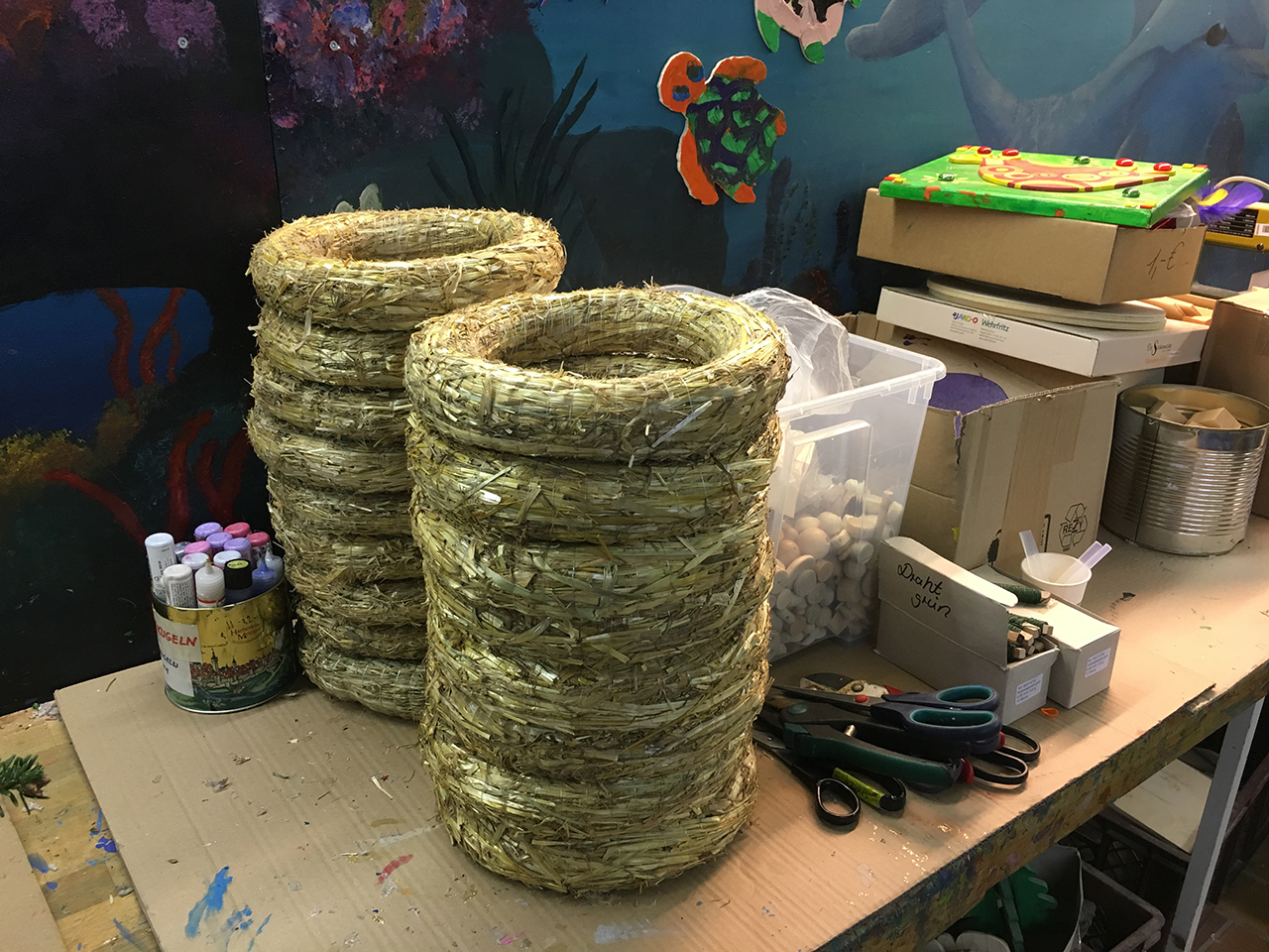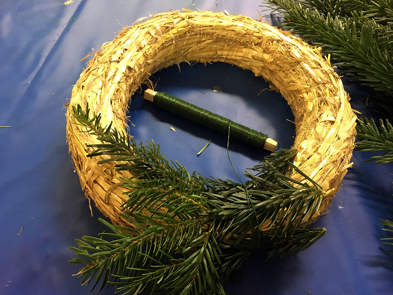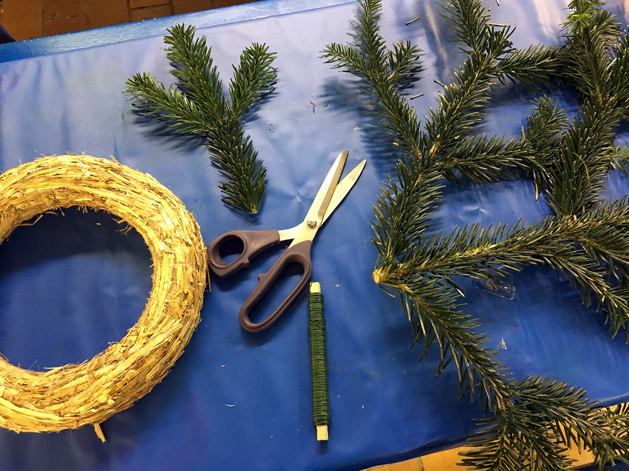 Als wir im Dschungelpalast ankommen, finden wir einen stolzen Berg an Tannenzweigen und zwei Türme aus Strohkränzen vor. Wir suchen uns einen aus, nehmen uns einen großen Zweig vom Stapel und legen als allererstes mit der Schere los. Der riesige Zweig muss nämlich in viele kleine zerteilt werden, um anschließend am Strohkranz befestigt werden zu können. Rund 30 Schnitte später sind wir soweit und wagen uns ans Binden: jetzt heißt es wickeln, wickeln und nochmals wickeln.