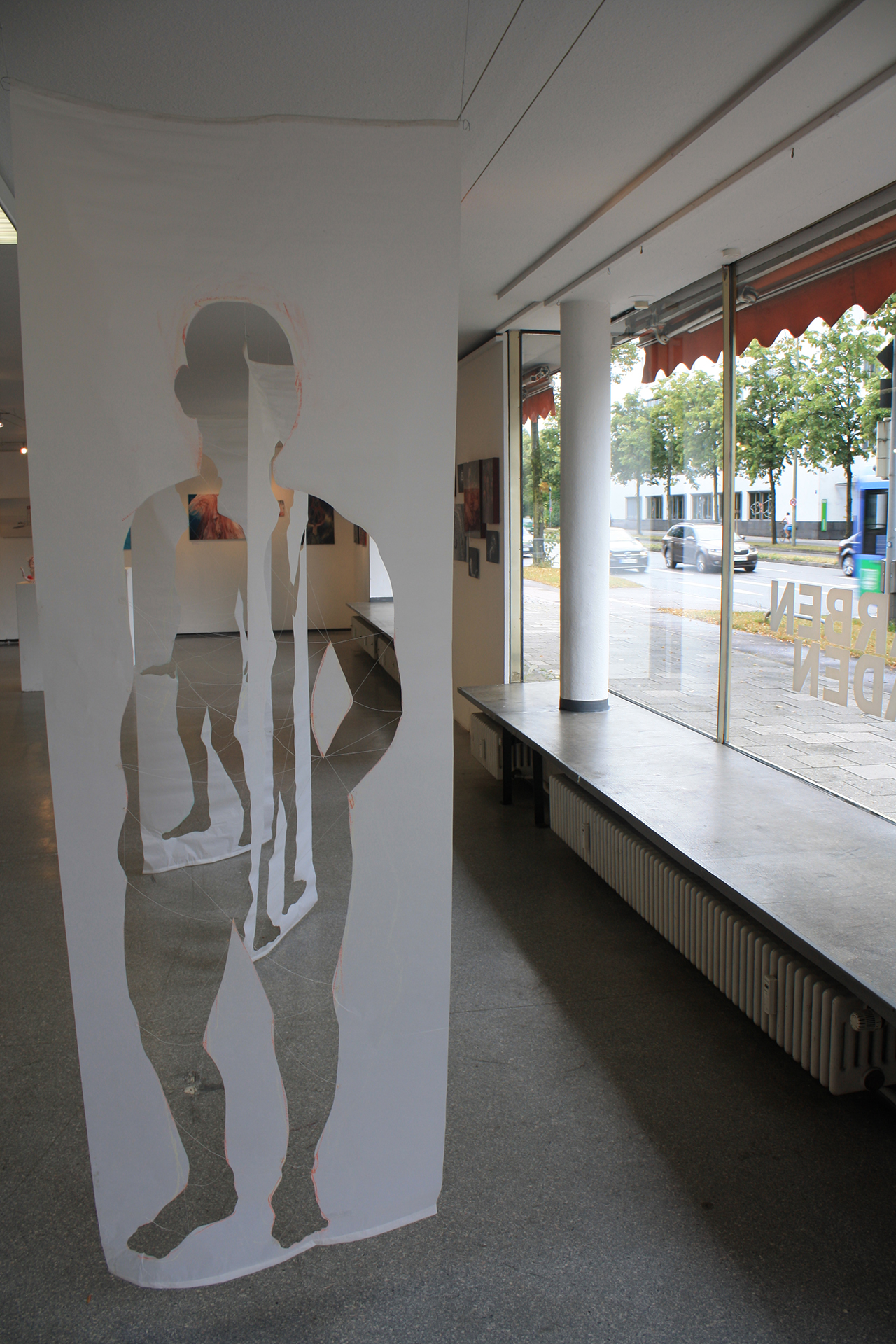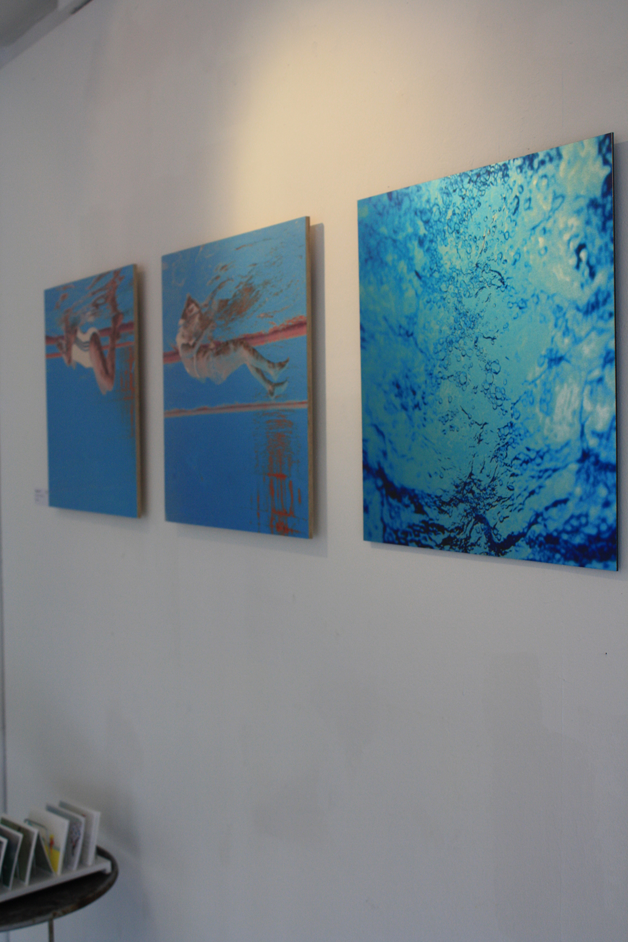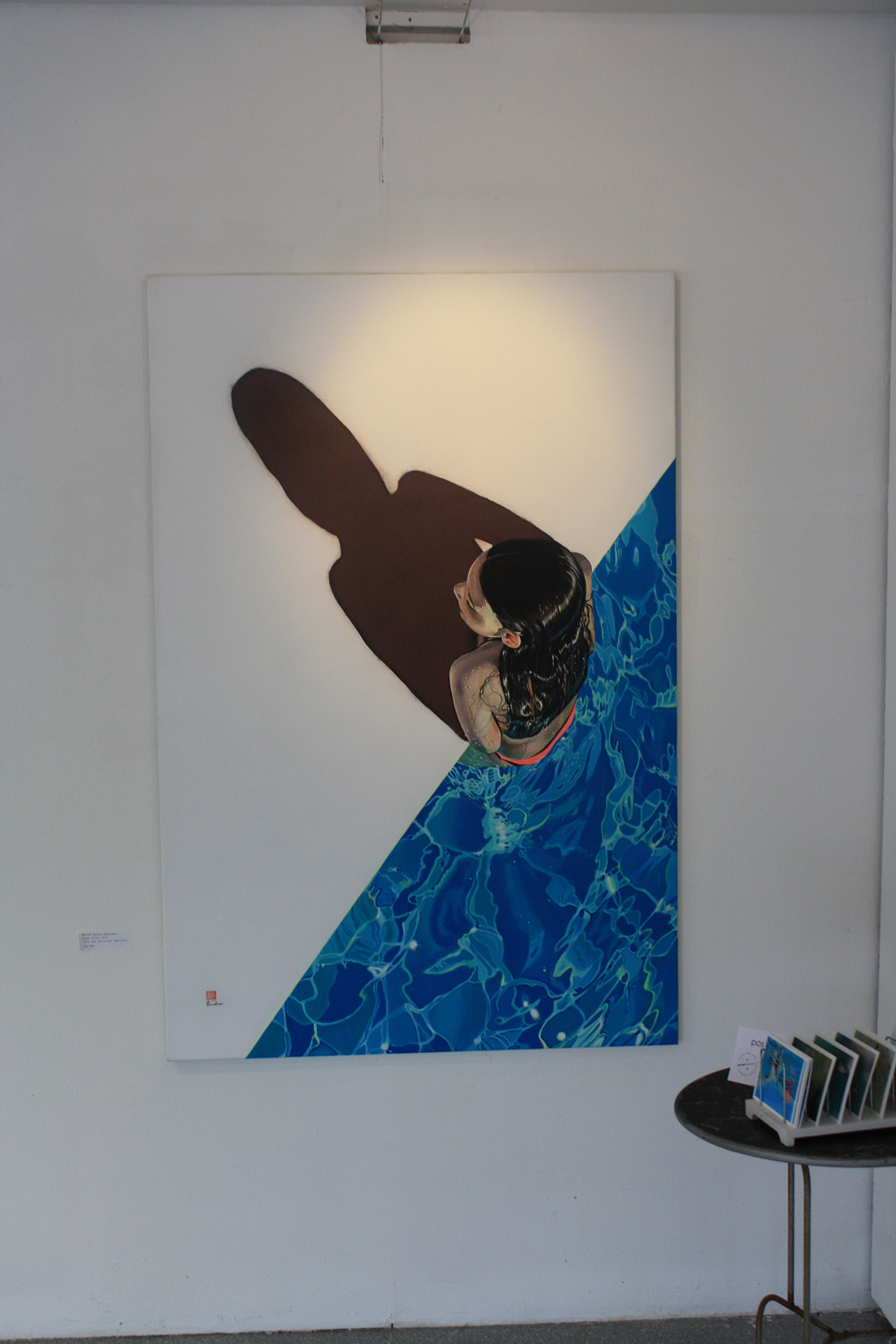 Ich selber habe mir am Freitag eine künstlerische Abkühlung geholt. Empfangen hat mich die liebe Anette Koch. Neben ihr haben auch noch viele weitere Künstler*innen für die Ausstellung Werke vorbereitet. Wenn man sich in dem Raum so umschaut, merkt man, was das Hauptelement bei 30 Grad im Schatten ist: Wasser. Die meisten Werke drehen sich rund um das kühle Nass. Anette hat tolle Ölmalereien von tauchenden Menschen über der Treppe in den Keller und Silhouetten von Personen, die tolle Schattenbilder erzeugen, mitten in den Raum gehängt. Als ob die Schattenspiele selber gerade die verschiedenen Werke bestaunen. Wir folgen ihren Gemälden nach unten in das Untergeschoss vom Farbenladen. Sie erzählt mir von einer völlig abgefahrenen Installation von Mario Klingemann, denn der Künstler arbeitet mit künstlicher Intelligenz. Ein Algorithmus bekommt unterschiedliche Bilder vorgezeigt, teilweise stark verpixelt, und gestaltet aus seinen Erkenntnissen ein eigenes Bild. Man erkennt sofort, wie der Algorithmus „denkt“. Leider funktionierte die Installation heute nicht und Annette Koch erklärt mir nur, wie ich mir das ungefähr vorstellen kann. Allein ihre Erzählung klang total abgefahren.