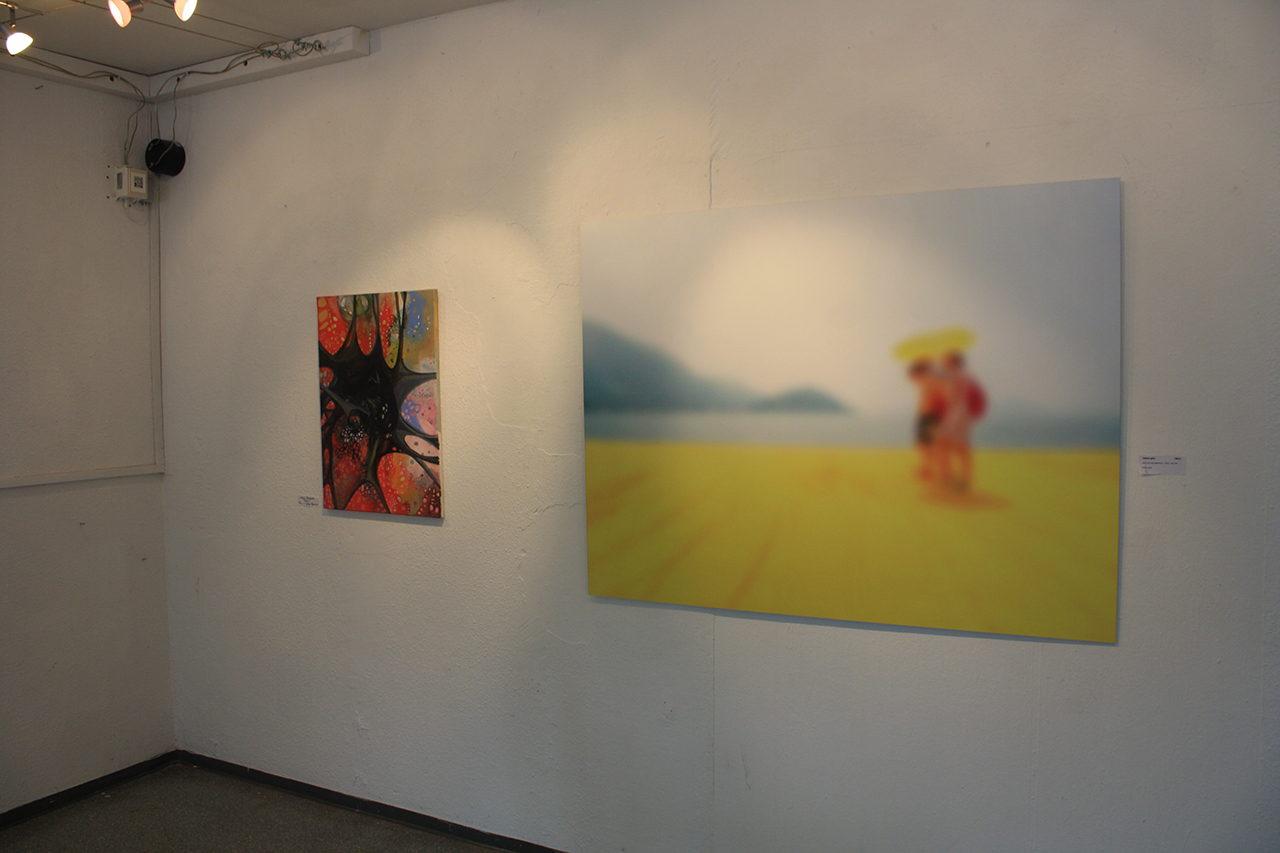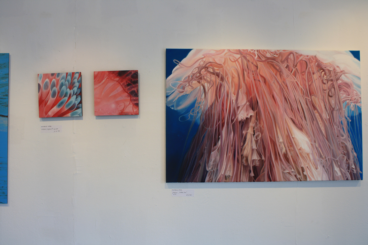 Vollkommen hin und weg von den Beamern erblickte ich ein paar kleine Gestalten in weiß und blau – die Skulpturen von Alexandra Lukaschewitz. Ein kleines schneeweißes Fabelwesen mit großen blauen Kulleraugen starrte mich mitten im Farbenladen an und zog mich in seinen Bann. In seiner linken Hand hielt es einen kleinen süßen Oktopus, und mit jedem Blick in seine Richtung verliebte ich mich ein klein wenig mehr in das kleine Kerlchen. Als ich so weiter durch die Ausstellung ging, ließ mich ein Gemälde von Boris Storz an der Stärke meiner Brillengläser zweifeln. Ich blinzelte mehrmals, bis mir ganz schummrig vor Augen wurde. Eine riesengroße gelbe und baue Fläche mit einigen fleischfarbenen Flecken stand mir gegenüber. Ein wenig rot und weiß war auch noch darunter gemischt. Die ganze Strand-Szenerie verwirrte mit seiner verschwommenen Art und Weise den visuellen Teil meines Gehirns. Ich wollte lange drauf schauen, um Genaueres zu erkennen, aber länger als zehn Sekunden ging nicht – da wurde mir schon wieder schwindelig. Aber auch nicht schlimm, ich blickte weiter nach rechts, wo mich ein kühles Swimmingpool-Türkis anlachte. Mehrere junge Frauen tauchten auf den Gemälden durch eisblaues Wasser. Die Gemälde von Brigitte Yoshiko Pruchnow faszinieren mit ihrer wahnsinnig realistischen Spiegelung der Sonne im Wasser auf den Gesichtern junger Frauen. Als ob man mit einer Unterwasserkamera einen perfekten Schnappschuss für ein perfektes Instagram-Bild aus dem Urlaub schießt, für das einen alle Zuhausegebliebenen beneiden. Zum Glück sind die jungen Mädels nicht den realistischen Quallen von Michaela Wühr begegnet. Die in rosa und grau schillernden Medusen erblickt man aus jedem Winkel des Raumes. Beobachtet man das Bild lange genug, erkennt man die kleinen Feinheiten, mit denen Wühr jeden einzelnen Tentakel auf die Leinwand bringt. Und was jeder von uns denkt, wenn uns im See eine glitschige Alge am Fuß berührt, könnt ihr hier auf dem Gemälde von Maria Stelmakh sehen: