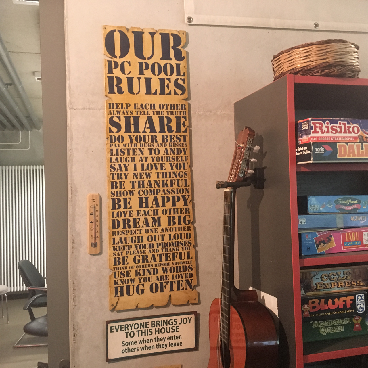 Deshalb ist der Raum erst einmal entscheidend. Im Jugendtreff PC-Pool der Feierwerk Südpolstation bemühe ich mich zu allererst für eine heimelige Atmosphäre. Damit sich meine Kursteilnehmer*innen bei uns geborgen aufgehoben und fast wie zu Hause fühlen. Verschiedene Bilder, Gegenstände, witzige Schilder oder verrückte, schräge Skulpturen im PC-Pool Raum regen bei hoffentlich manchen unserer Besucher die ersten Phantasien und Gedanken an. Inspirationen! – Unser Jugendtreff ist keine Schule! Es werden hier keine Noten vergeben. Niemand steht hier bei uns unter irgendwelchem Erfolgsdruck. Auch ich bin kein Lehrer!