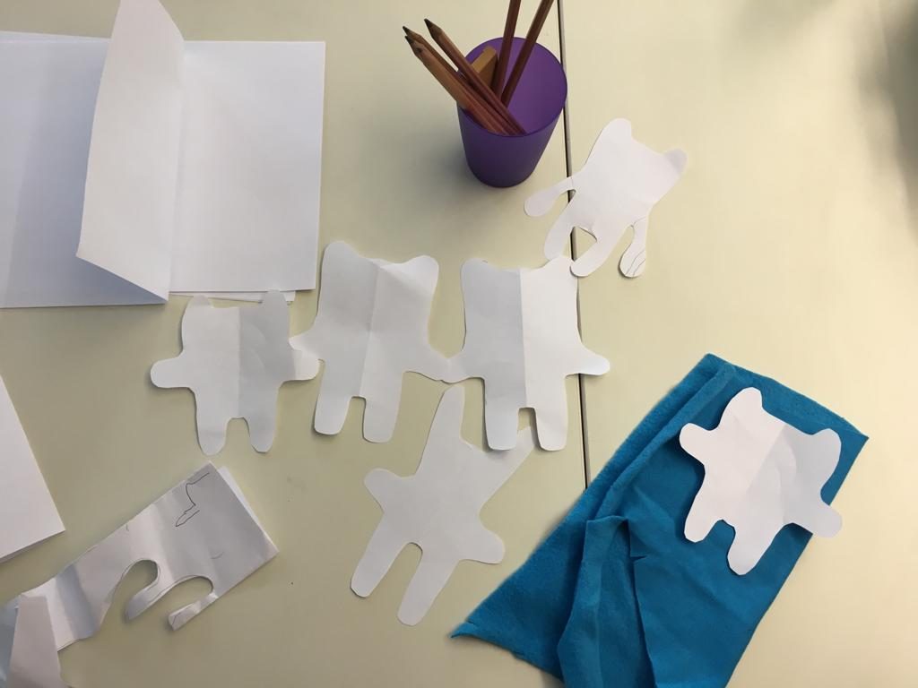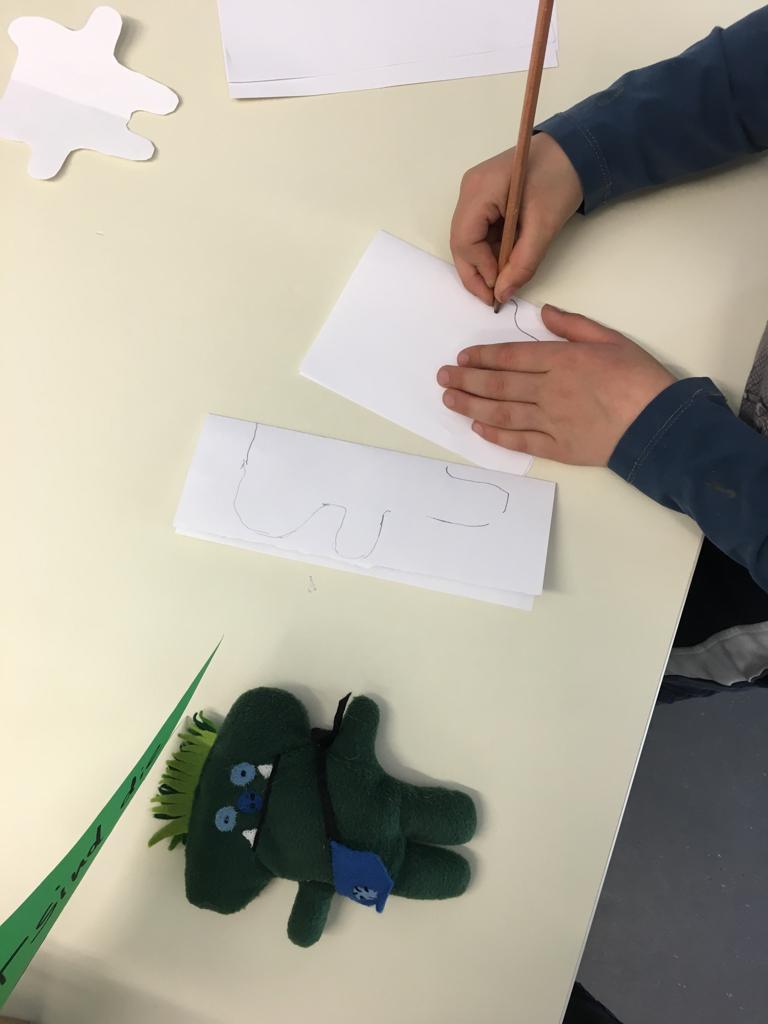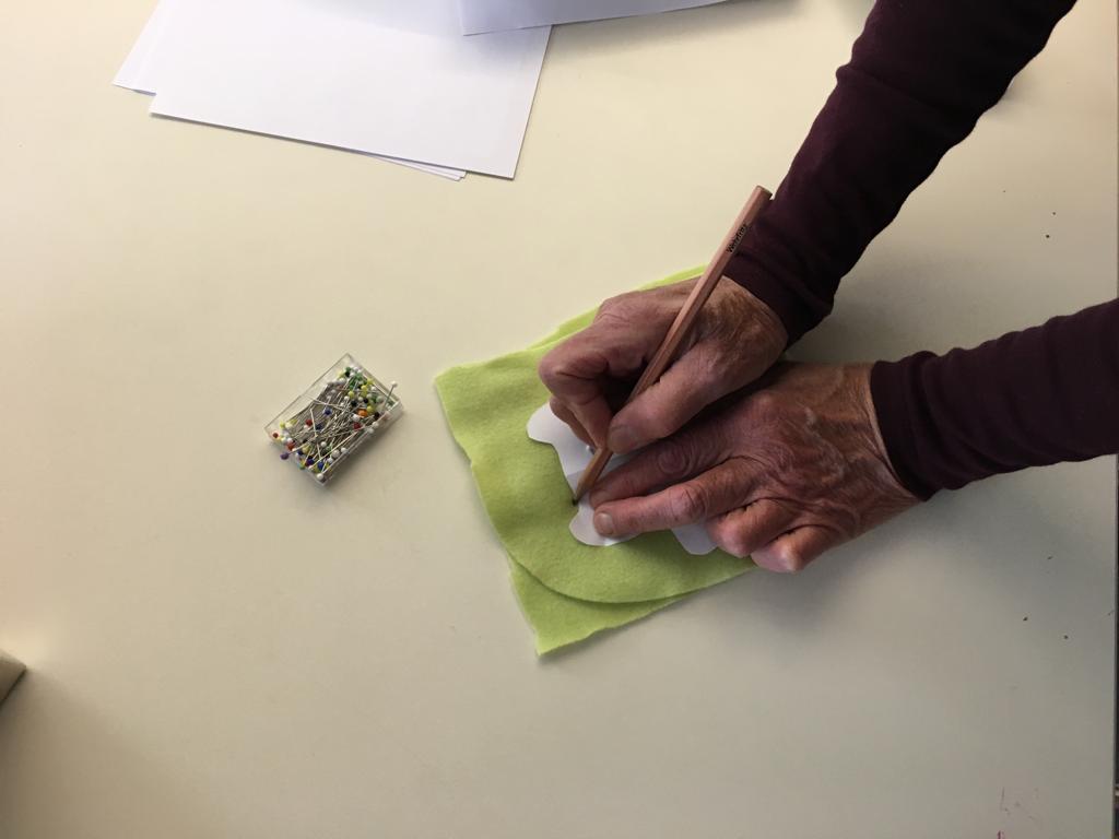 Der erste Schritt beim Muzziguno machen bestand darin, sich das Schnittmuster auszusuchen. Das heißt, die Form und Größe festzulegen, die das Monster haben soll, und dann natürlich die Farbe des Stoffes. Die Vorlage wurde dann mit Stecknadeln auf den Stoff gesteckt, damit nichts verrutschte, und danach mit Bleistift aufgezeichnet.