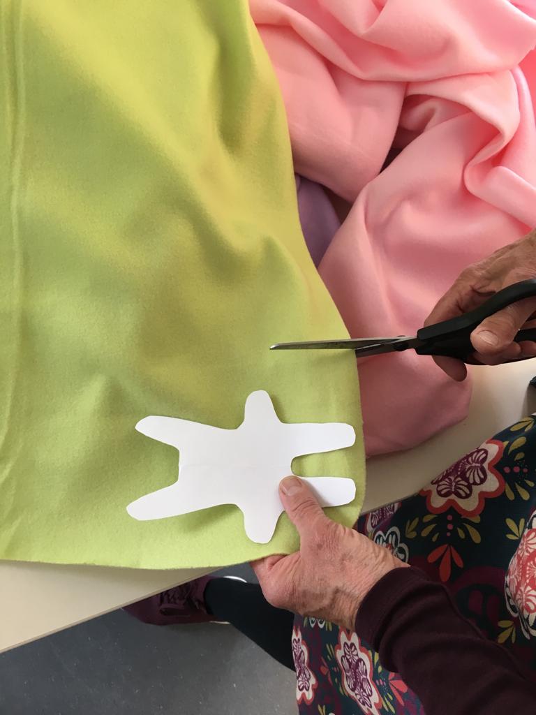 Danach nähte uns Sabine mit der Nähmaschine an der eingezeichneten Linie entlang. Das Wichtige bei diesem Schritt war, ein kleines Loch oben zwischen den Ohren frei zu lassen. Das diente dazu, den Muzziguno umzustülpen, sobald wir den Rest des Stoffes weggeschnitten hatten. Danach wurde er mit Watte ausgestopft.