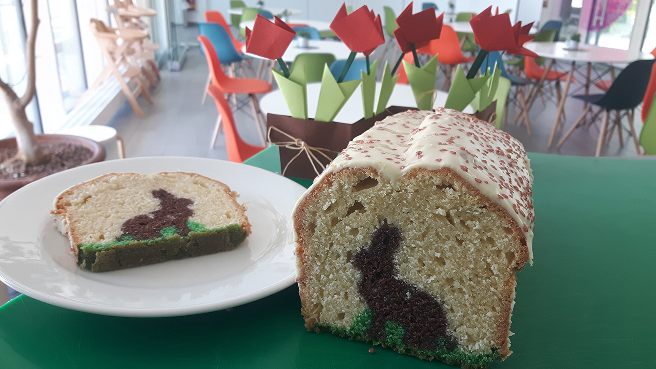 Der Hasenkuchen lässt sich sehr einfach variieren. Die braunen Hasen könnt ihr beispielsweise auch durch grüne Tannenbäume ersetzen. Dazu beim ersten Teig den Kakao weglassen, mit grüner Lebensmittelpaste einfärben und Tannenbäume ausstechen. Probiert’s aus! Auf die Häschen, fertig, los!