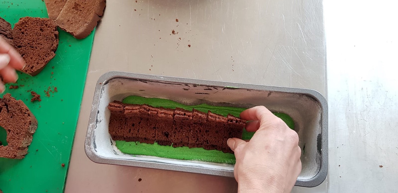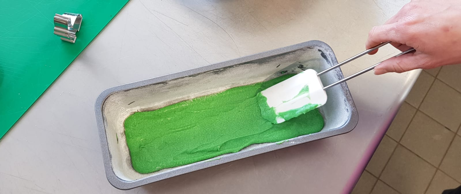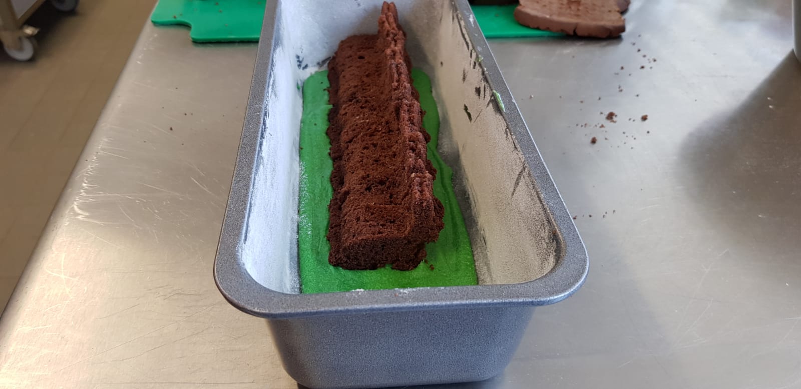 Für den zweiten Teig wie in Schritt 1 und 2 vorgehen, aber den Kakao weglassen. Etwa 4 EL von dem angerührten Teig in eine kleine Schüssel geben, mit etwas grüner Lebensmittelpaste einfärben und den Boden der Kastenform damit bedecken. Je mehr Paste ihr dazu gebt, umso intensiver wird die „Wiese“. Der restliche Teig kann erstmal beiseite gestellt werden.