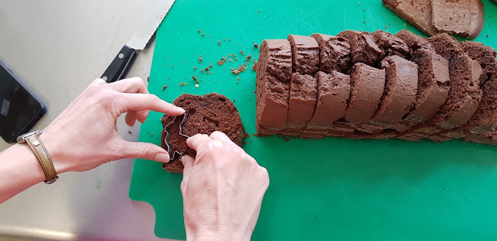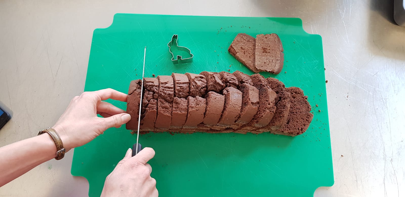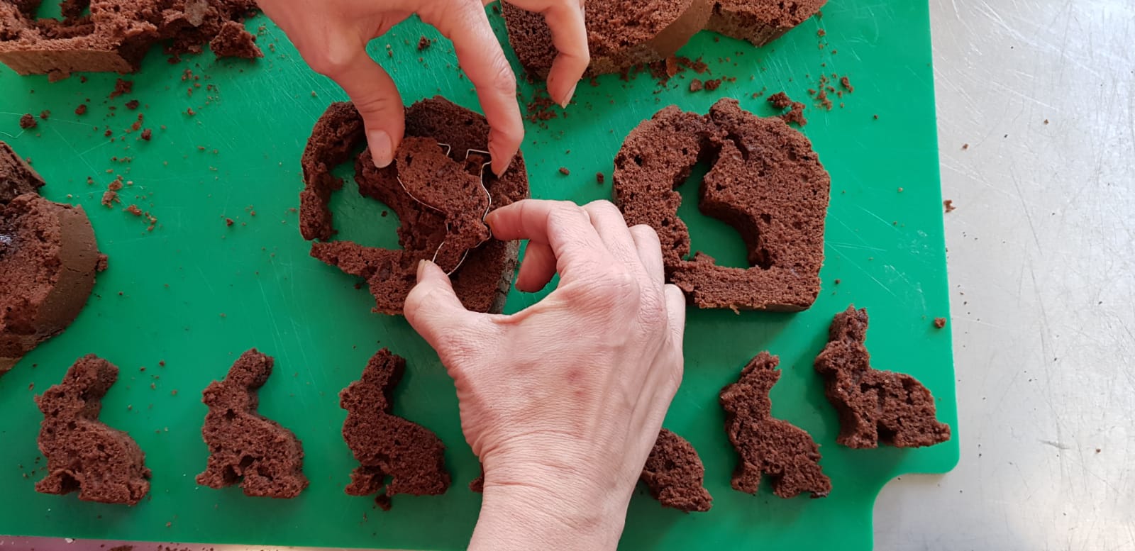 Die beiden Enden des ausgekühlten Schokokuchens dünn abschneiden. Den restlichen Kuchen in ca. 2 cm dicke Scheiben schneiden und daraus Häschen ausstechen. Aus den größeren Scheiben können ggf. auch 2 Hasen ausgestochen werden. Es kann passieren, dass das ein oder andere Häschen beim Ausstechen in die Brüche geht. Aber keine Sorge wegen der Reste, die sind schneller weg als gedacht.