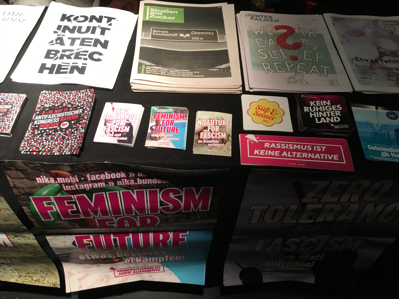Auf dem Rage against Abschiebung bzw. dieses Jahr „Rachel against Abschiebung Festival“ ging es aber natürlich noch um viel mehr als nur gute Musik. An verschiedenen Ständen konnte man sich über Flüchtlingspolitik (zum Beispiel beim Kollektiv „Die Pastinaken“) informieren und auch in liebevoller Handarbeit bedruckte Shirts, Taschen und Hipster Bags kaufen, um das Festival zu unterstützen. Denn: Der Erlös aus Eintritt und Merch ging ungefiltert an den Flüchtlingsrat über, der das Geld wiederum gut für seine ganze Arbeit gebrauchen kann. Alle Bands verzichteten daher an dem Abend auf ihre Gage. Man konnte also gleich zwei gute Sachen miteinander kombinieren: Neue Bands entdecken und sich klar gegen Rassismus positionieren. Protest at its best quasi. Denn nicht nur Rachel ist against Abschiebung, auch über 350 weitere Unterstützer*innen haben sich mit ihrem Gesicht auf der Webseite abgebildet und so gezeigt: „Rassismus? Mit uns NICHT!“ Und daher schmückten auch die Gesichter eines jeden Unterstützers die Wände des Feierwerks.