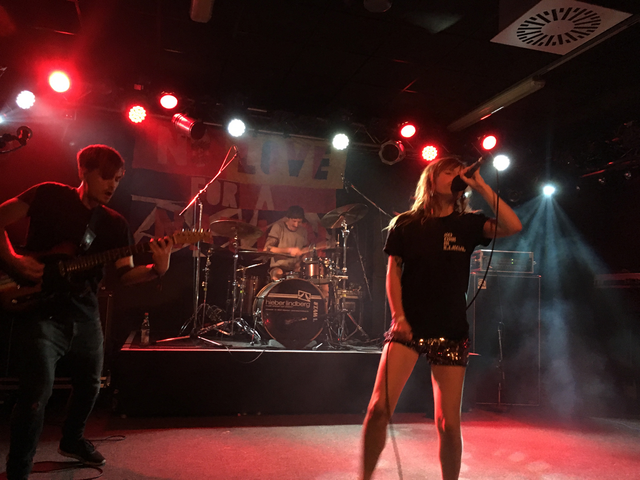 Last but not least… Wir sprachen ja von DEM Highlight des Abends. Auch wenn man sich nicht festlegen sollte (schließlich darf man auch kein Lieblingskind benennen), hatten wir uns insgeheim auf diese Band am meisten gefreut: Petrol Girls aus UK! Die Band selbst bezeichnet sich als „Raging Feminist Post Hardcore from the UK and Austria.“. Das Raging wurde dann auch sofort durch das rabiate Geschrei von Sängerin Ren Aldridge unterstrichen. Kann ihr keiner verübeln, das Patriachat macht halt auch einfach jede*n sauer. Darüber hinaus gab es aber auch eine Vielfalt an komplexen Melodien und schroffen Rhythmen. Alles in einem ein stimmiges Bild. Und wer sich fragt, woran die Band erinnert, es dürfte mit großer Wahrscheinlichkeit Refused sein. Wobei man auch einen Vergleich zu Bikini Kill nicht ganz ausschließen kann. Passt aber insofern wunderbar, da sich die Band gerne selbst mit eben diesen Idolen vergleicht.