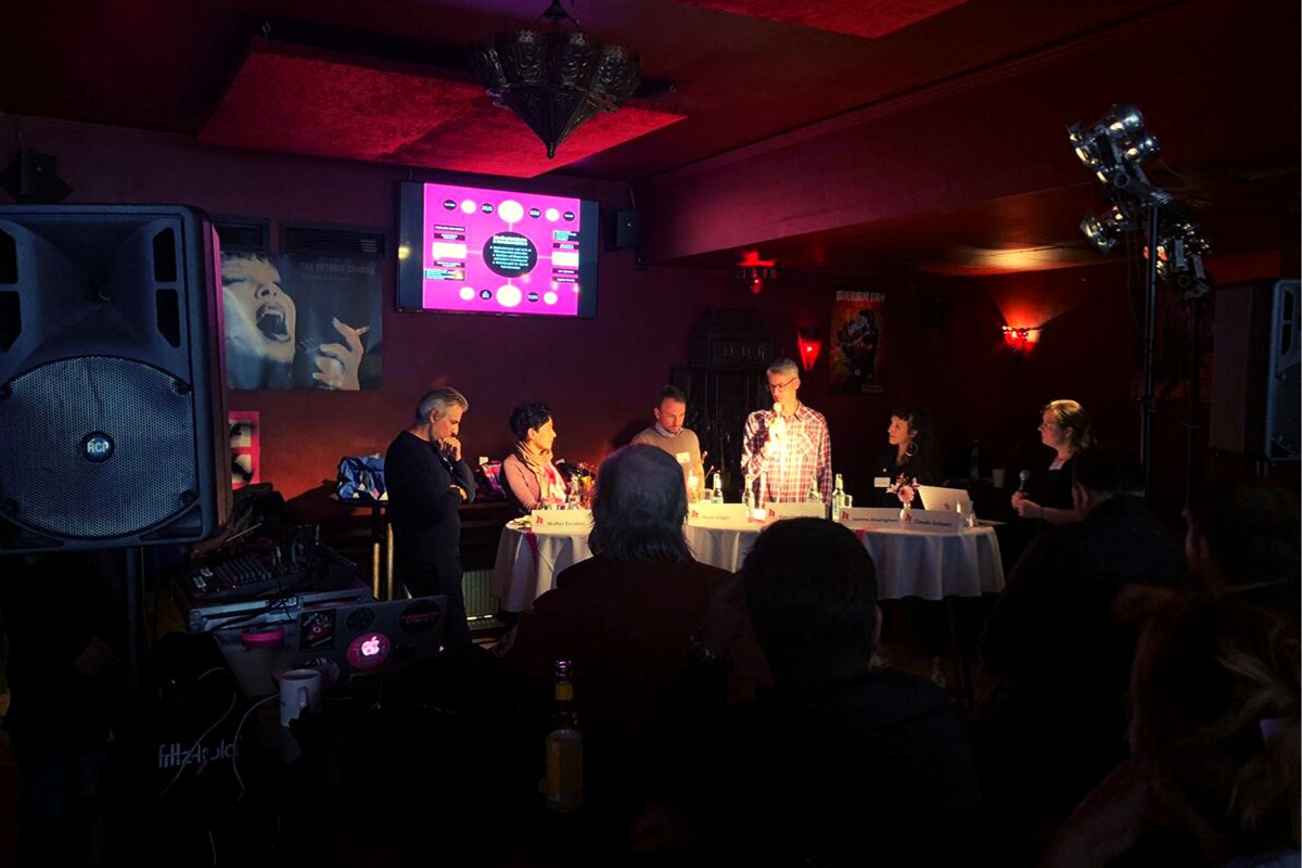 Beschwingt geht es daher weiter zum Panel über „Integrierte Stadtentwicklung“, wo ich auch Vroni wieder treffe. Hier berichtet u.a. Florian von der AG Urban, wie in Berlin mittels Clubkataster versucht wird, Bauabsichten der Stadt und Livemusik-Stätten in eine große Karte zu integrieren, um Bürger*innen-Beteiligung zu begünstigen und auch Gastronom*innen frühzeitig in den Stadtplanungsprozess einzubinden. Heute jagt ein interessanter Diskurs den anderen, und so geht’s beim nächsten Termin um „Teilhabe-Strategien für Smart Music Cities“. In dieser Runde stellen u.a. Vertreter*innen aus Hannover, Berlin und Mannheim ihre Konzepte vor und initiieren so einen munteren Austausch über die verschiedenen Wege einzelner Städte, Akteure* der Musikindustrie zu vernetzen. Danach sind wir mit einer Kollegin aus Frankfurt verabredet, denn wir wollen kurz zu „Meet the Mannheimers“ der Popakademie Baden-Württemberg im Indra, bevor es dann zu einem weiteren Spontankonzert von Deichkind am Millerntor Stadium geht. In der Großen Freiheit lassen wir uns anschließend vom Bremer Doom-Duo Mantar beschallen und feiern mit der bayerischen Elektropunk-Band Frittenbude den Abschluss des Abends!