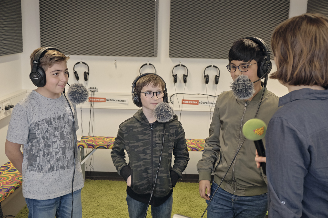 Um die 90 Schüler*innen von verschiedenen Schulen und Klassen begrüßen wir mit einem Spaziergang über die Weltkarte. Sie sollten dort einen Stein platzieren, wo die Kleidungsstücke, die sie tragen, produziert werden. Direkt im Anschluss enthüllt Anna, die selbst in Bangladesh und Indien mit den Menschen gesprochen hat, die Produktionsbedingungen. Welche Leute machen Kleider? Vor diesem Hintergrund werden wir tätig. Im Radio interviewen die Schüler*innen Anna und spezialisieren sich noch einmal auf einzelne Aspekte oder Personen.