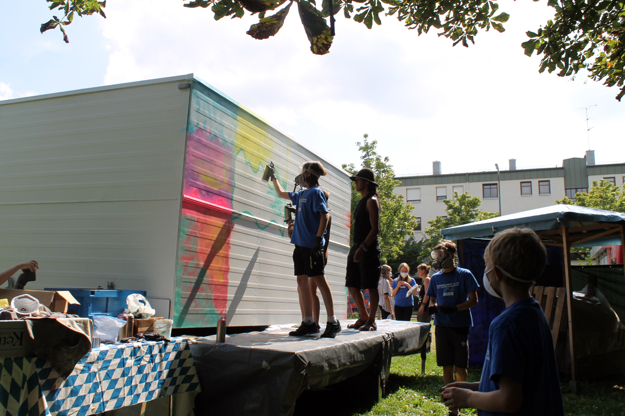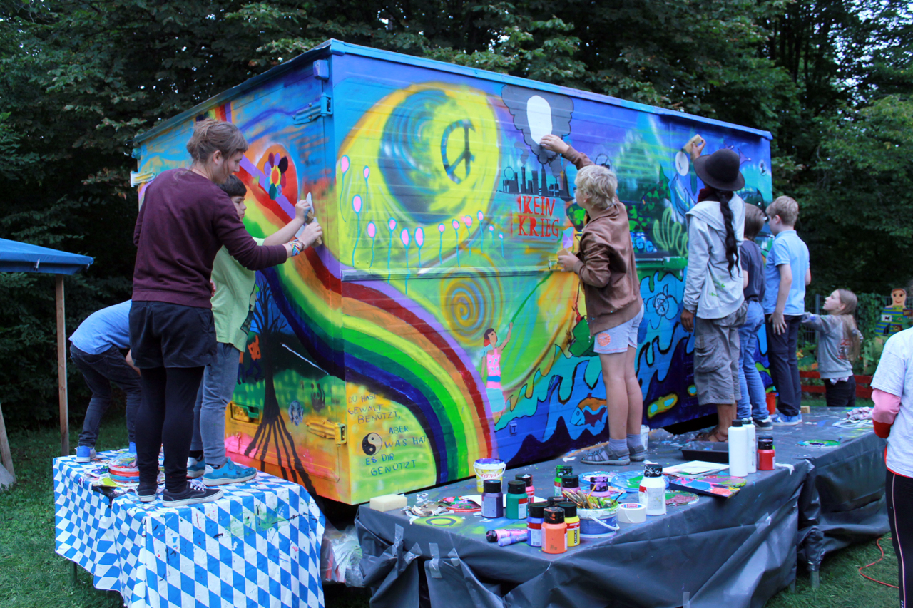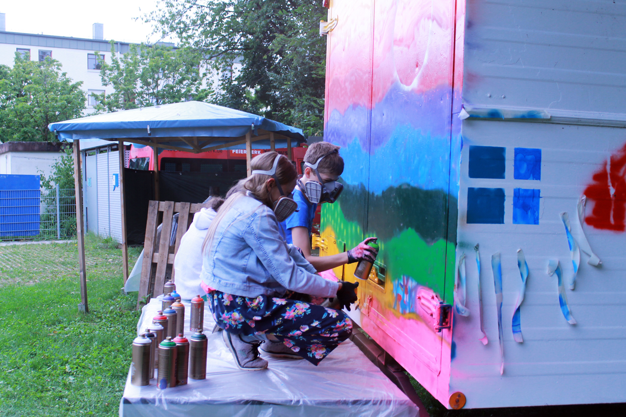 Wir haben einen Bauwagen organisiert, hergerichtet und umgebaut, der von außen passend zum Thema bemalt bzw. besprayt wird. Und hinterher soll der Wagen als manchmal mobiles und sonst bei uns in der Feierwerk Südpolstation stehendes Kinderatelier dienen, in dem die Kinder ihre Kunstwerke ausstellen können. Wir haben jetzt Halbzeit, die erste Woche ist rum und der Bauwagen zur Hälfte fertig. Es war anstrengend, hat aber auch super viel Spaß gemacht. Der Künstler Jorge hat die Kinder immer wieder mal von seiner Heimat in Südamerika begeistert. Sie haben es gemeinsam geschafft, ein geniales Street Art Kunstwerk zu schaffen. Und wenn das kein gebührender Abschied von meinem wunderbaren Jahr hier als FSJ-lerin ist, dann weiß ich auch nicht.