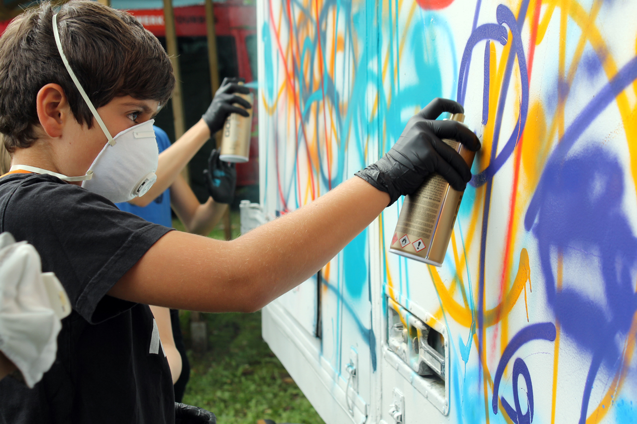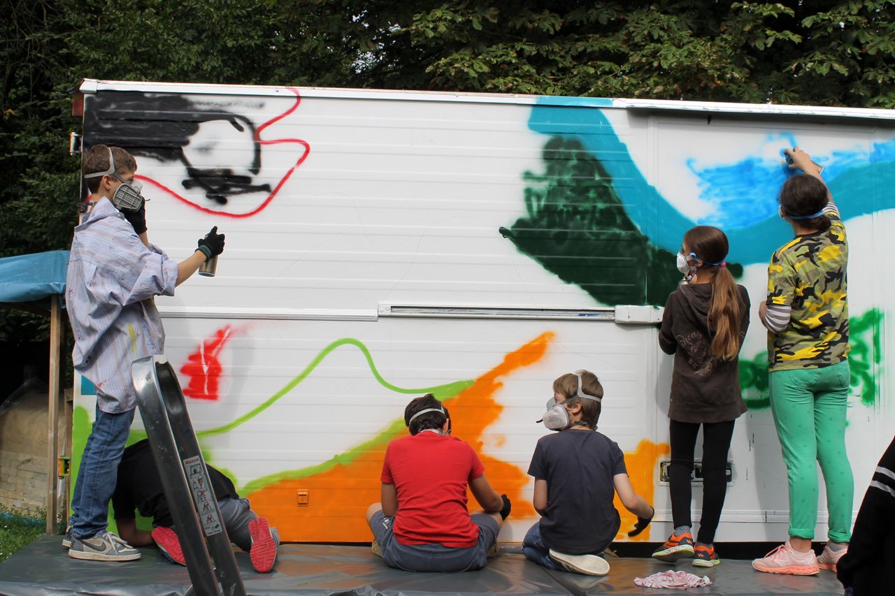 Wir besprayen einen Bauwagen