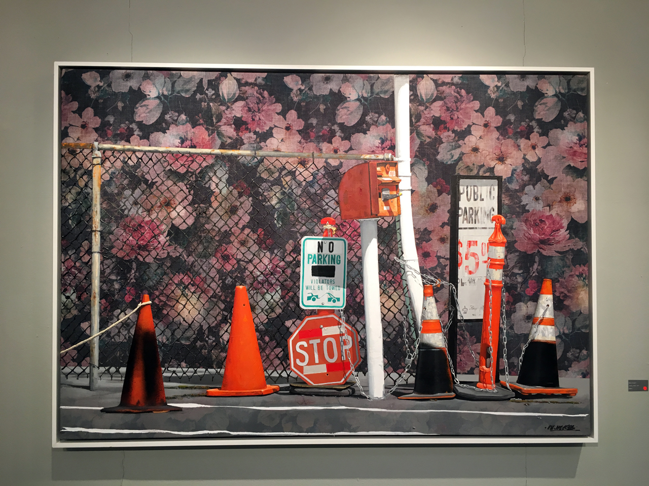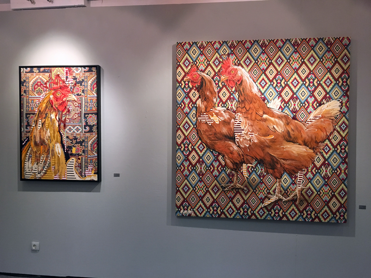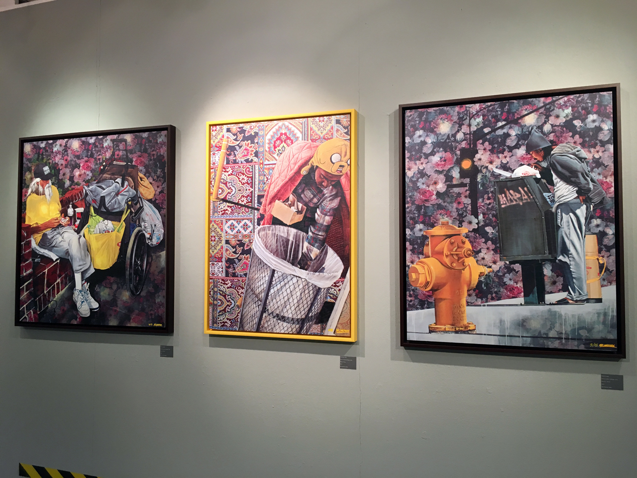 Wie man auf meinen Bildern sieht, verwende ich gerne gemusterte Materialien und Gewebe, wie jetzt beispielsweise auch diese Blumen auf dem Ausstellungsflyer. Das zieht sich dann durch die ganzen Bilder durch. Und auch ein Mix aus Arbeitsmaterialien, also sowohl Sprühdose, als auch Acrylfarbe, als auch mal Stifte oder Marker.