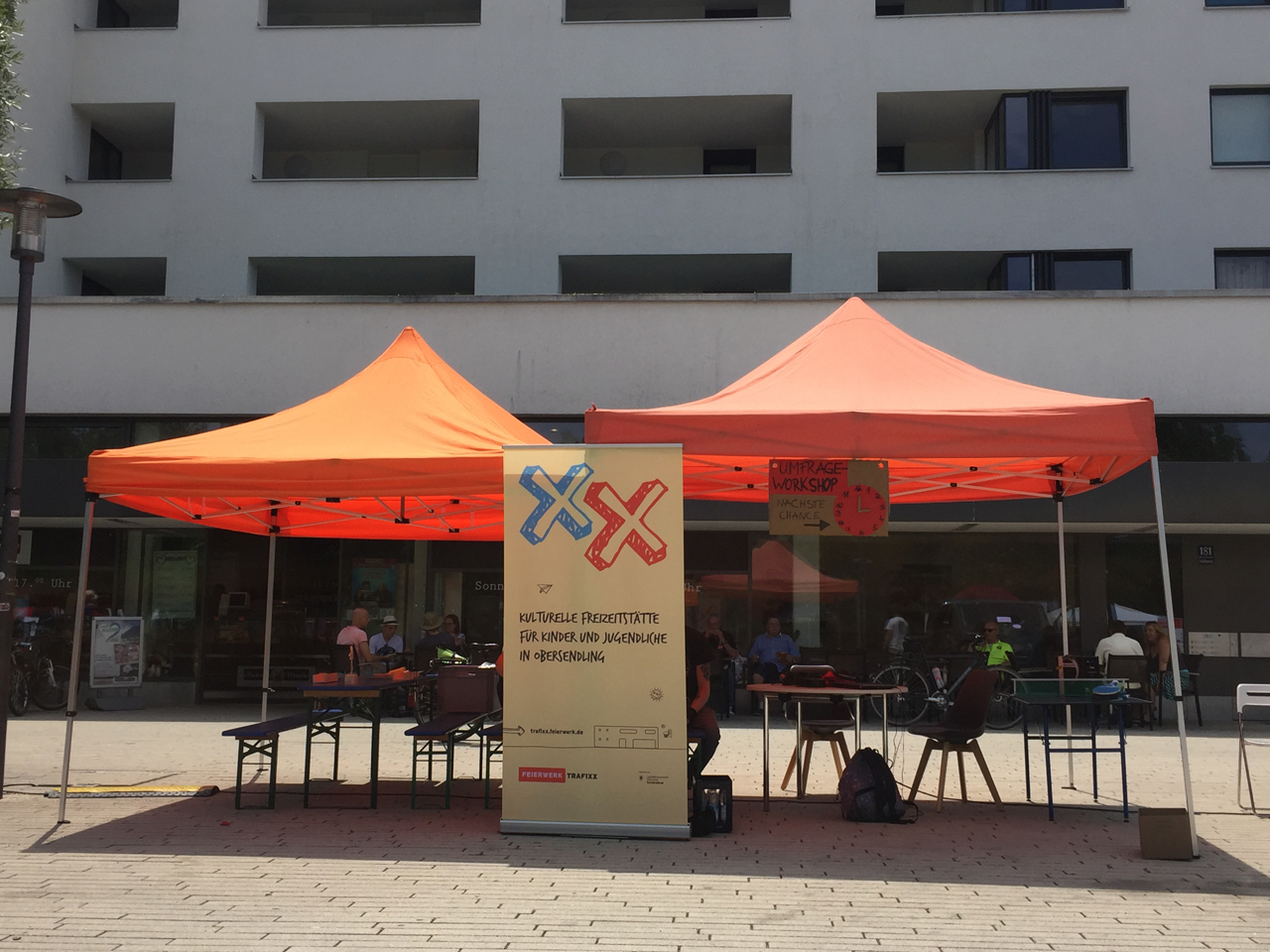 Beim Stadtteilfest REGSAM in Thalkirchen war auch das Feierwerk Trafixx vor Ort. Die Kinder konnten sich am Basteltisch und bei einem Umfrage-Workshop kreativ austoben. Auch eine Tischtennisplatte stand zum Austoben bereit. Von 14 bis 19 Uhr war am Stand jeder herzlich willkommen!