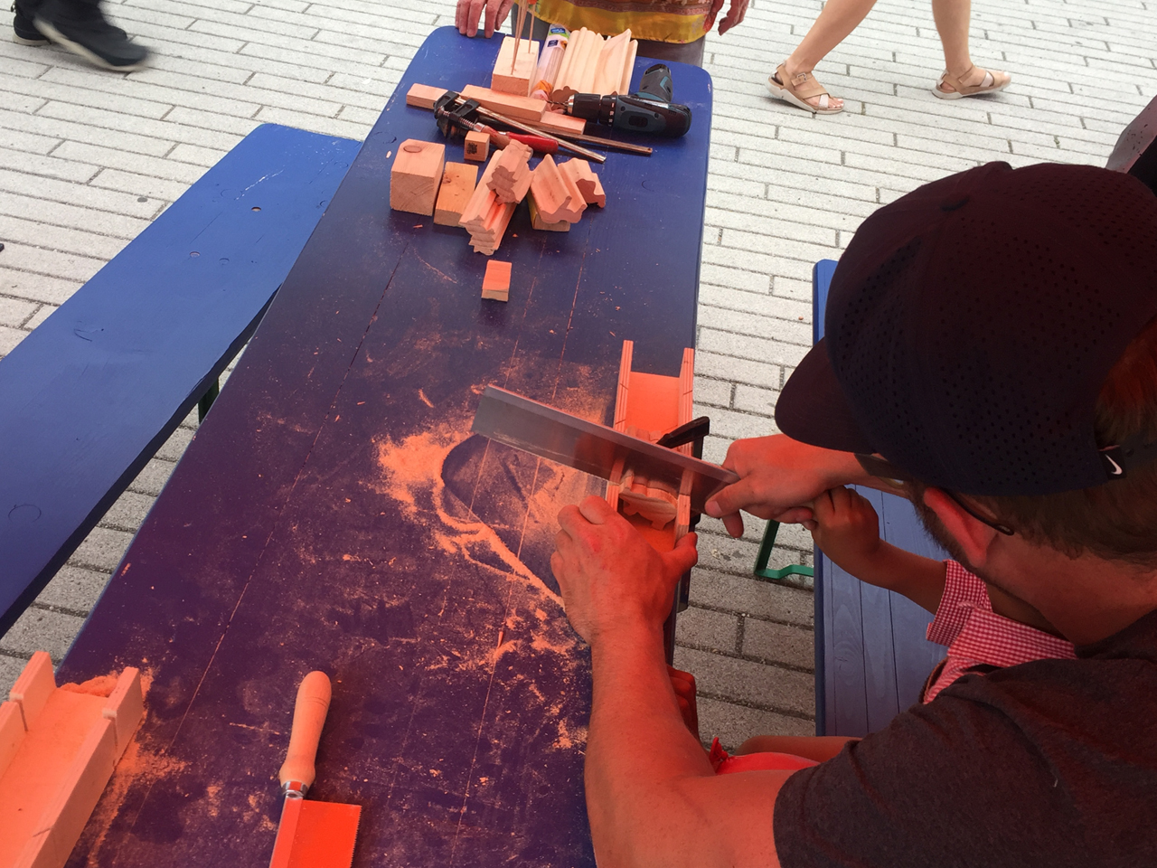Es ist Samstag 16 Uhr, 25 Grad warm und unter dem orangefarbenen Stand vom Trafixx fliegen Holzspäne durch die Gegend. Der Grund: Elefanten, Löwen und andere Wildtiere aus Holz werden ausgesägt, gefeilt und bemalt. Ein paar Meter weiter rechts laufen zwei Erwachsene und zwei Kinder um eine sechzig mal hundertzwanzig Zentimeter große Tischtennisplatte. Der Ball hüpft von links nach rechts. Dann fällt er auf den Boden und rollt weg. Die Erwachsenen keuchen und wischen sich den Schweiß von der Stirn.