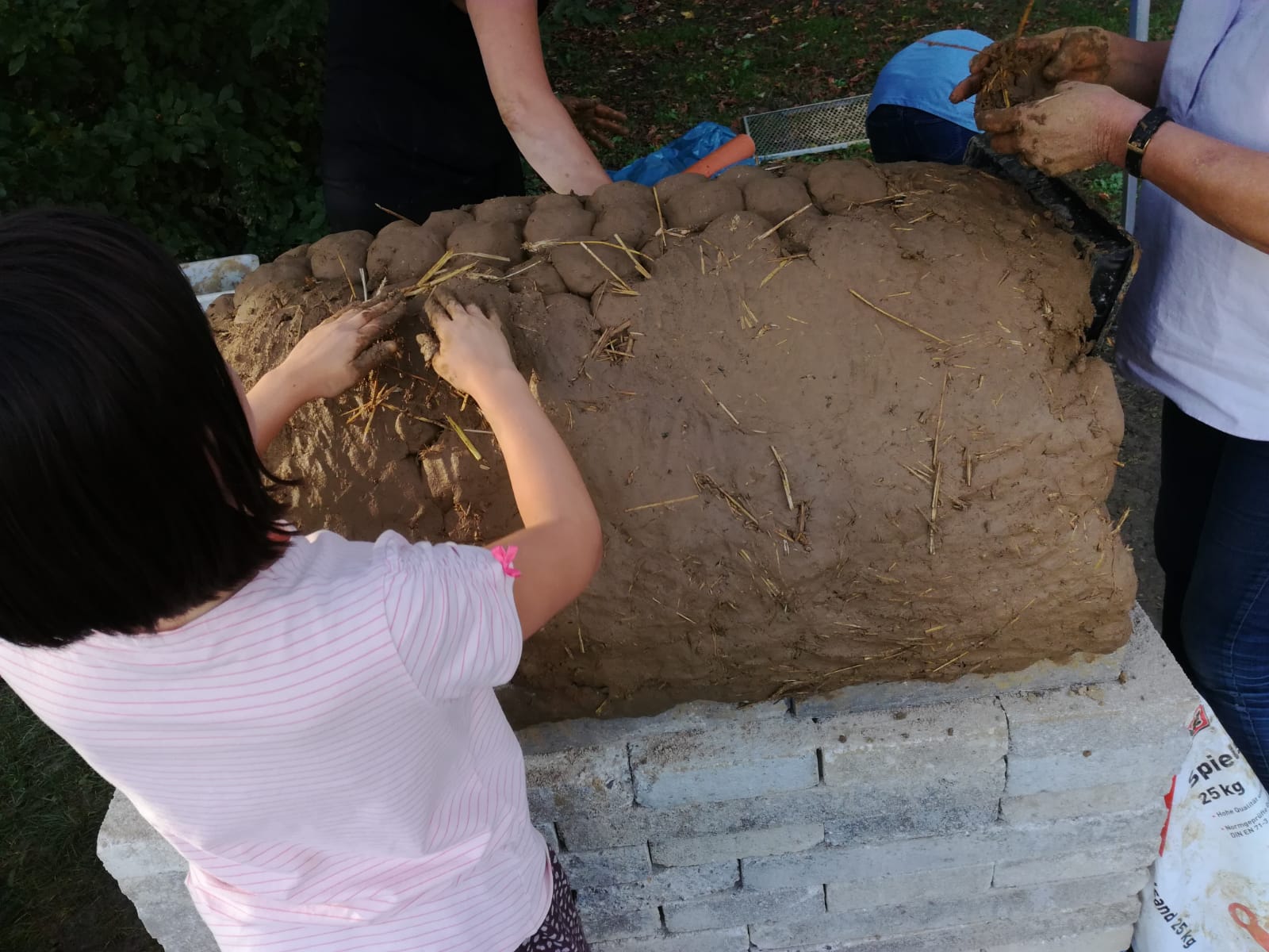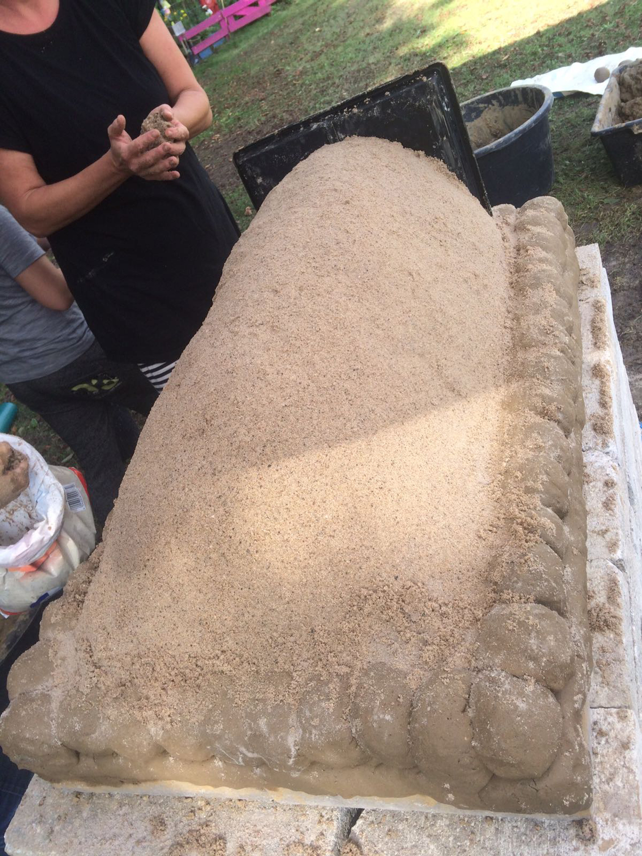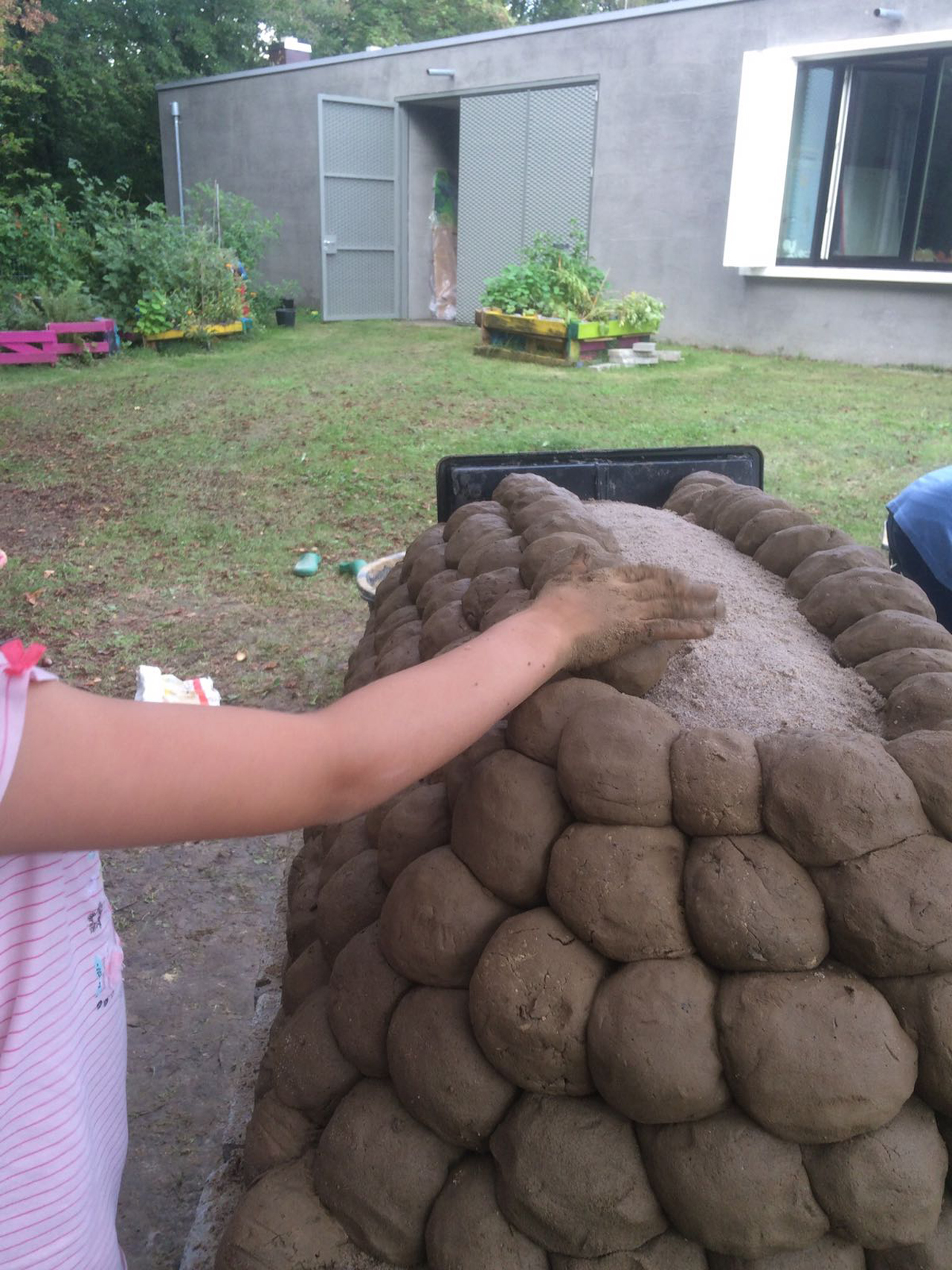 Nach einer Woche treten, kneten, wieder sieben und nochmal stampfen, wieder alles abwaschen, noch ein bisschen mehr Sand und ein wenig Wasser und wieder stampfen, wussten wir, wie die perfekte Konsistenz sein musste. Denn der Lehm darf weder zu trocken noch zu nass sein. Jetzt endlich, nach einer Woche, kam die erste glatte Schicht auf unseren Sockel – der Boden des Ofens. Jetzt ging es ans Kugeln formen. Erst der Rand, und dann kamen immer mehr dazu. Um die richtige Form zu bekommen bauten wir in der Mitte eine Kuppel aus Sand. Schicht um Schicht entstand unsere Kuppel aus Lehmkugeln. Jetzt schnippelten wir noch jede Menge Stroh. Das musste zum Schluss auch noch in den Lehm. Und wieder kneten, treten und stampfen. Diese „Pampe“ strichen wir als äußere Schicht auf den Kugelturm, damit die Hitze besser im Ofen bleibt.