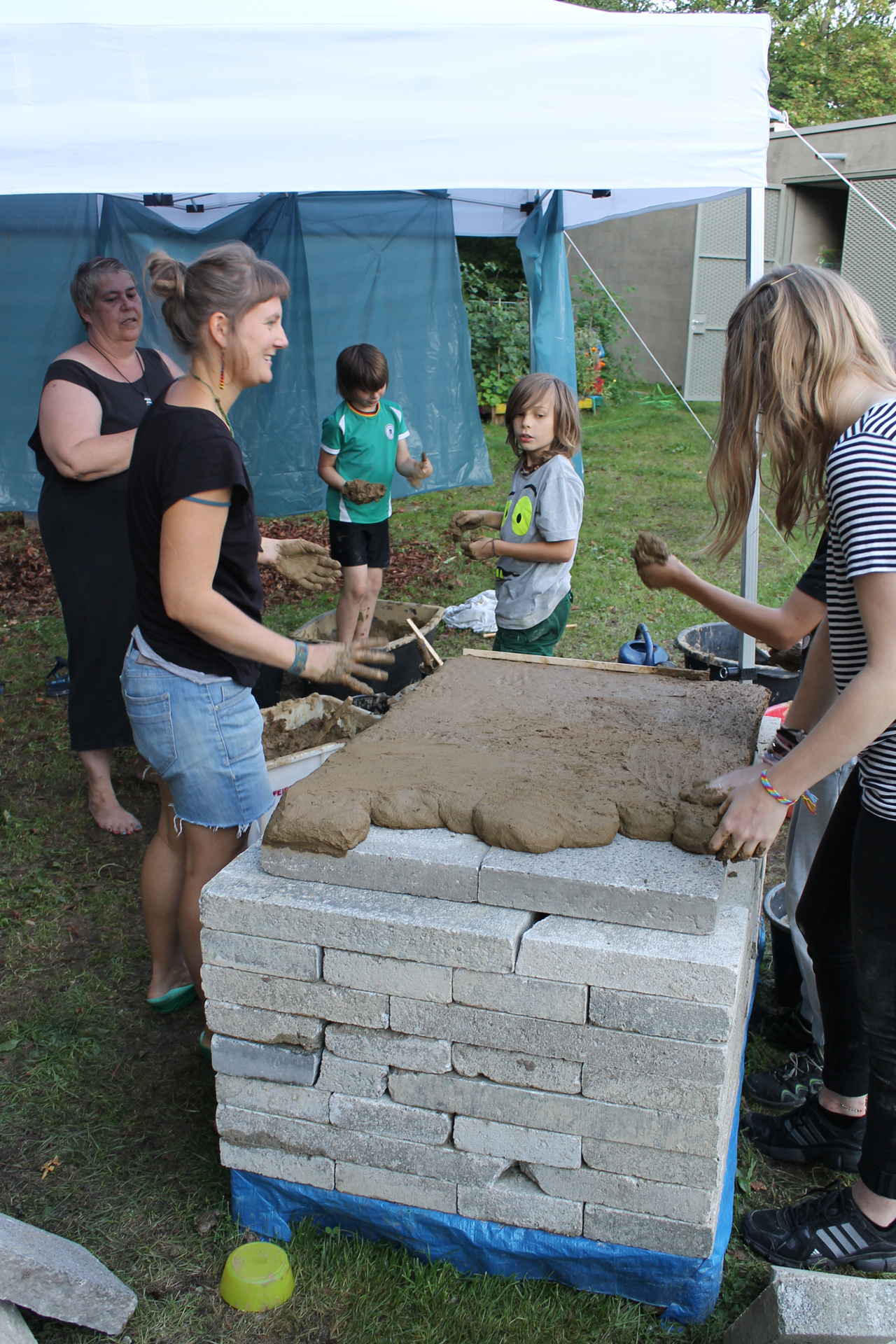 Steine für einen Sockel, eine riesen Menge Lehm, Sand, Stroh, ein Ofenrohr und ein Dach, damit der Ofen möglichst lange hält? Wir hatten Glück. Unser Projekt fiel genau in die Zeit, in der die Glasfaserleitungen in unserer Straße gelegt wurden. Und da lagen jede Menge kaputt gegangene Steine auf den Gehwegen. Also nichts wie hin und die Arbeiter fragen, ob wir die nicht benutzen könnten. Und tatsächlich. „Sie würden ja eh nur weggeschmissen“ war die Antwort. Den Lehm bekamen wir von der Schule, an der Susanne ihren letzten Lehmofen gebaut hatte, geschenkt. Und Andreas baute uns ein kleines Häuschen. So waren unsere Grundmaterialien schon einmal organisiert. Einen großen Dank an dieser Stelle an alle! Wir konnten beginnen.