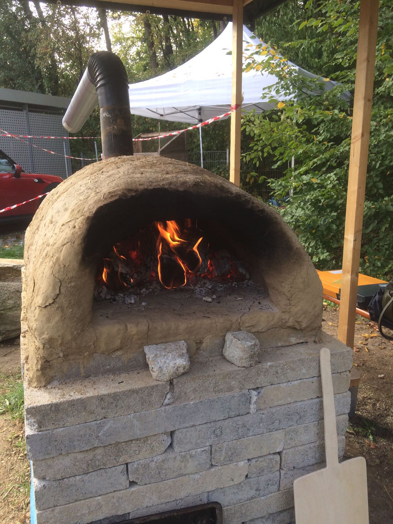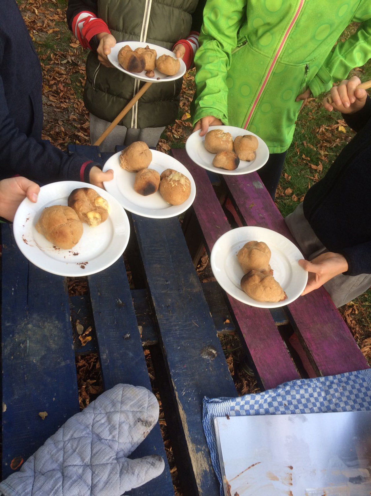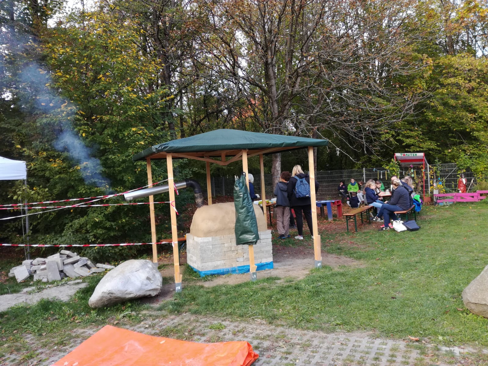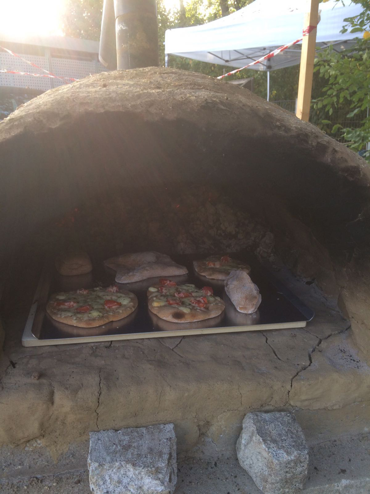 Nach ca. 3 Wochen kräftigem Durchtrocknen hatte er ein paar kleine Risse bekommen. Aber das ist ganz normal, wie wir lernten. Die flickten wir noch mit etwas Schlick und fertig war er! Raus mit dem Sand und rein mit dem Brot. Nach einem Tag Sand schaufeln und Ofenauskehren weihten wir ihn am Wochenende drauf mit allen Nachbarsfamilien und Helferkindern am 20.10.2018 ein. Es gab ganz wunderbare, selbstgebackene salzig und süß belegte und gefüllte Brötchen.