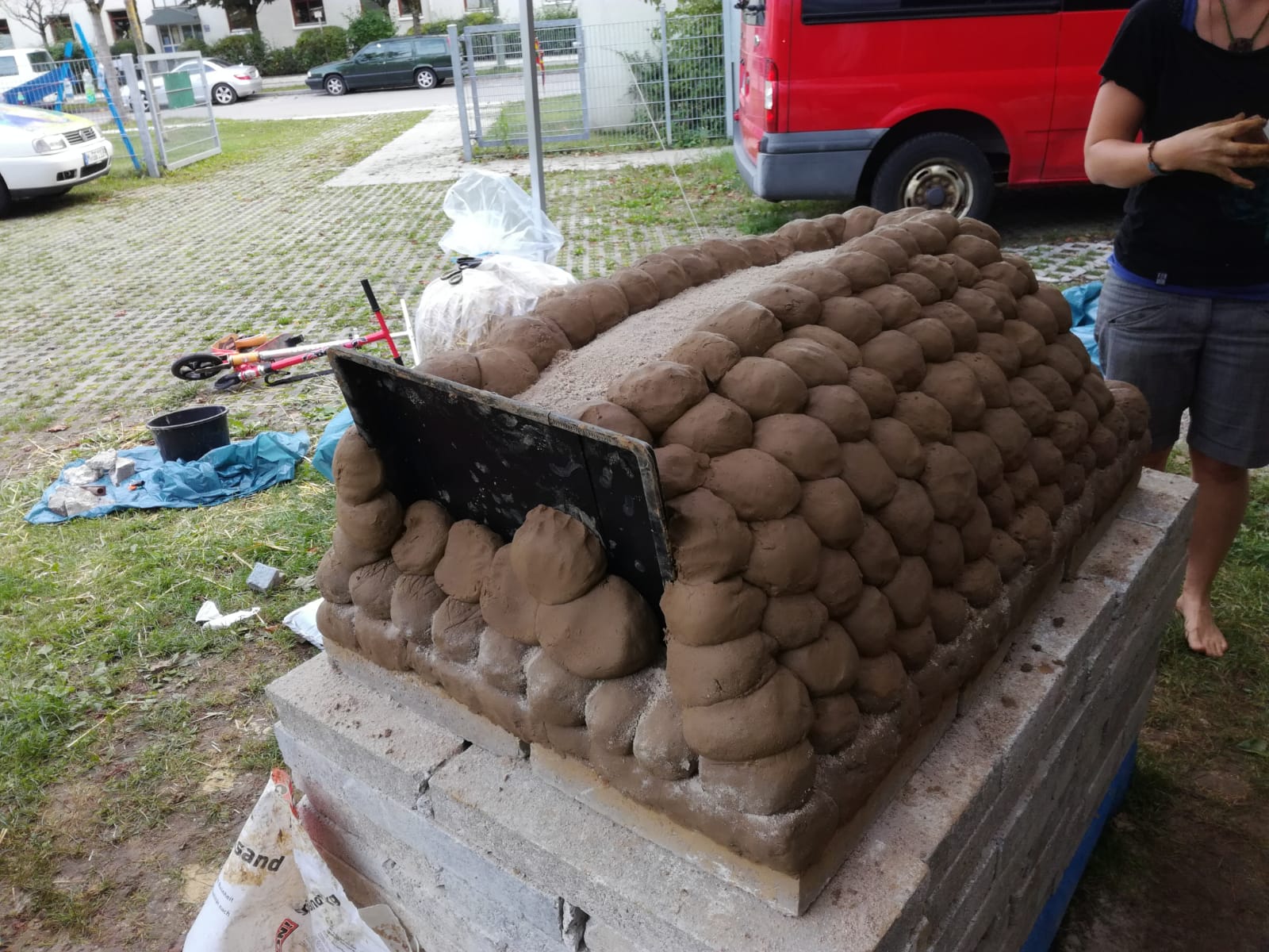 Anfang des Jahres kamen wir in der Feierwerk Südpolstation auf die Idee, wenn wir schon das Thema Lehm/Ton in der Werkstatt anbieten, könnten wir doch auch versuchen, einen richtigen Backofen aus Lehm in unseren Garten zu bauen. Es wurde erst auch unter uns Kollegen etwas gezweifelt, ob sowas machbar ist und vor allem die Frage gestellt: Wie lange hält das? Das hat mich noch mehr angespornt, die Idee wirklich in die Tat umzusetzen und so machte ich mich auf die Suche nach ExpertenInnen. Dabei stieß ich auf Susanne, die schon viele Lehmöfen in ihrem Leben an Schulen gebaut hat und mir über Ecken empfohlen wurde. Wir trafen uns und alles passte zwischen uns. Also machten wir einen Termin für den Start aus und los ging es.